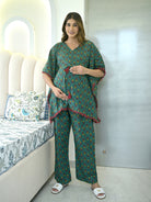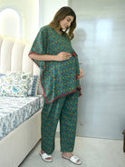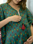 Bottle Green Printed Cotton Maternity Feeding Kaftan Night Suit