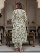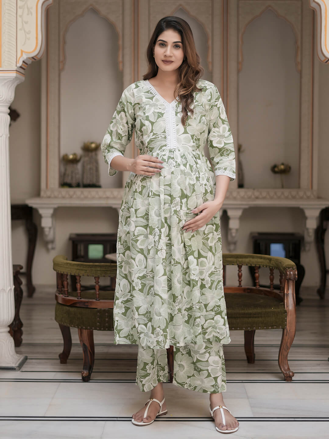 Sage Green Cotton Printed Maternity Feeding Flared Kurta Set