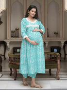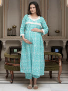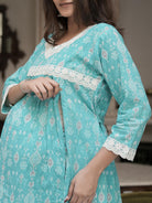 Turquoise Blue Cotton Printed Maternity Feeding Flared Kurta Set