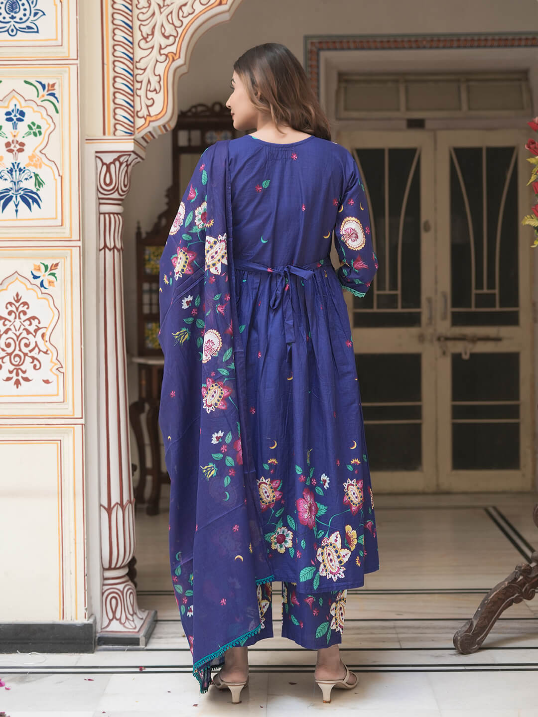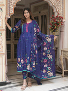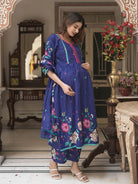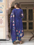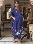 Royal Blue Cotton Printed Maternity Feeding Flared Kurta Set with Dupatta