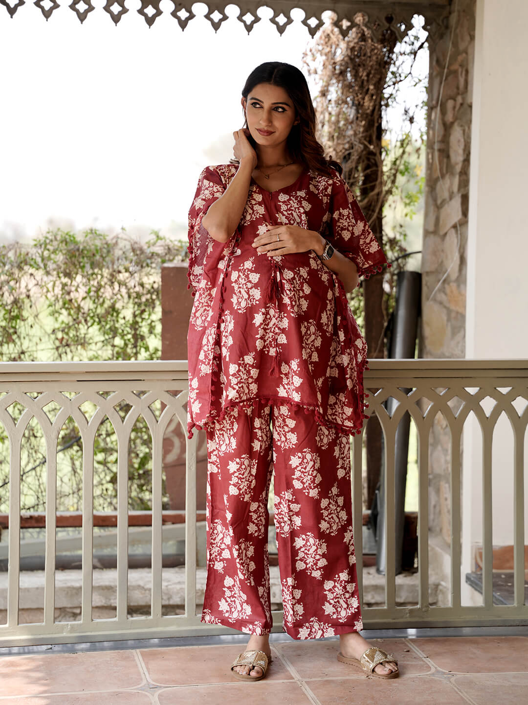 Maroon Printed Cotton Maternity Feeding-Friendly Kaftan Night Suit