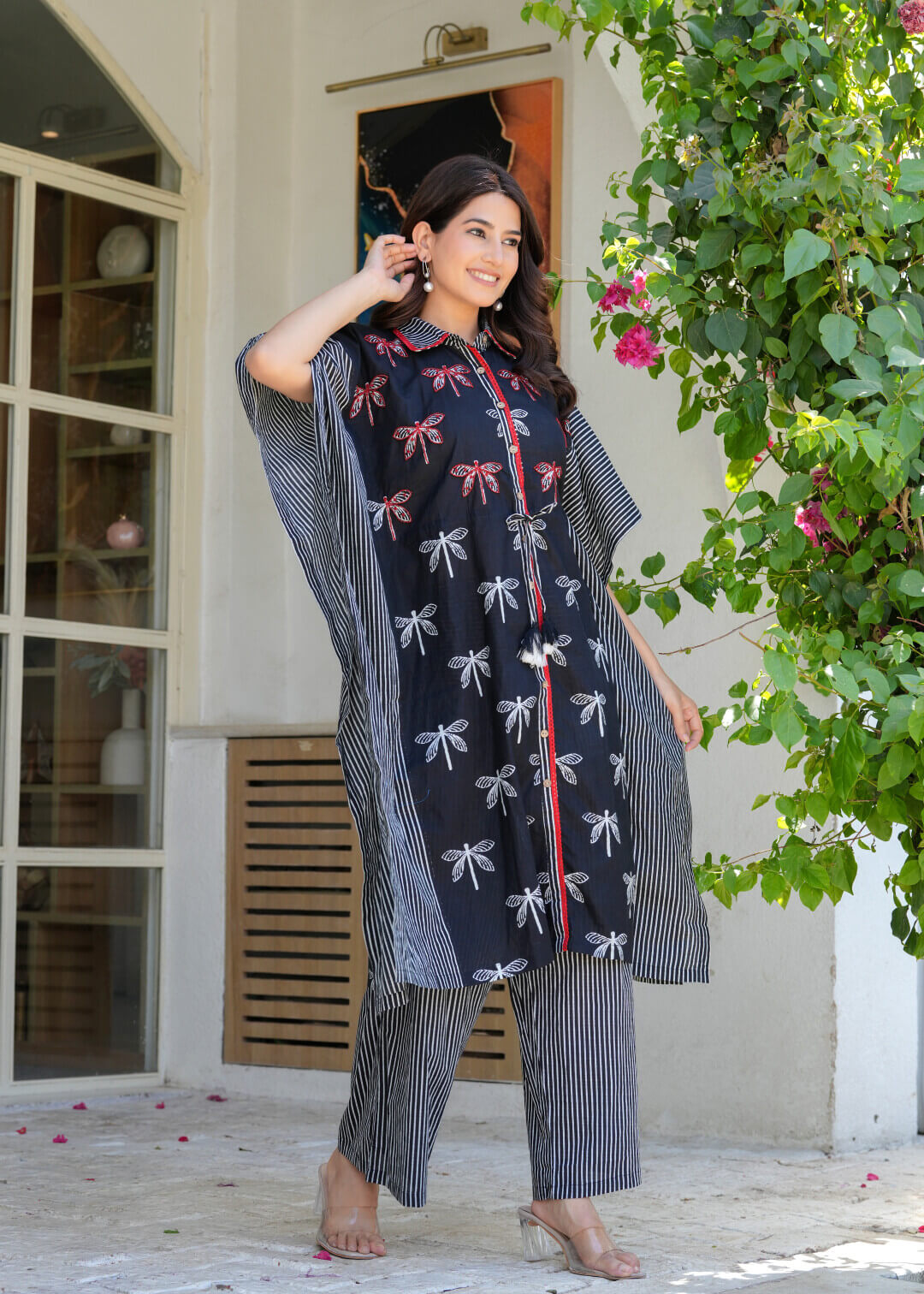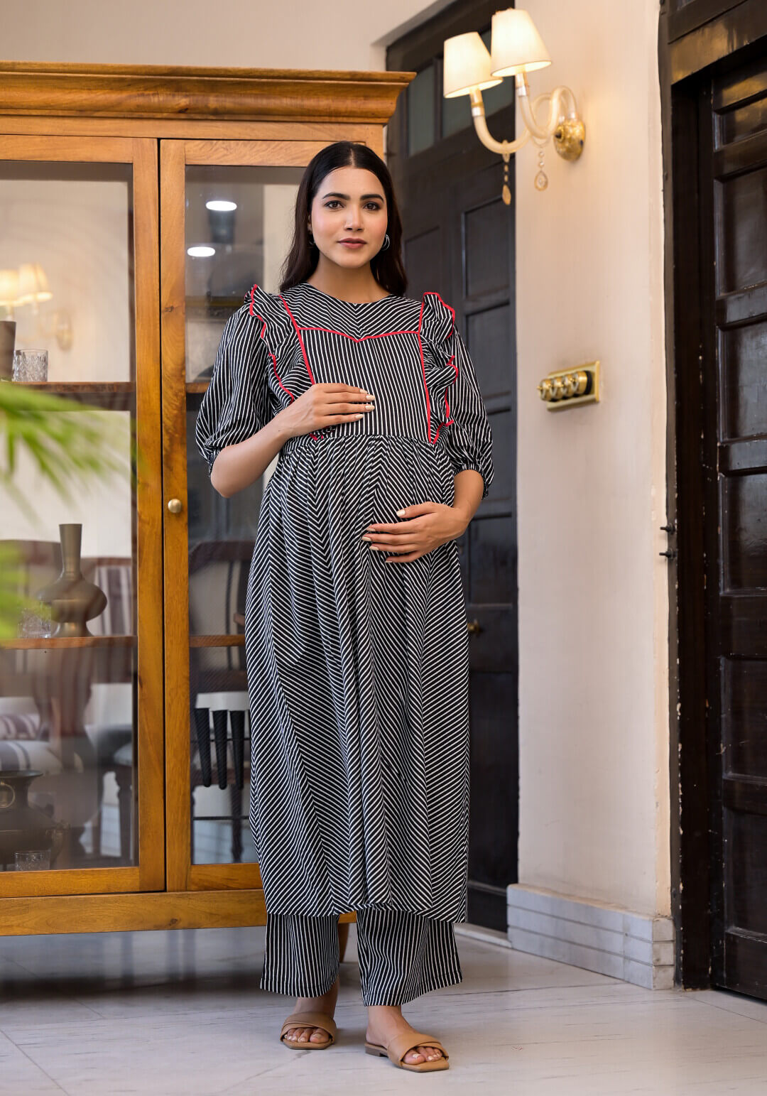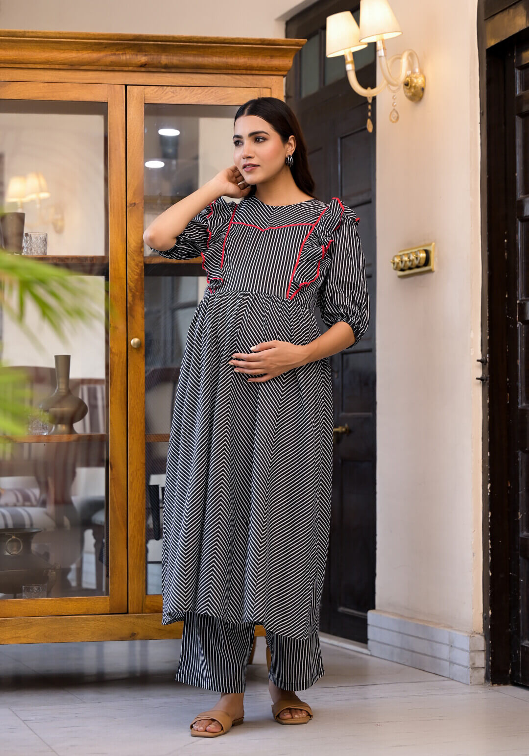 Black Cotton Printed Maternity Feeding Kaftan Kurta Set