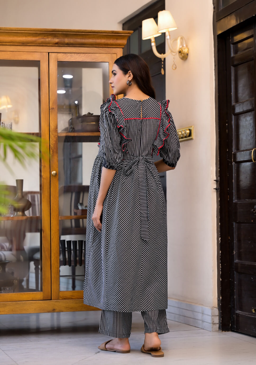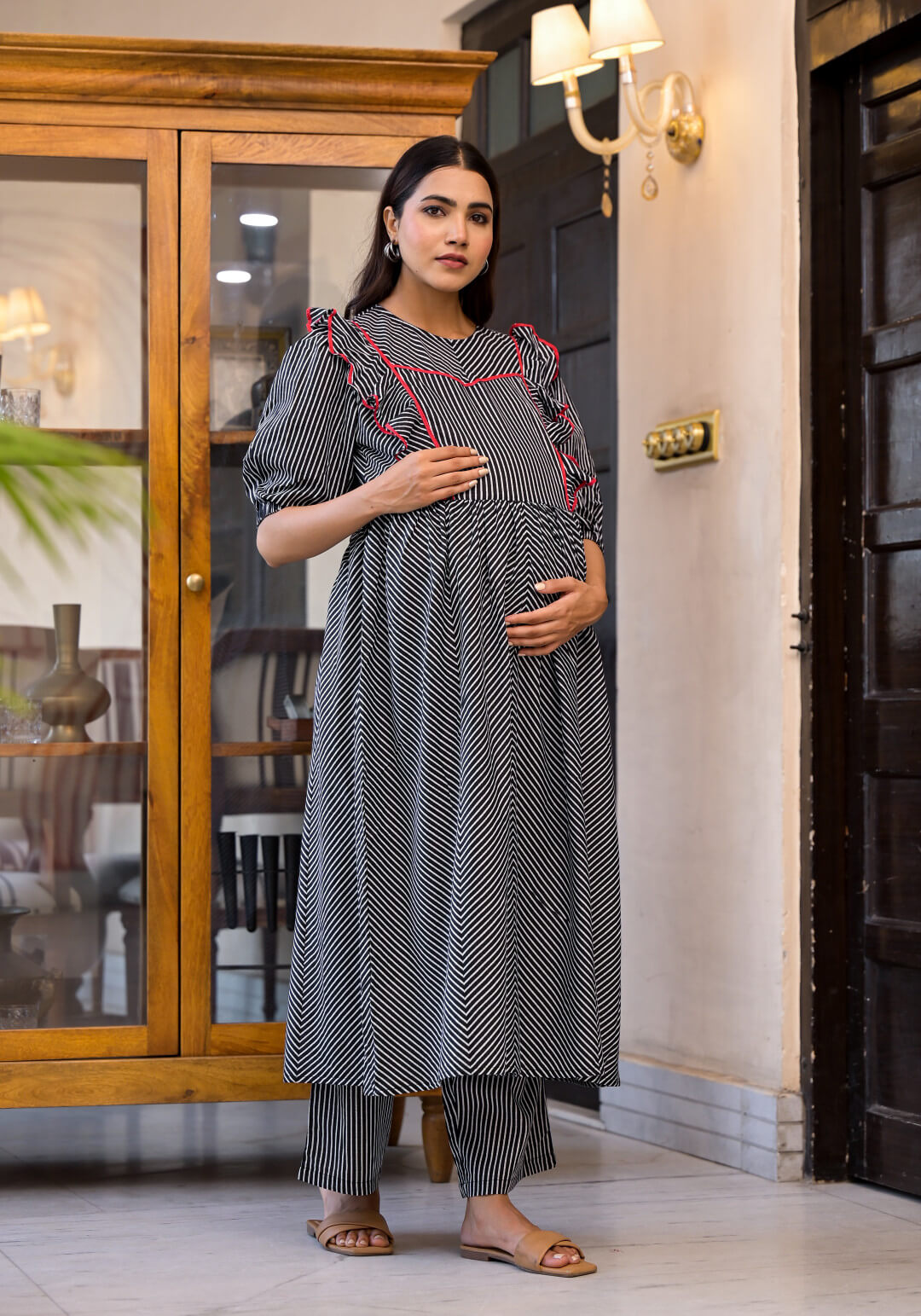 Black Cotton Printed Maternity Feeding Flared Kurta Set