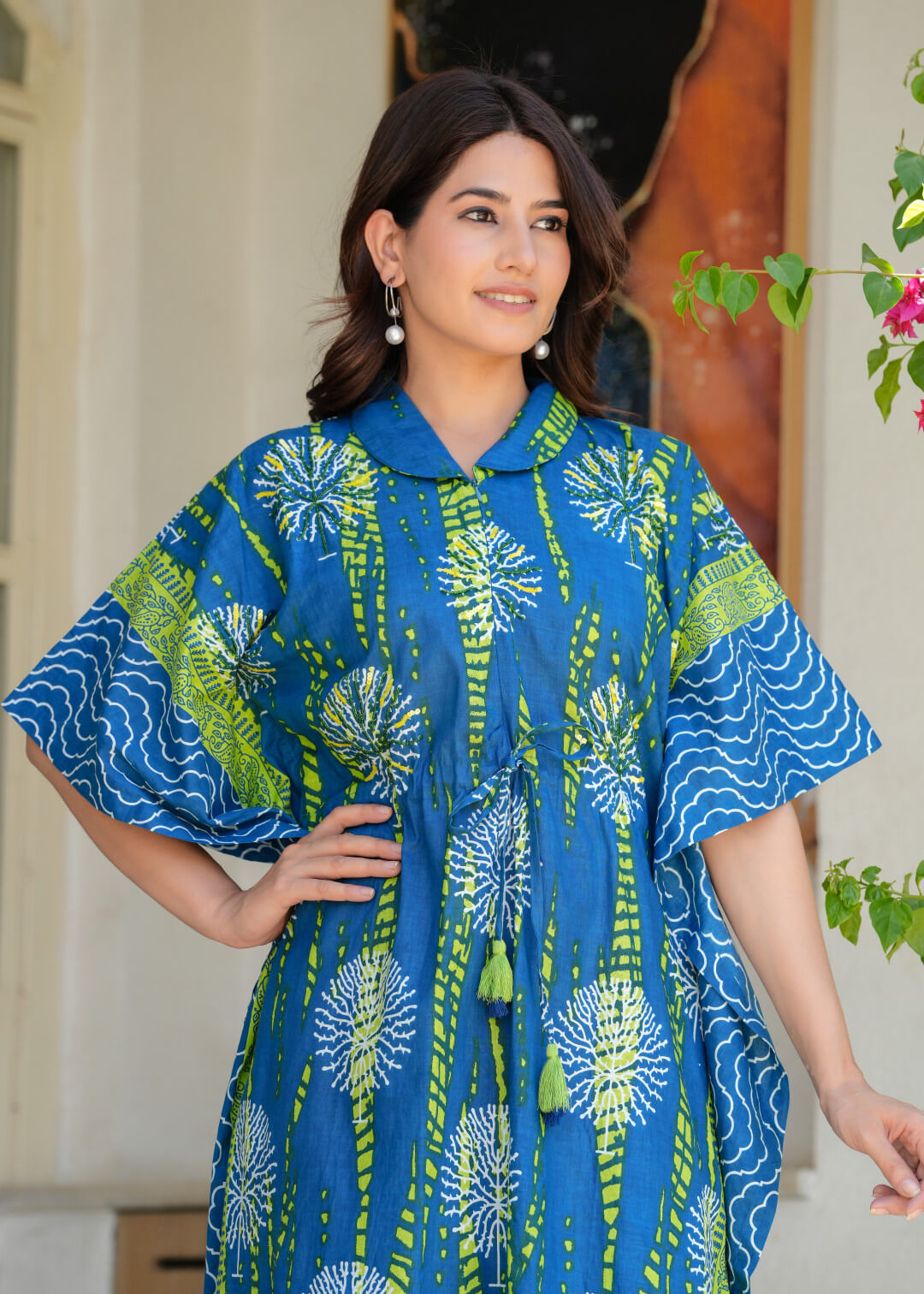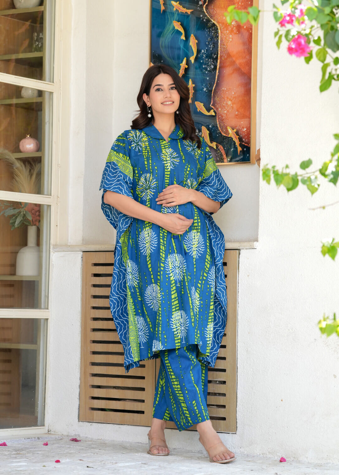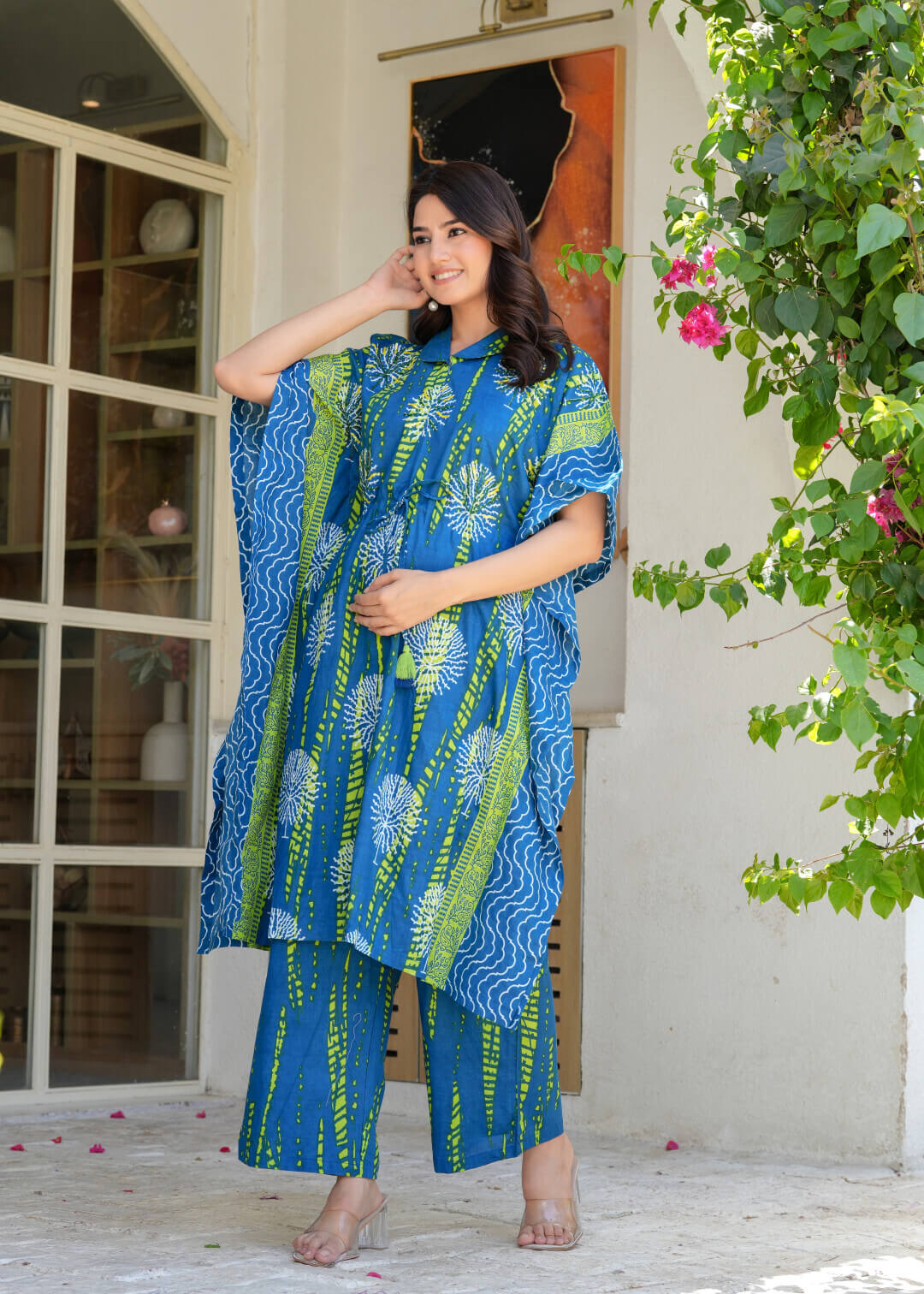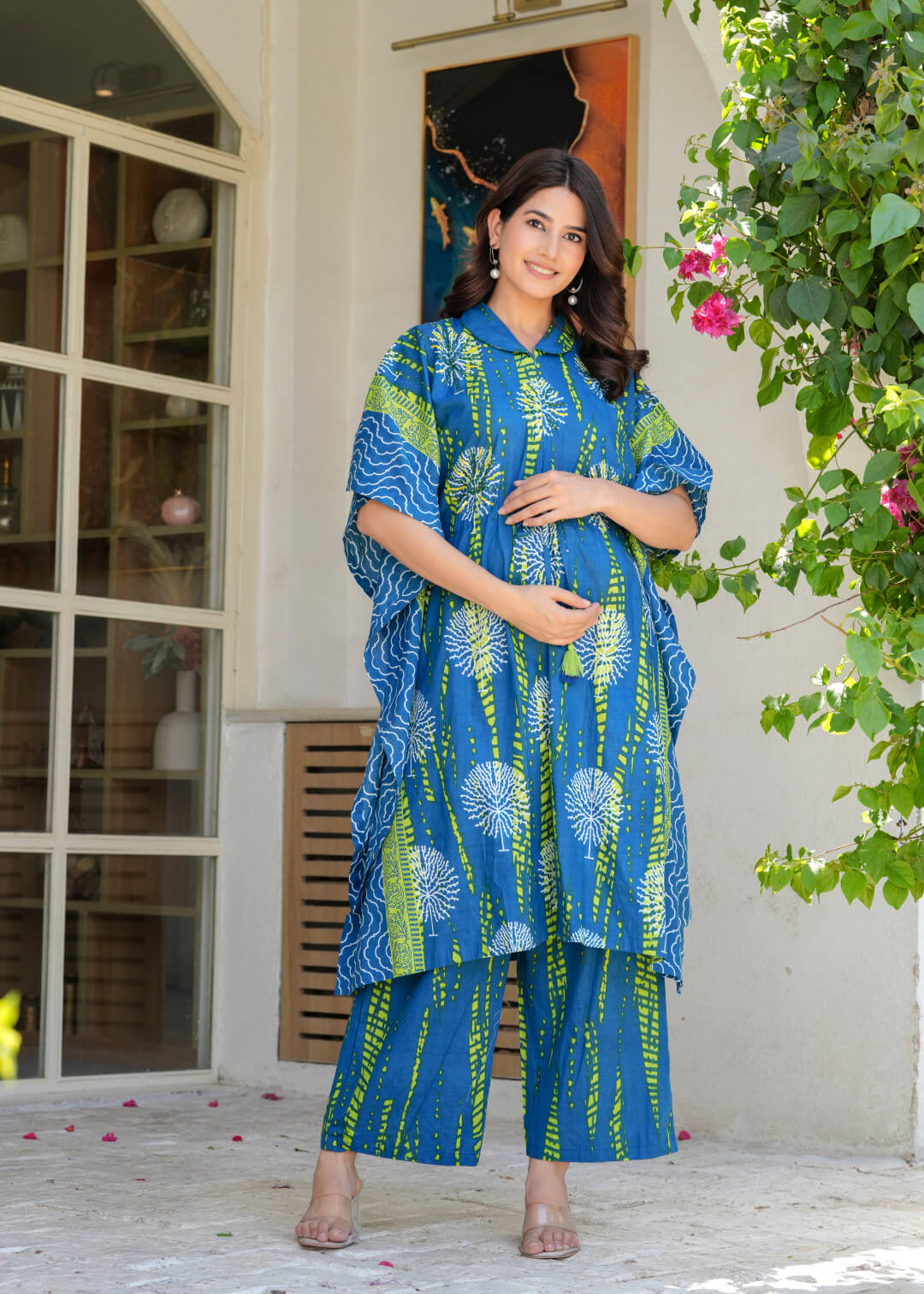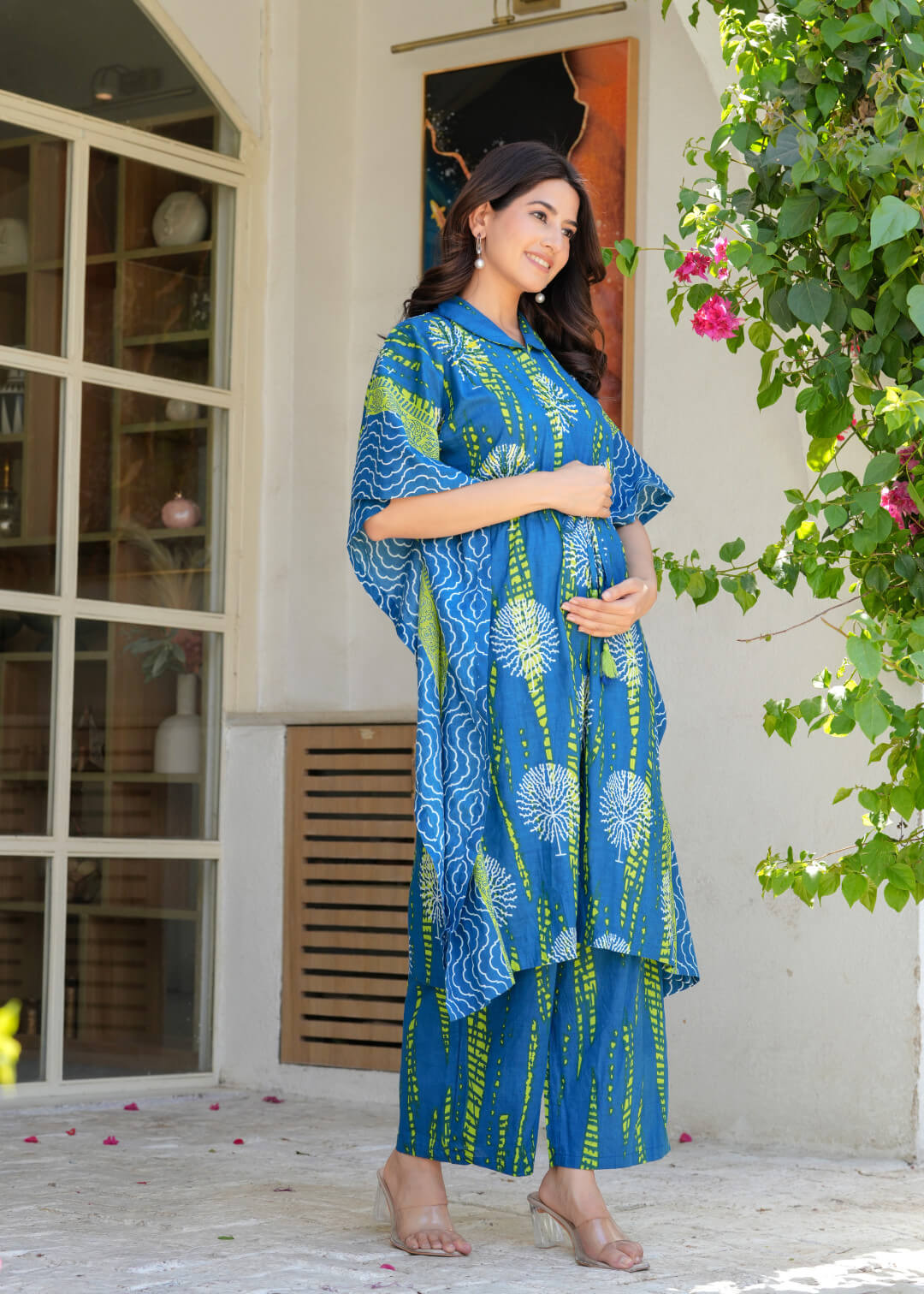 Batwing Sleeves Cotton Printed Maternity Front Zipper Feeding Kaftan - Indigo