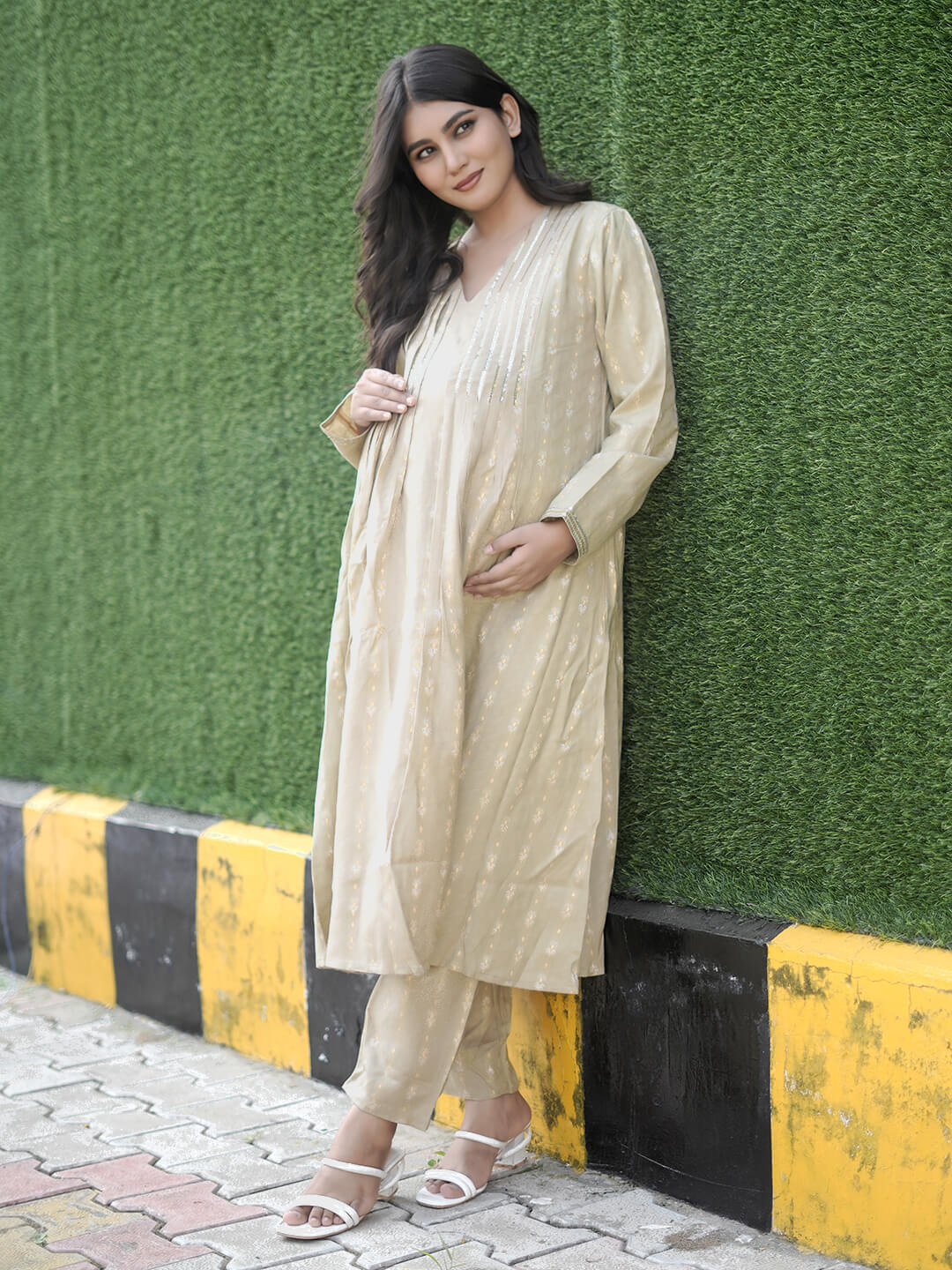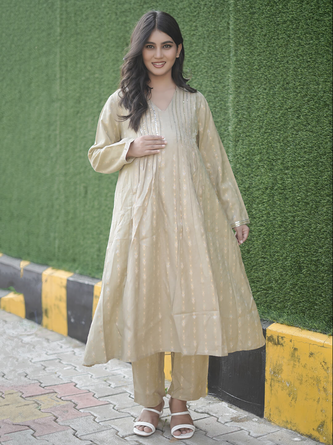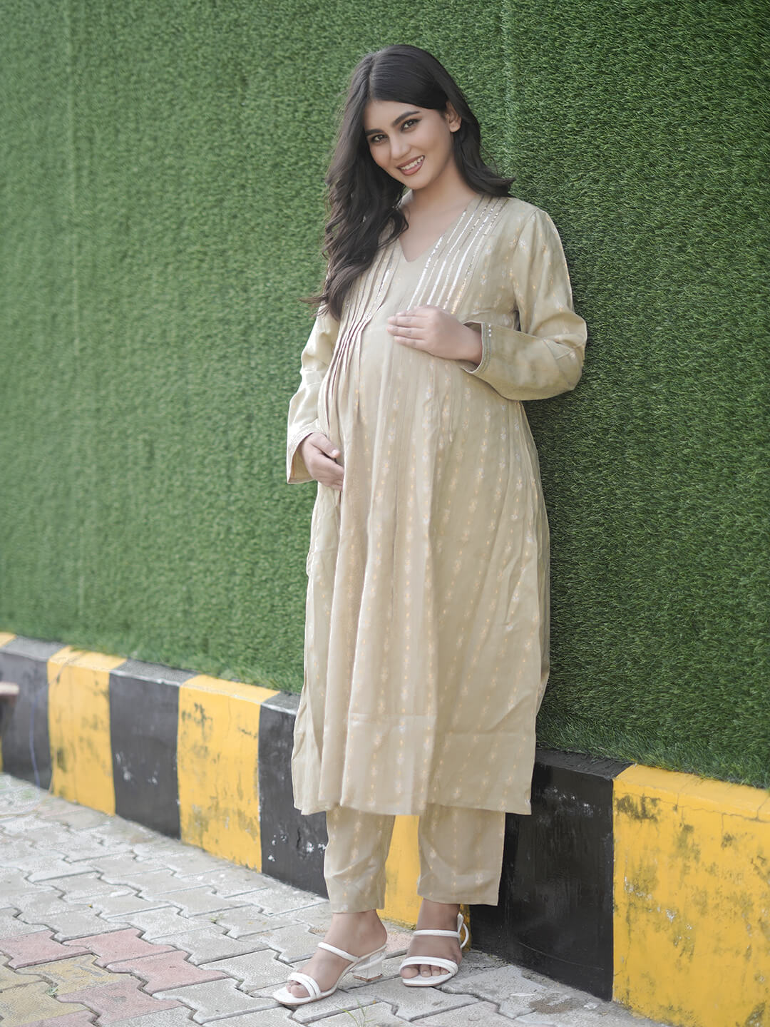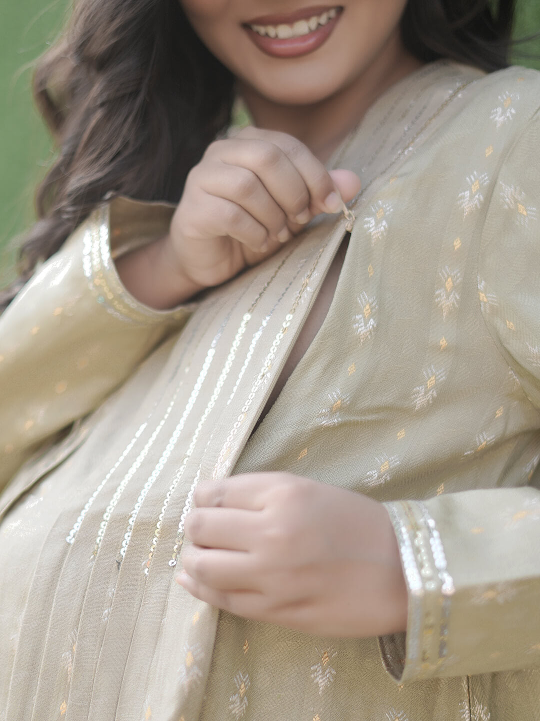 Beige Gold Woolen Zari Buti Maternity Feeding Flared Kurta Set