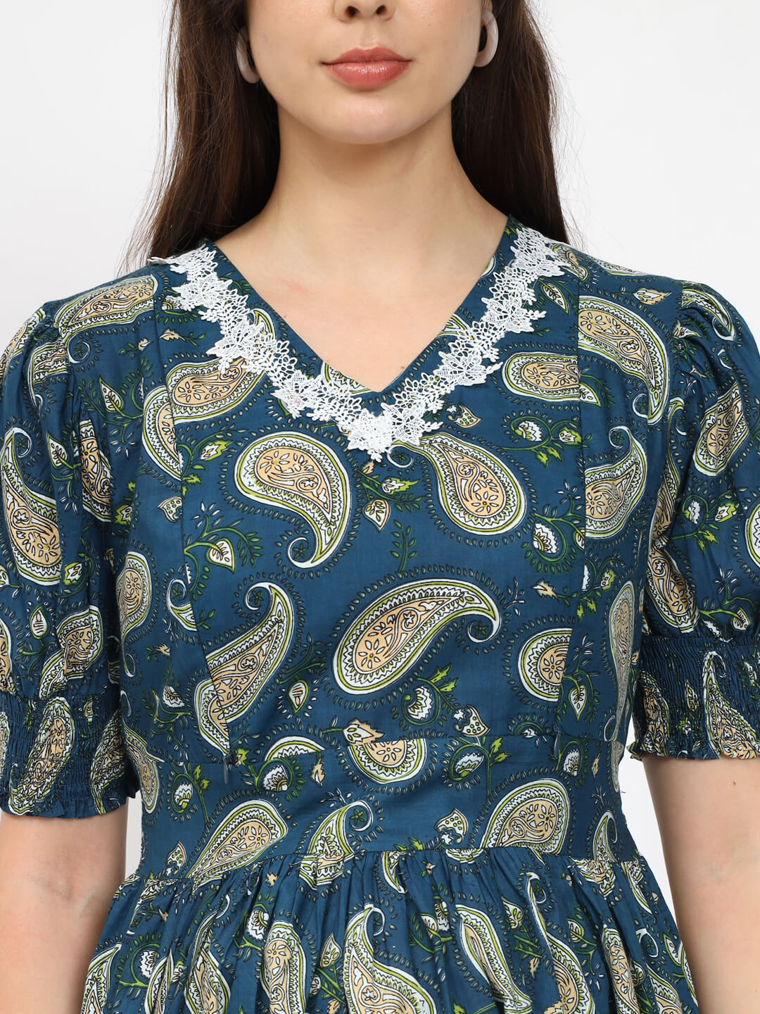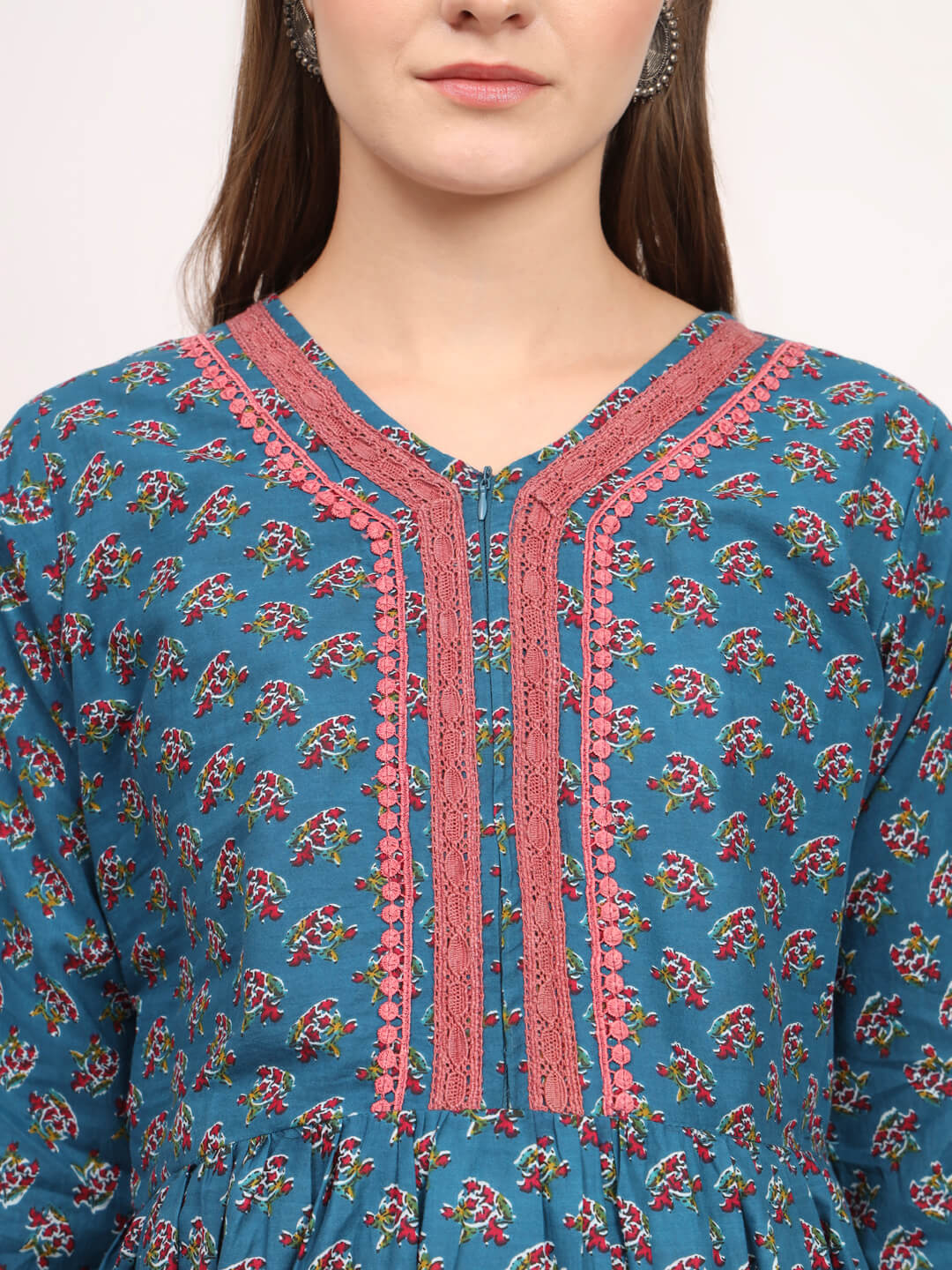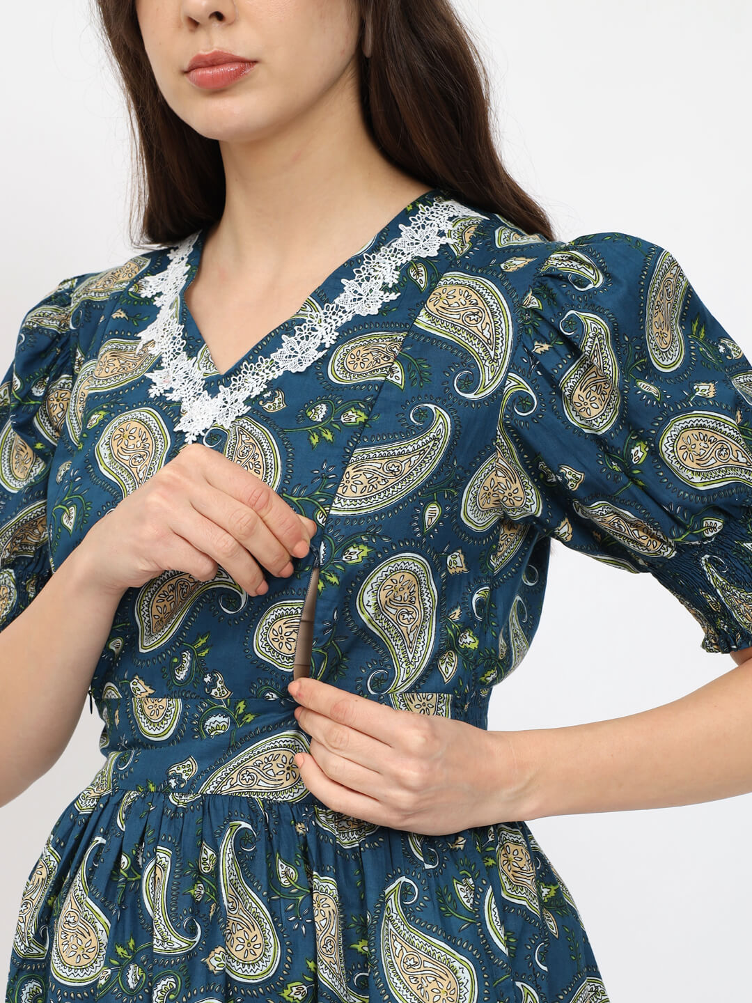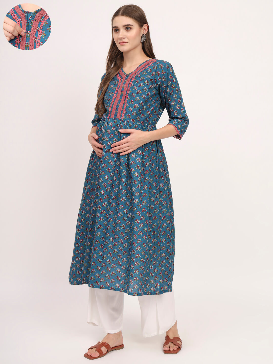 Teal Blue Cotton Printed Maternity Feeding Kurta