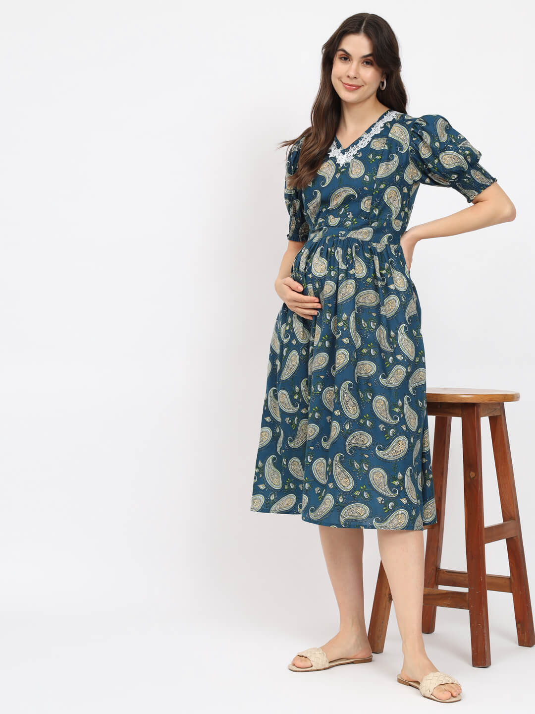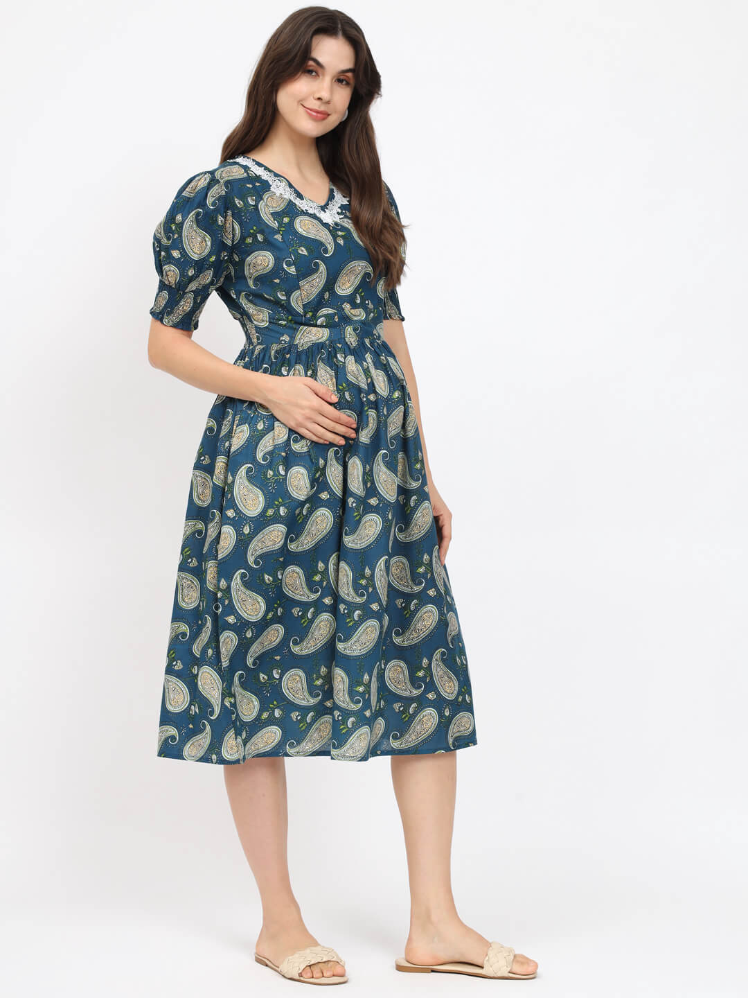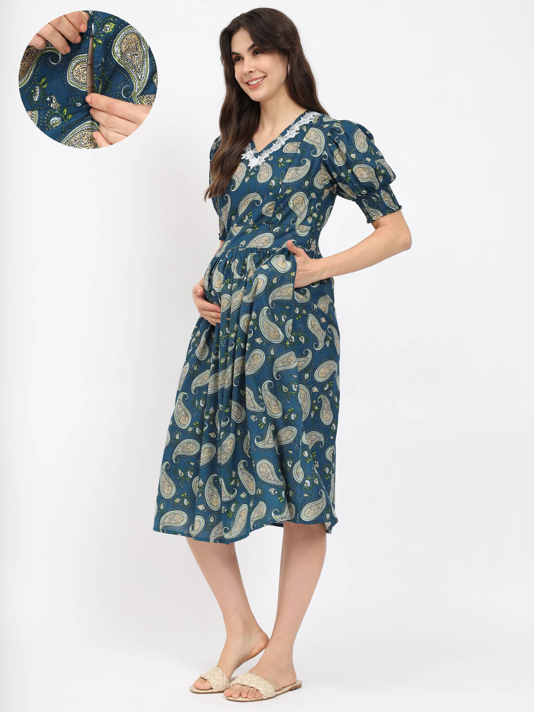 Teal Blue Printed Maternity Feeding Flared Dress