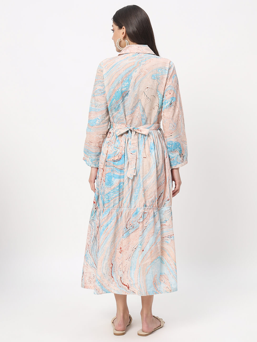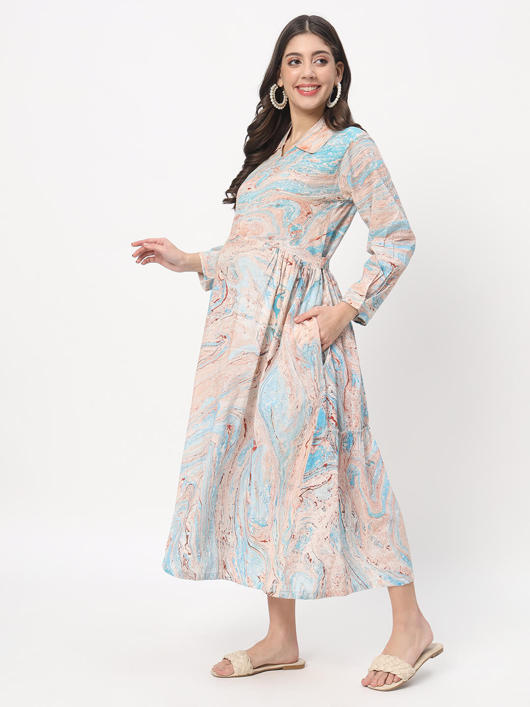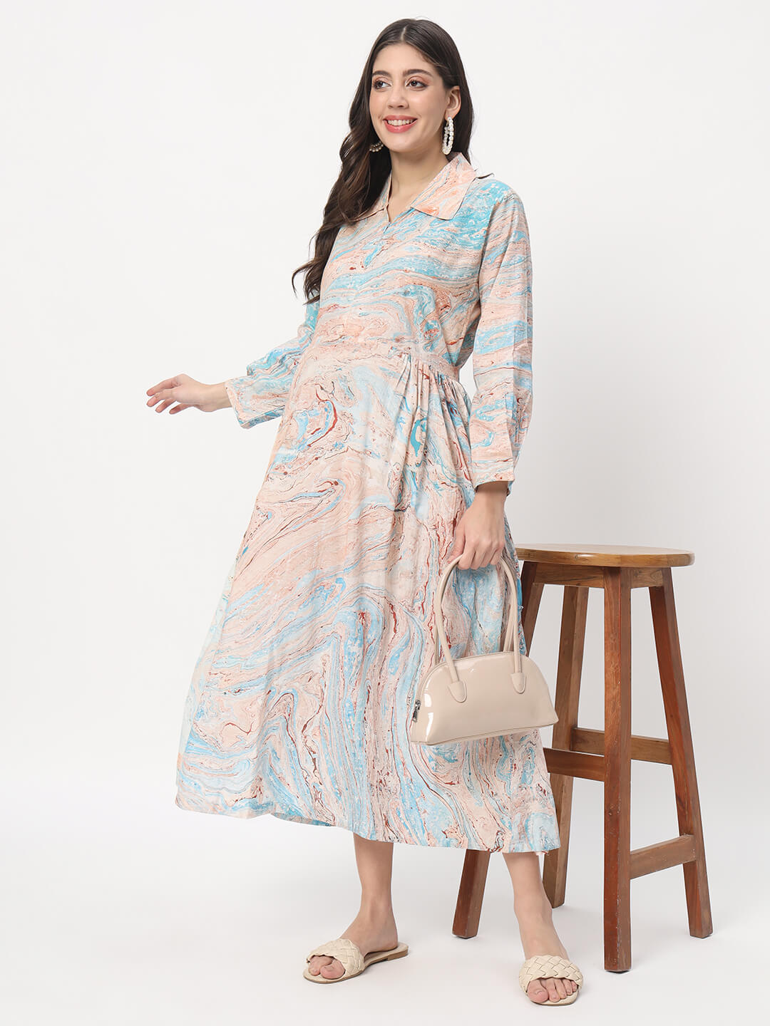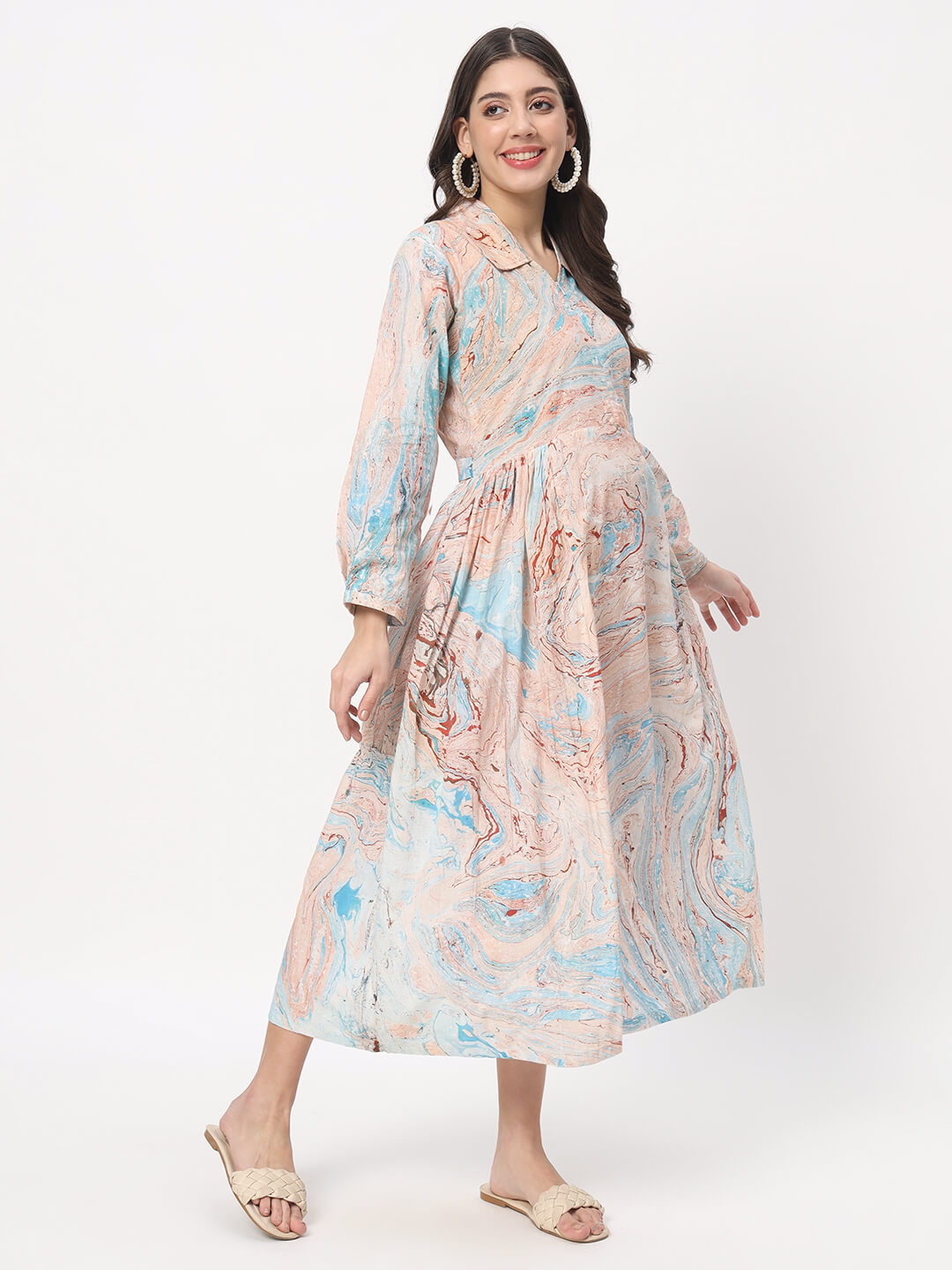 Turquoise Brown Marble Hand Printed Maternity Feeding Flared Dress