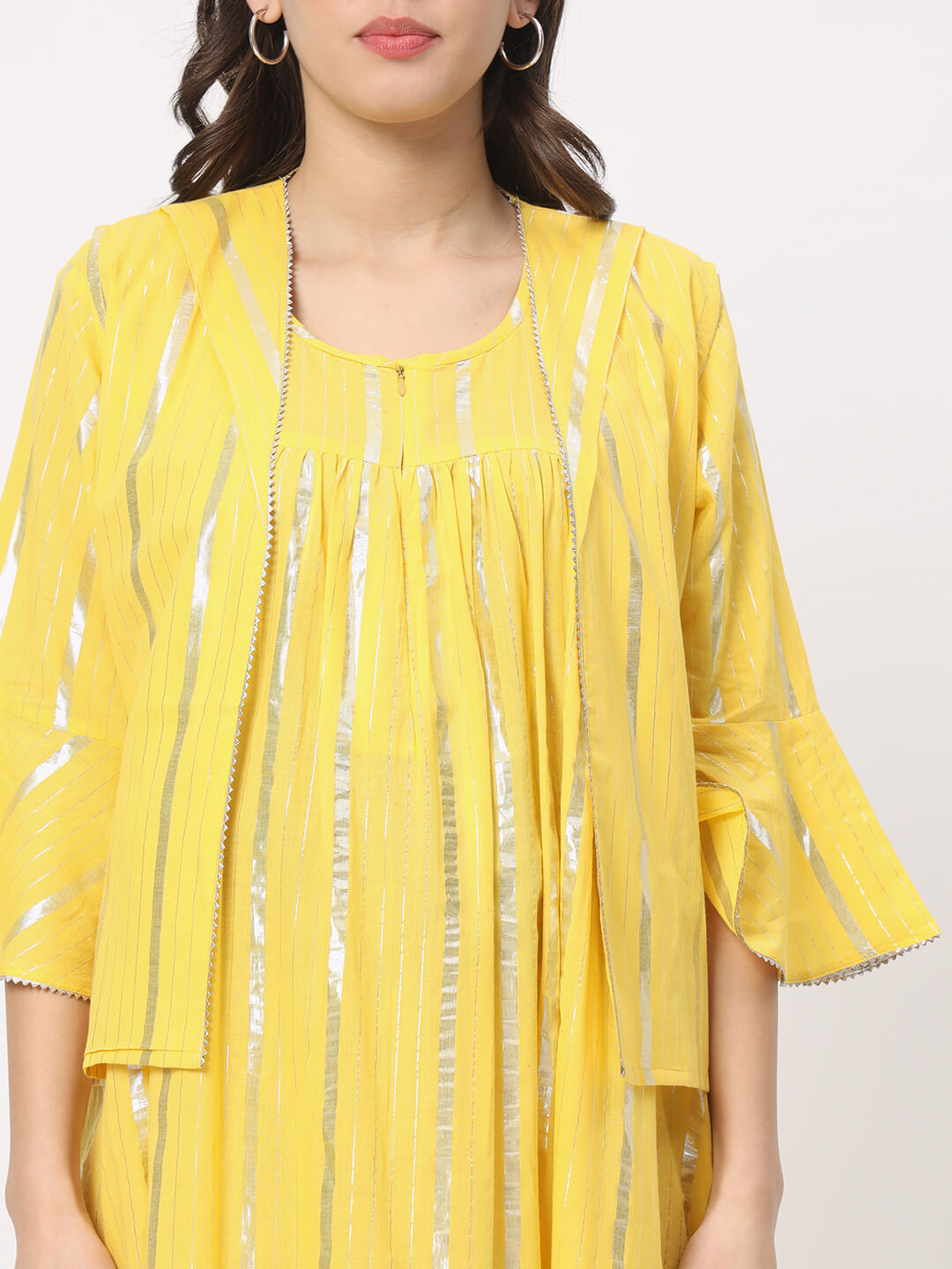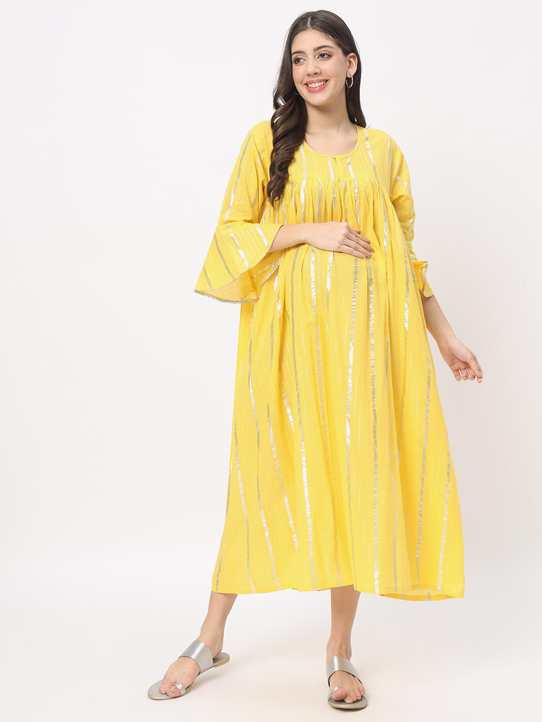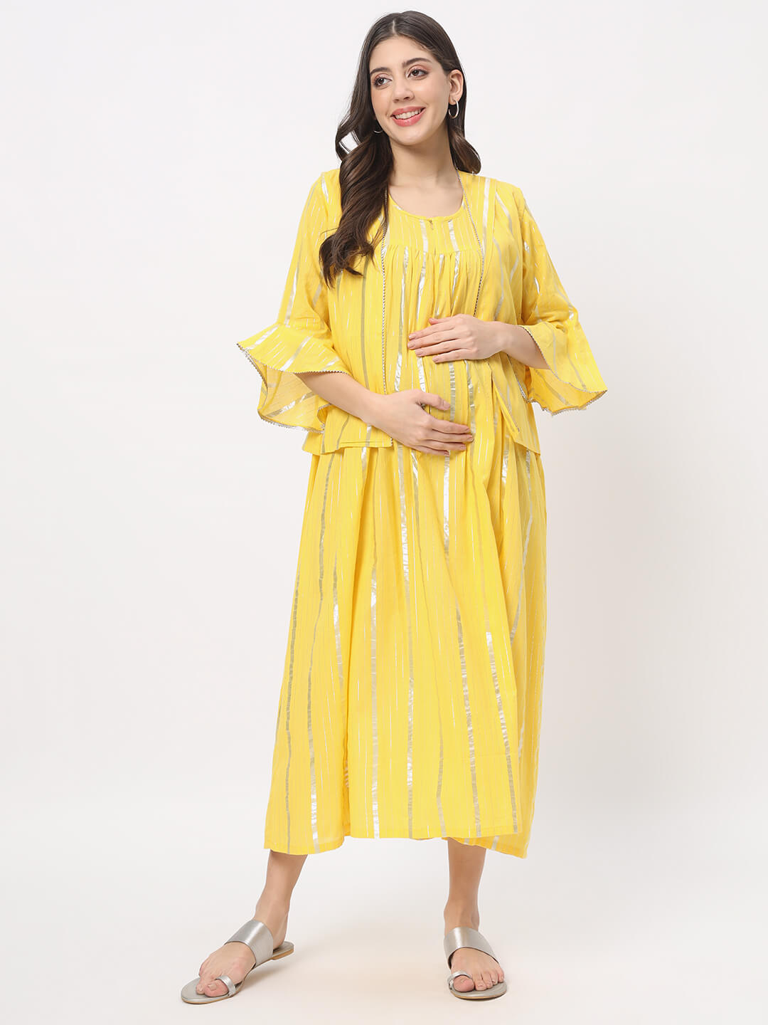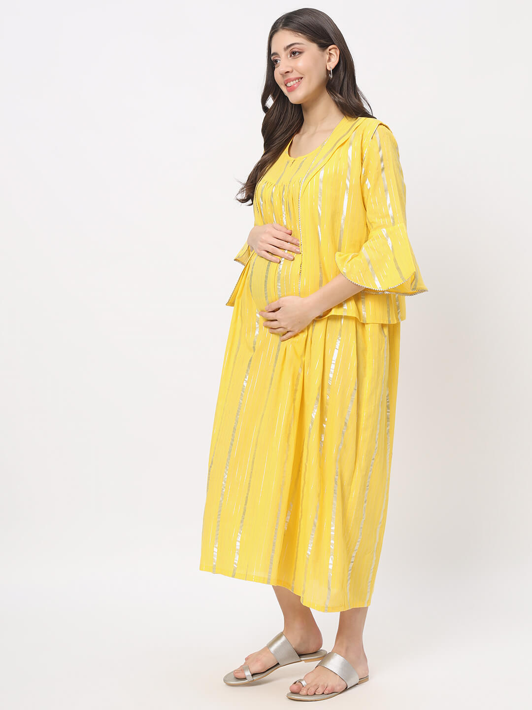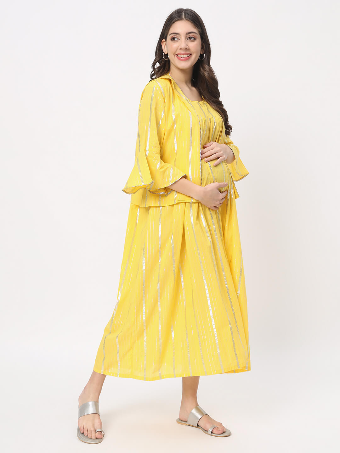 Yellow Cotton Maternity Feeding Flared Jacket Dress