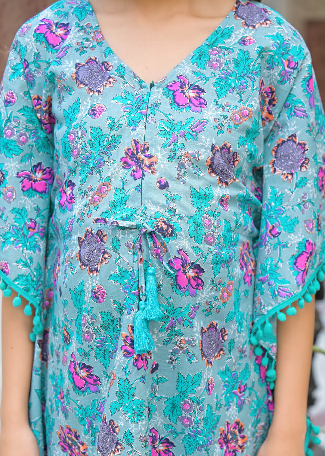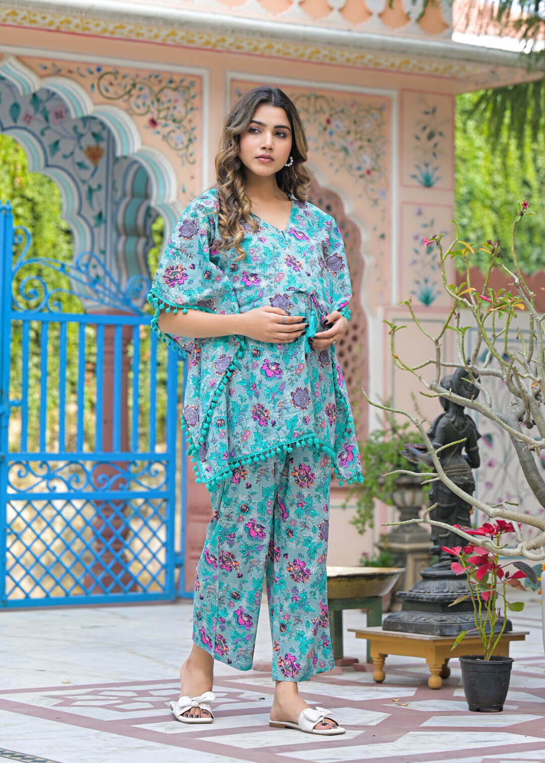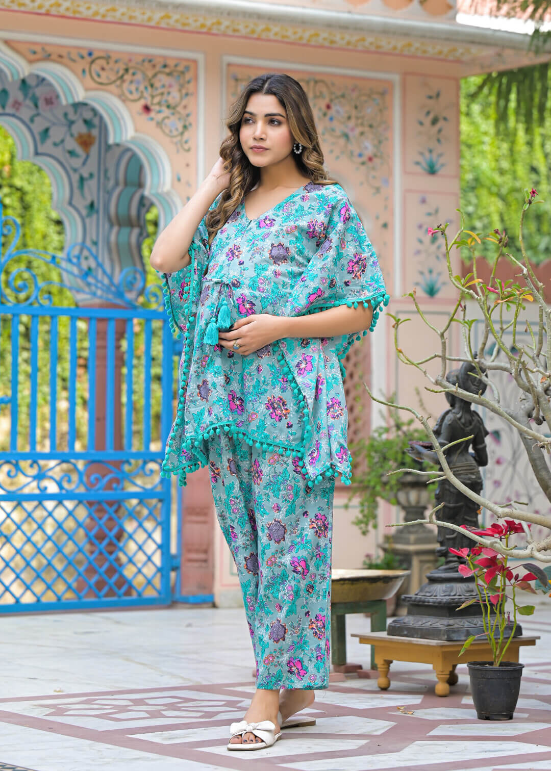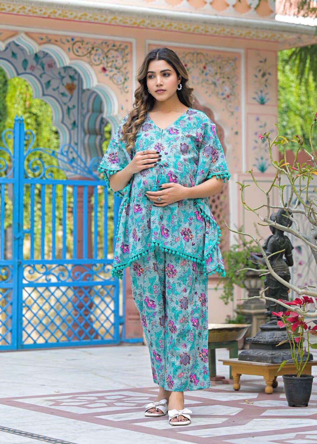Turquoise Cotton Printed Maternity Feeding Kaftan Kurta Set