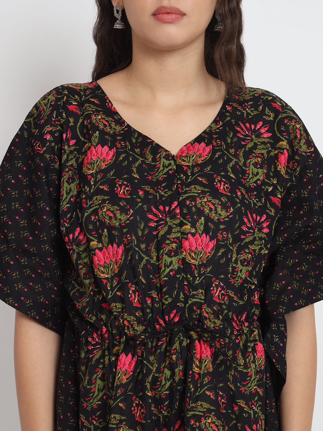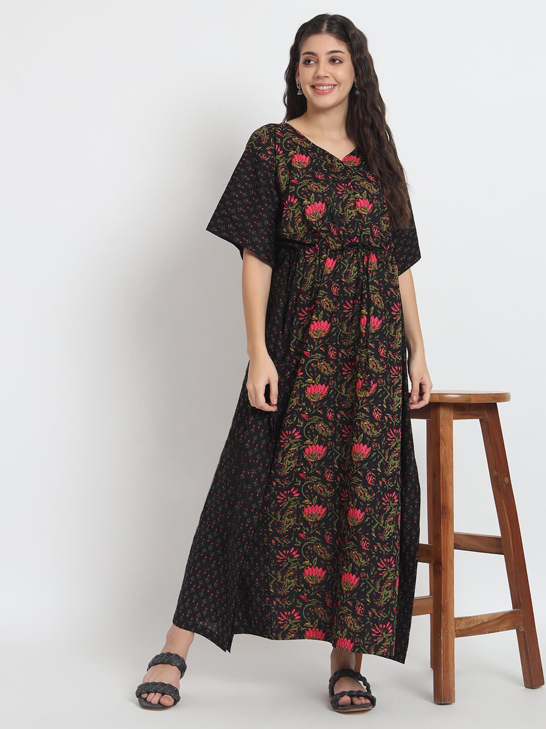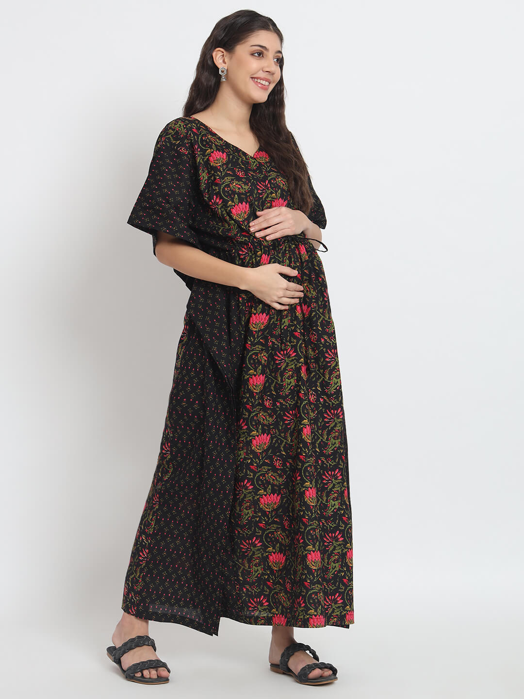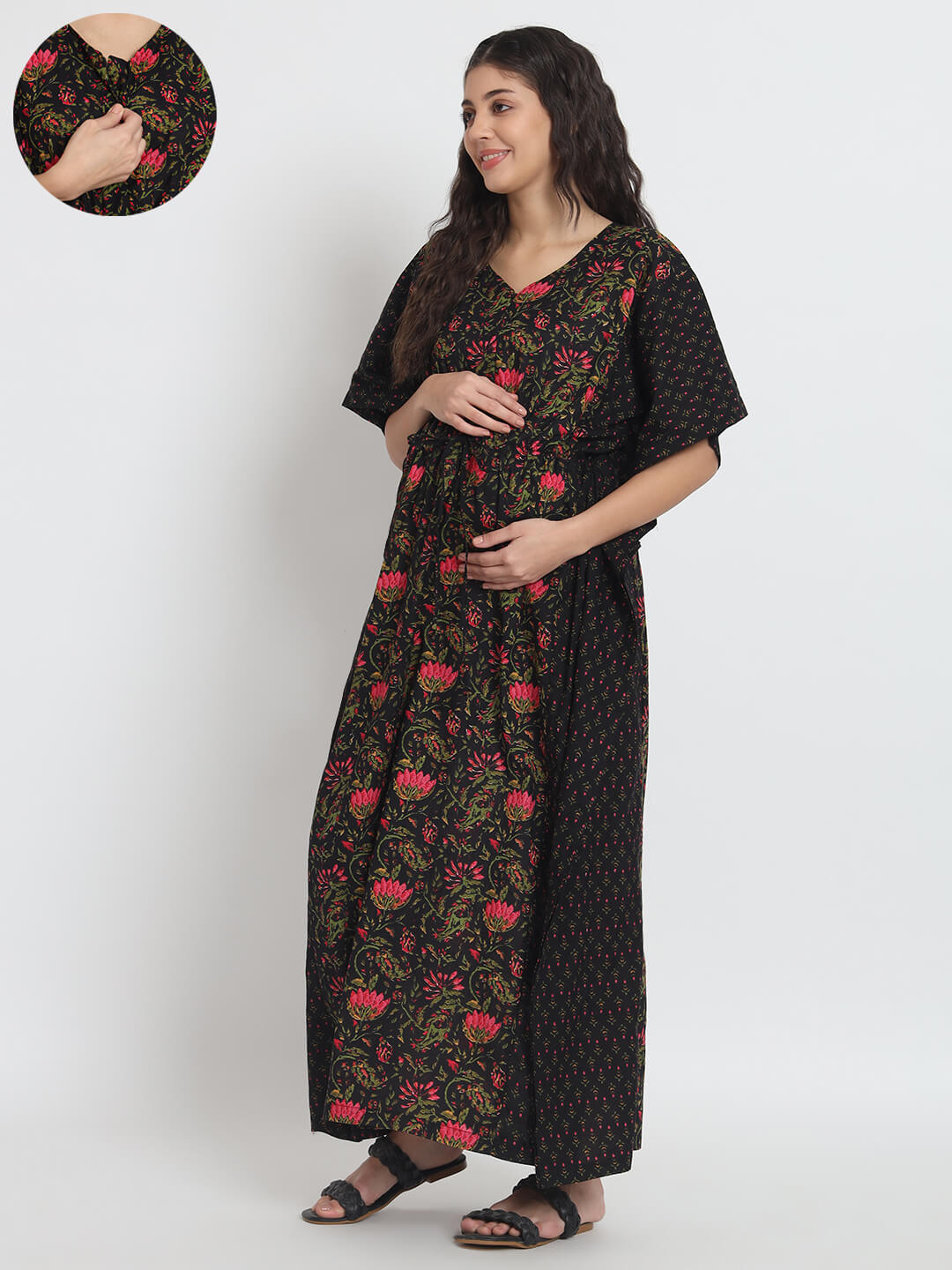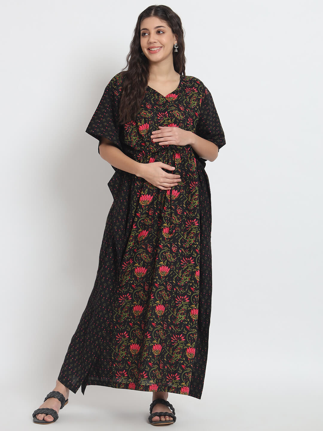 Black Printed Cotton Maternity Feeding Kaftan Night Suit
