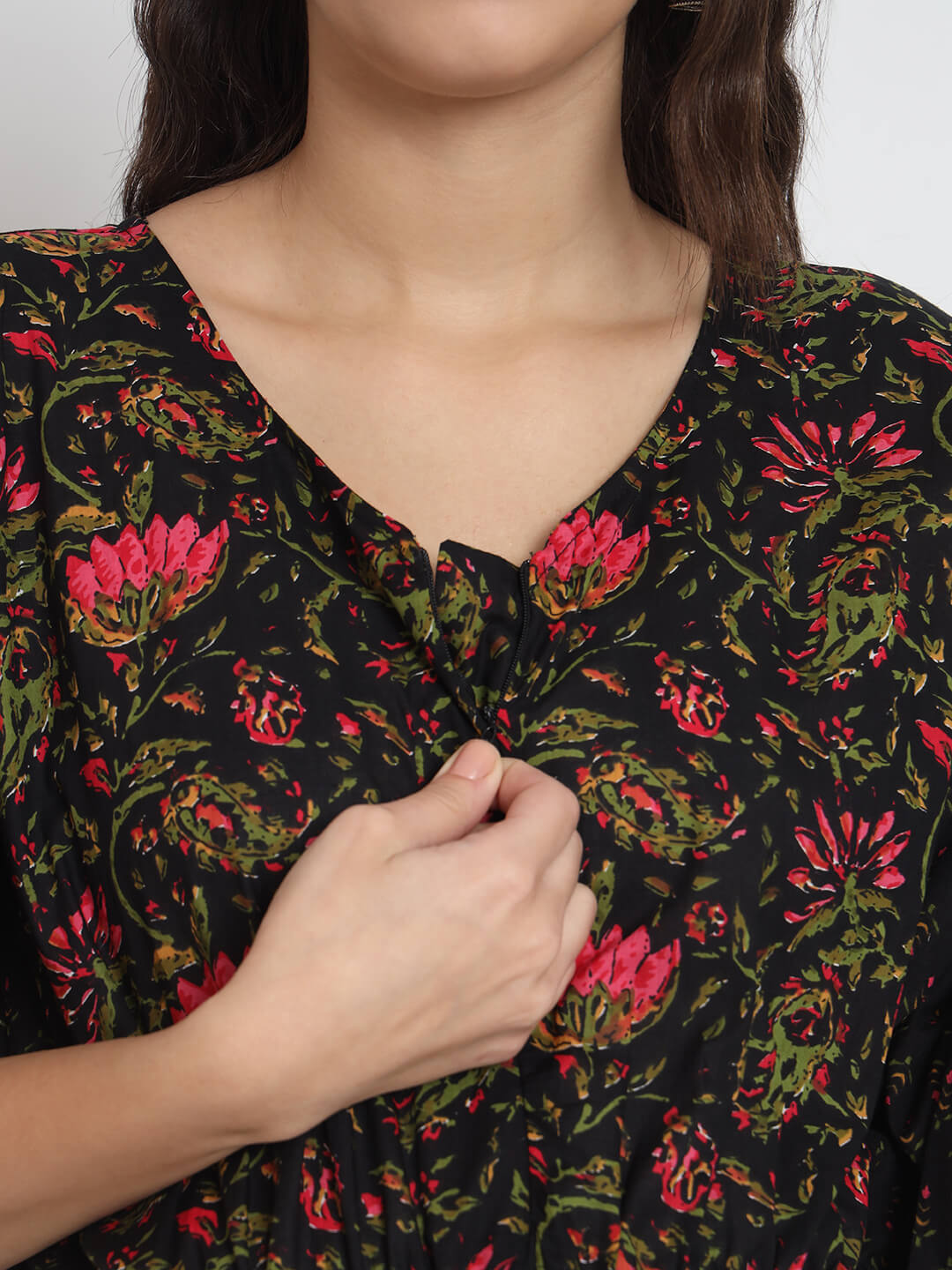 Black Maroon Printed Front Zipper Maternity Feeding Kaftan