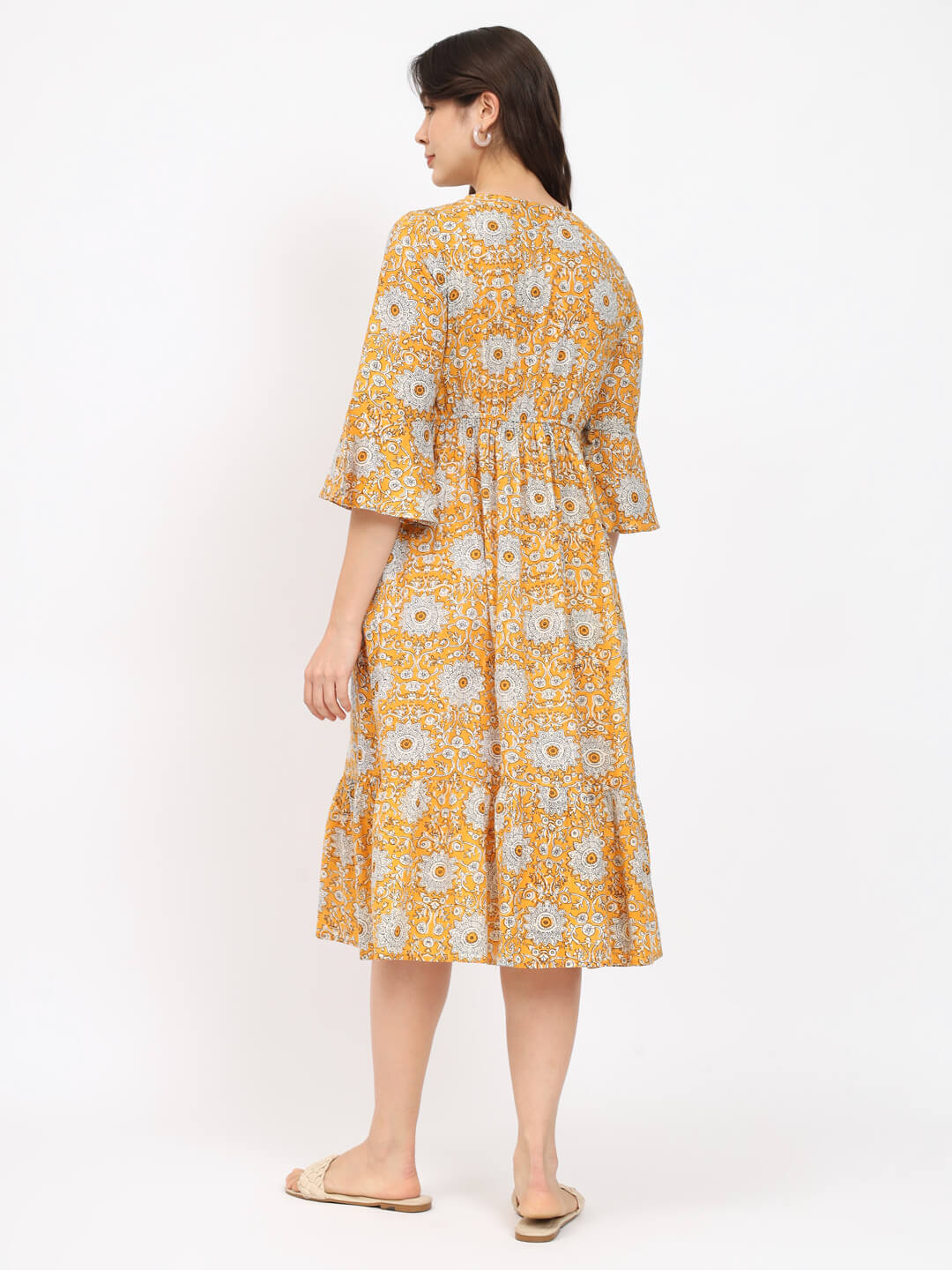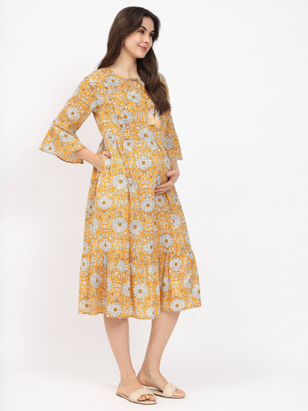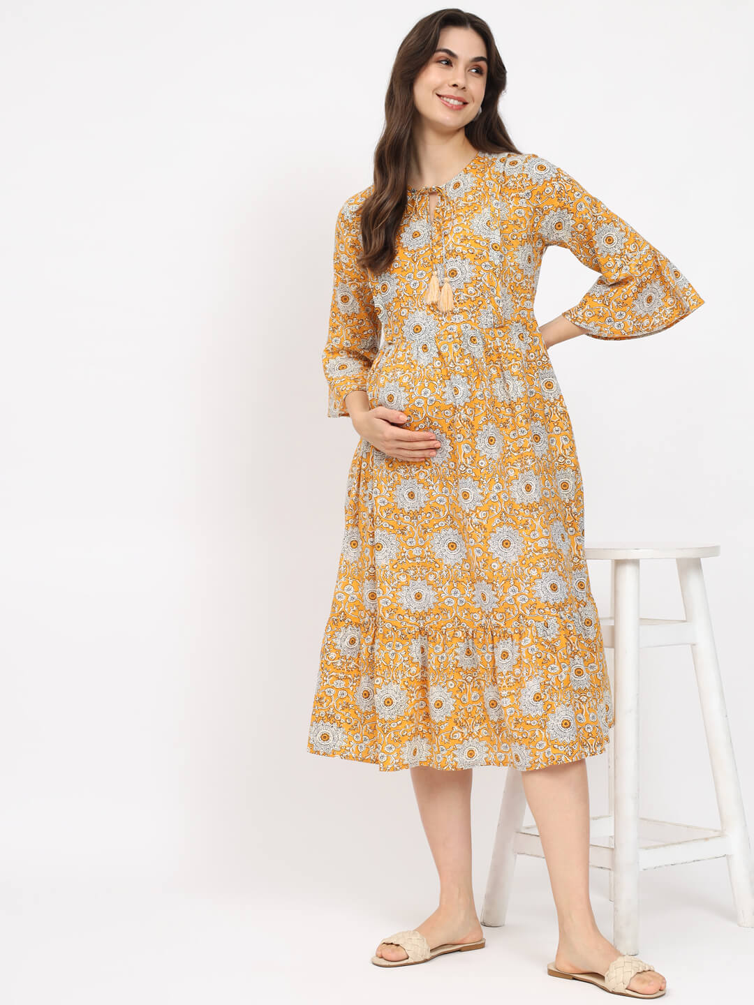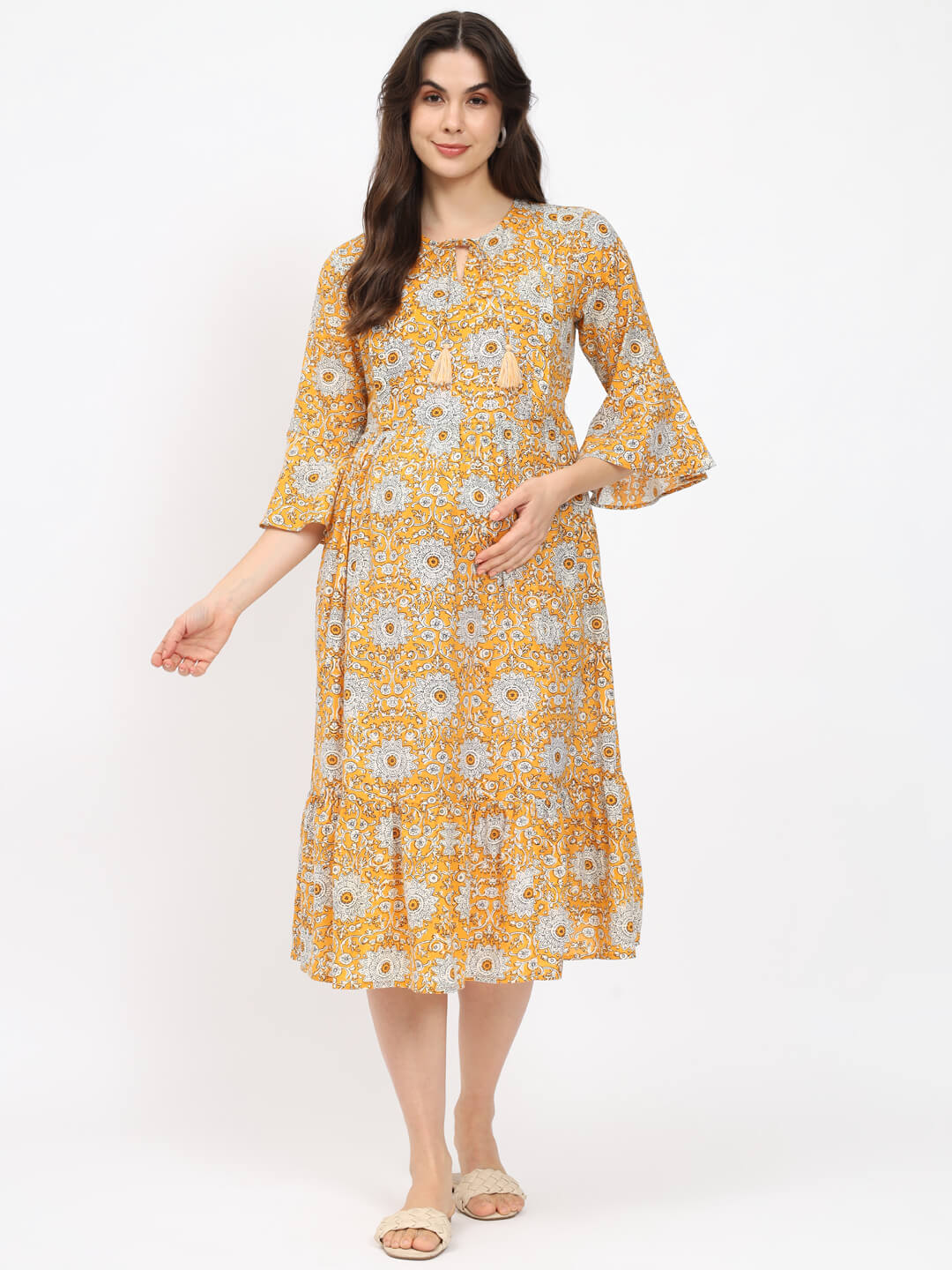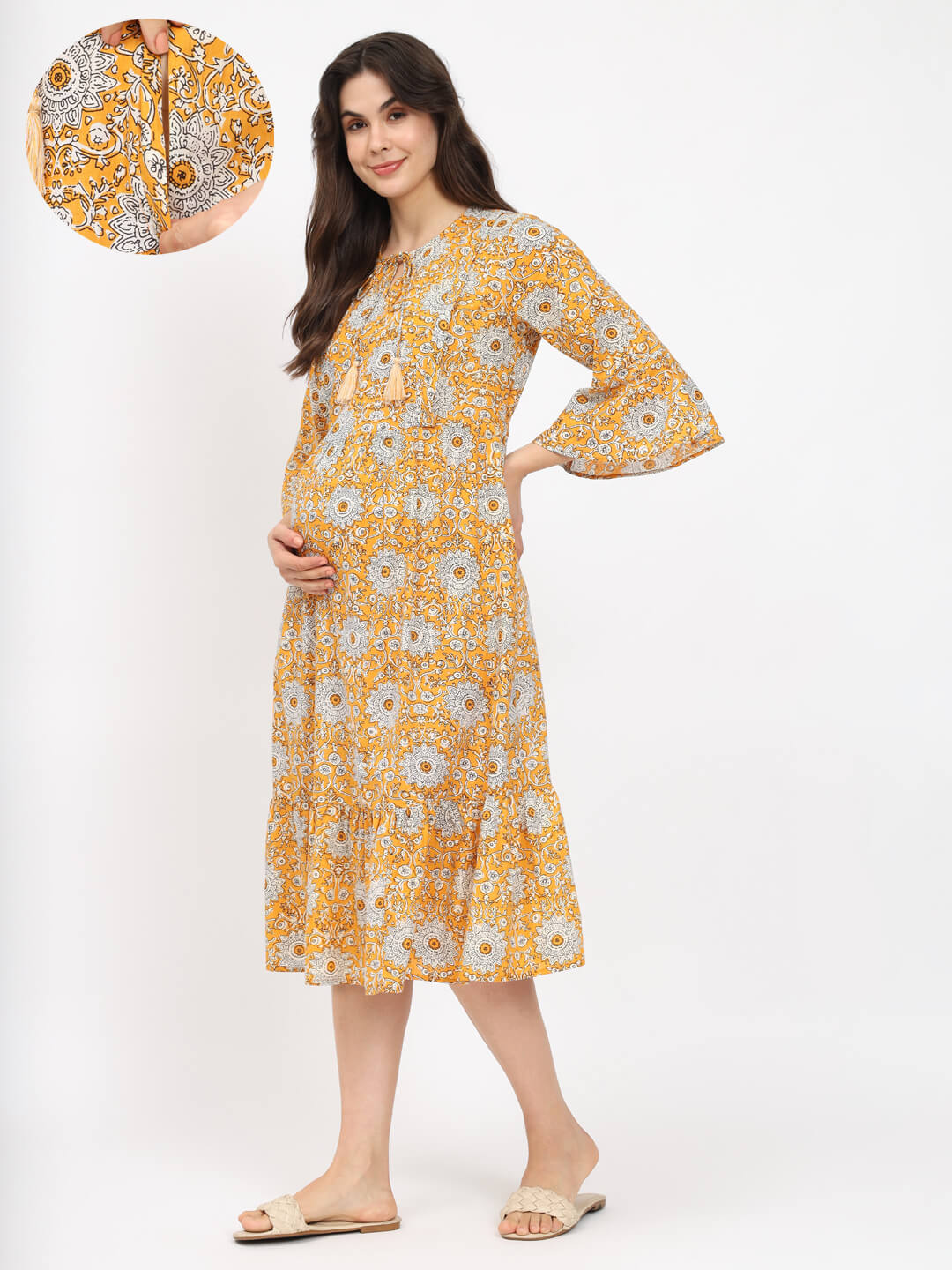 Yellow Printed Maternity Feeding Flared Dress