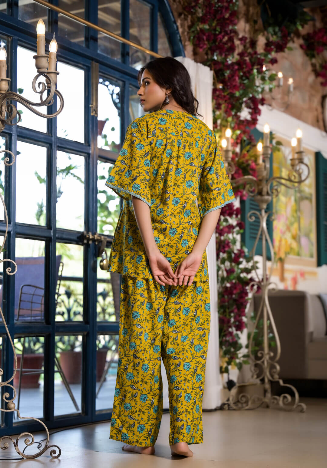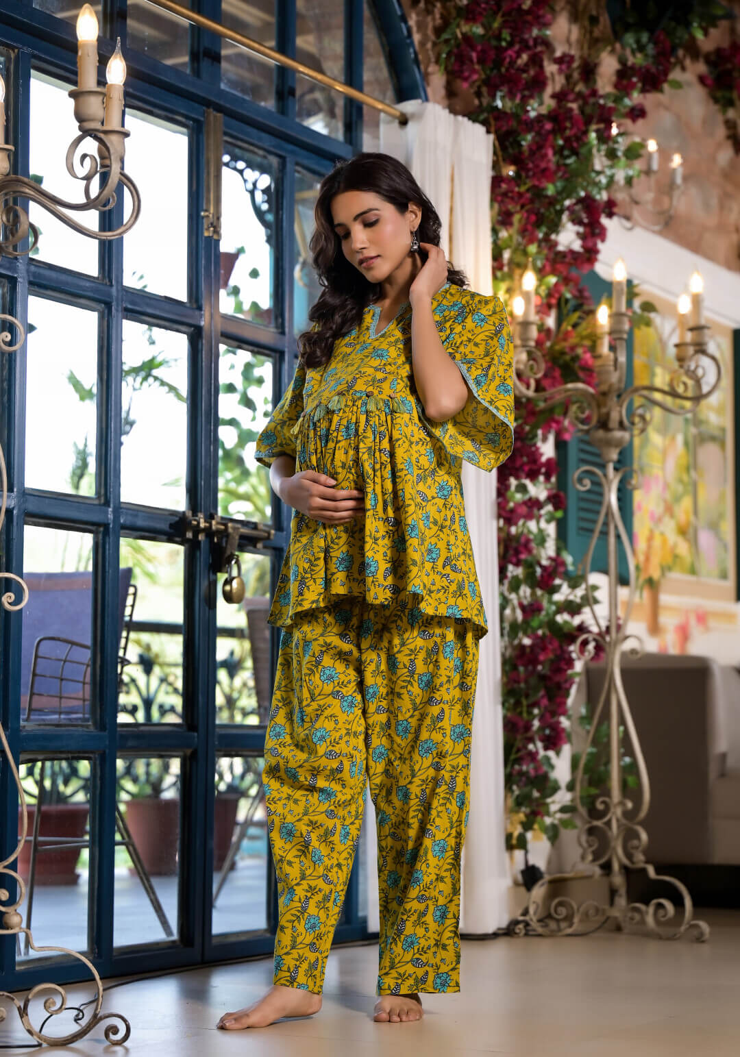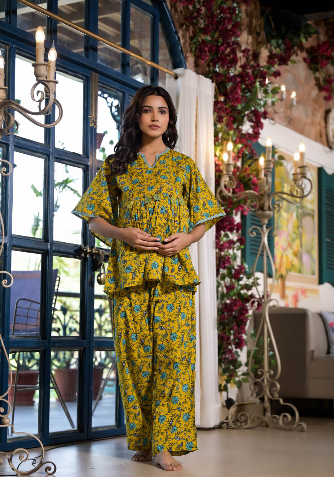 Yellow Cotton Printed Maternity Feeding Kaftan Co-Ord Set