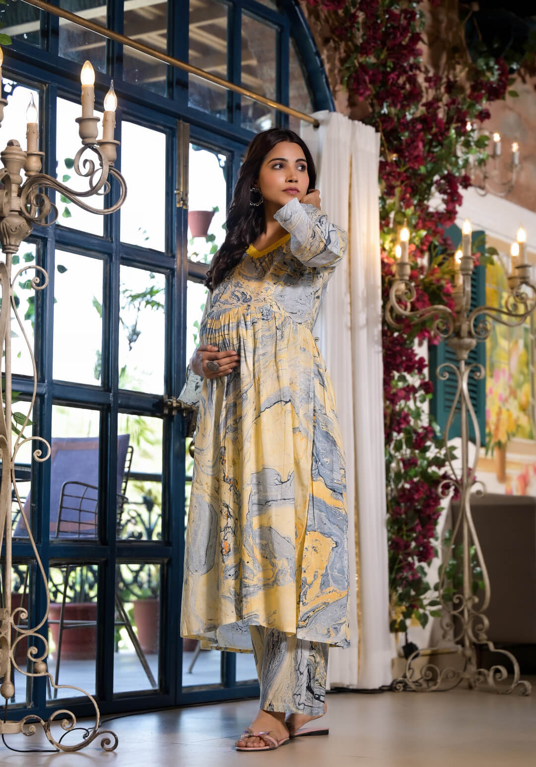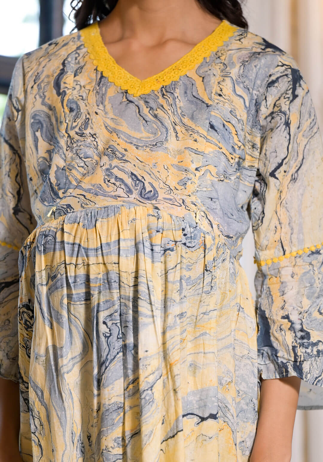 Yellow Grey Cotton Marble Hand Printed Maternity Feeding Kurta Set