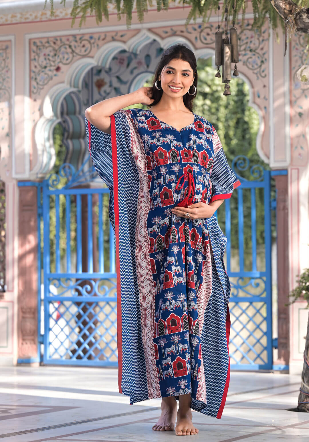 Indigo Red Printed Front Zipper Maternity Feeding Kaftan