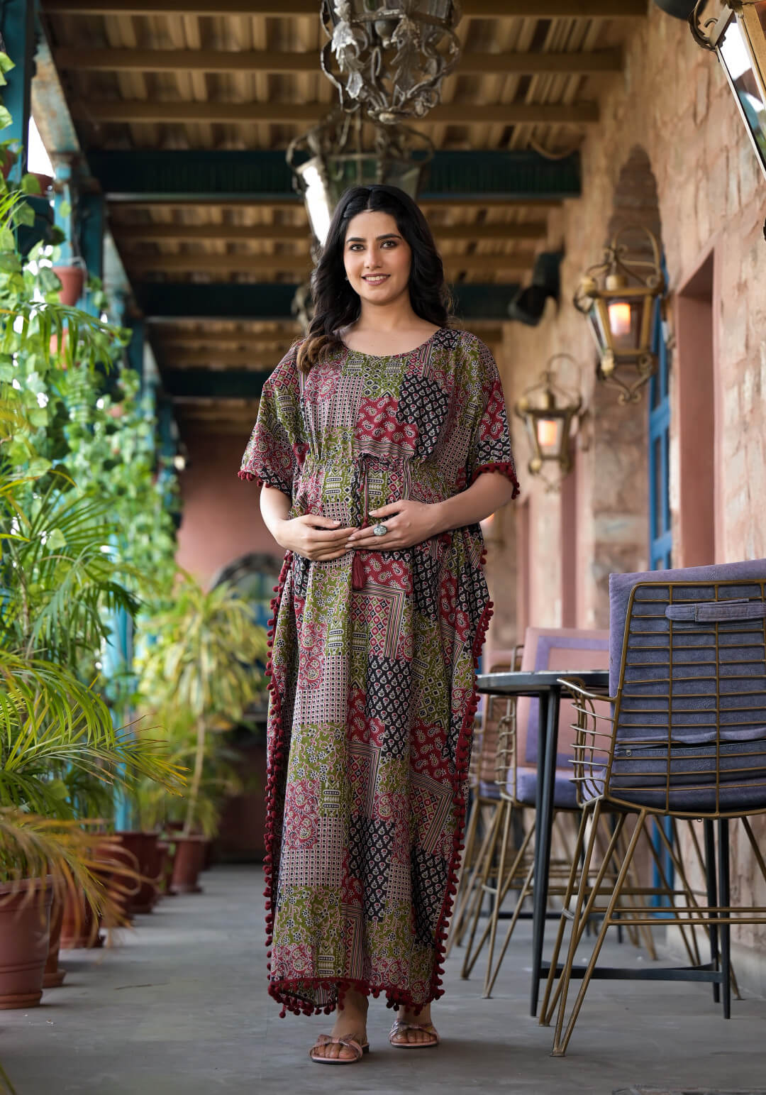 Black Maroon Printed Front Zipper Maternity Feeding Kaftan