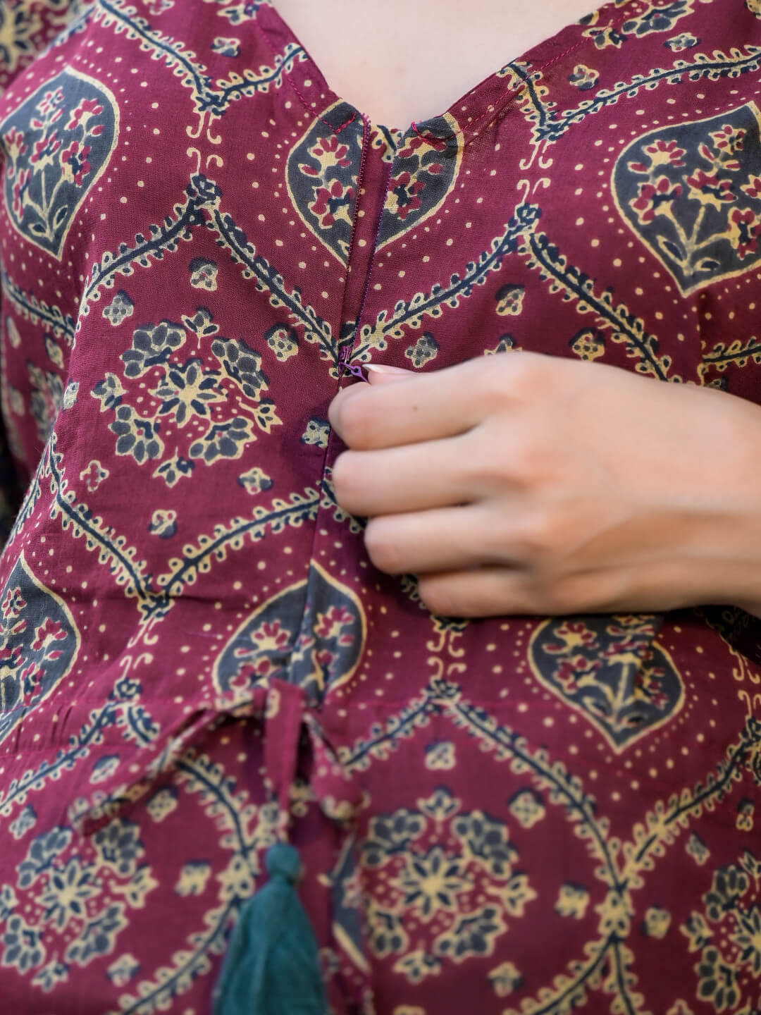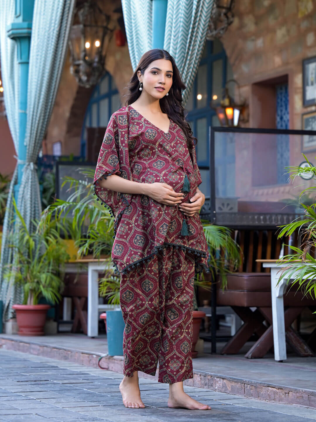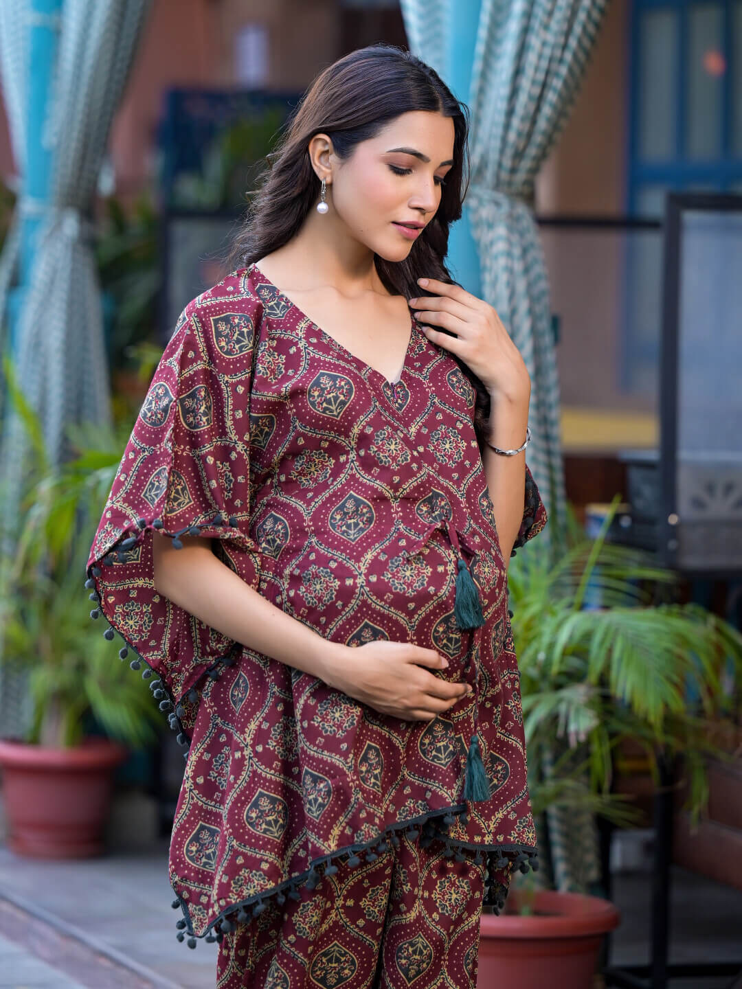 Maroon Grey Printed Maternity Feeding Kaftan Night Suit