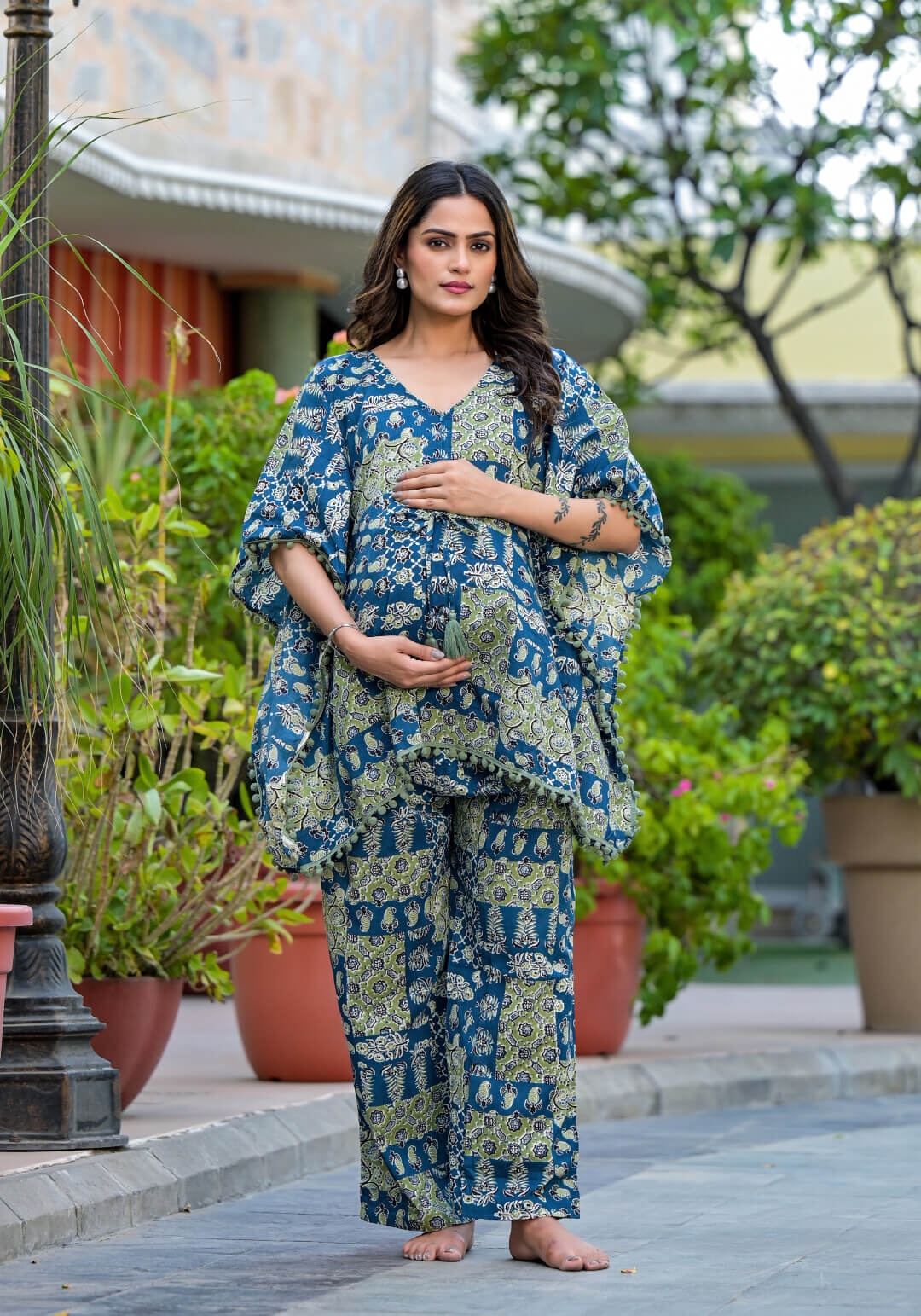 Blue Green Printed Cotton Maternity Feeding Kaftan Night Suit