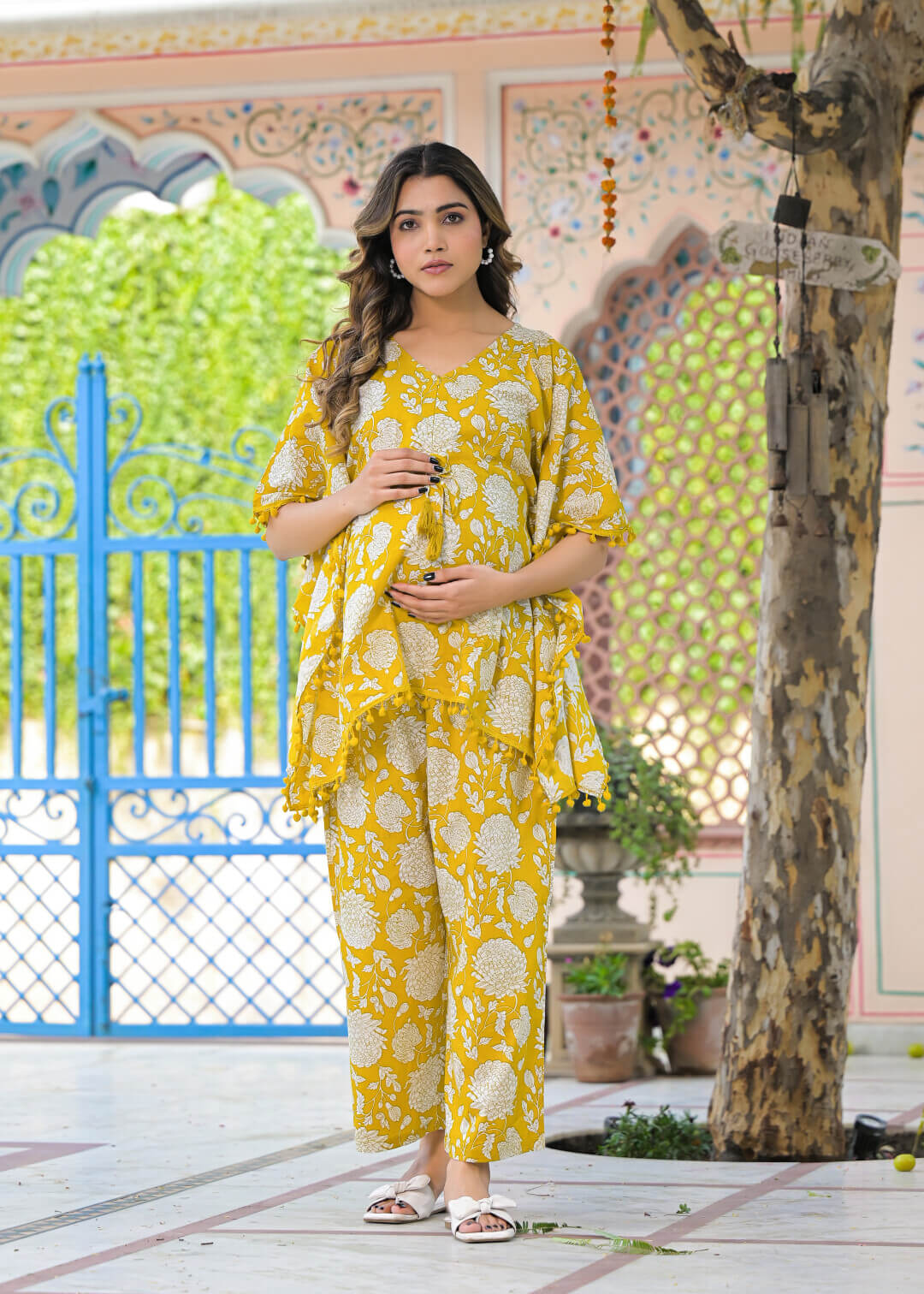 Mustard Printed Cotton Maternity Feeding Kaftan Night Suit