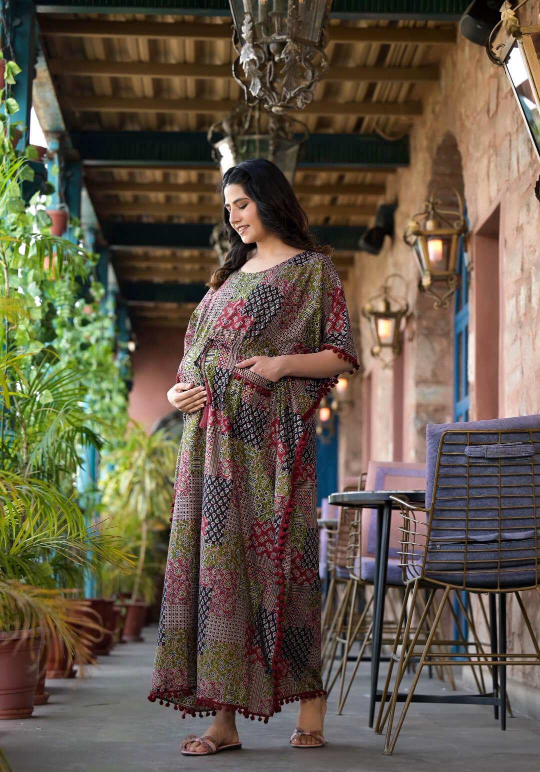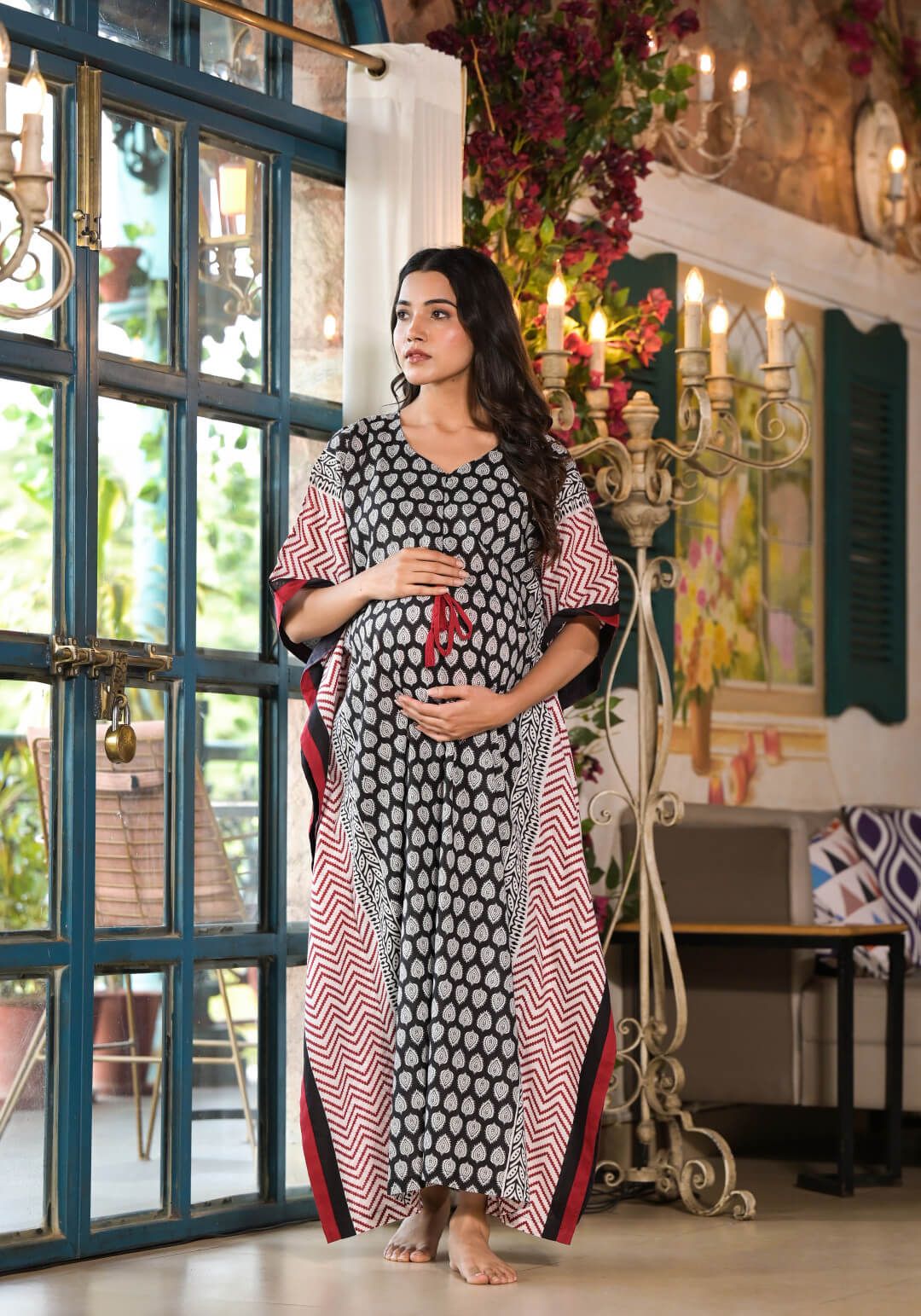 Black Maroon Printed Front Zipper Maternity Feeding Kaftan
