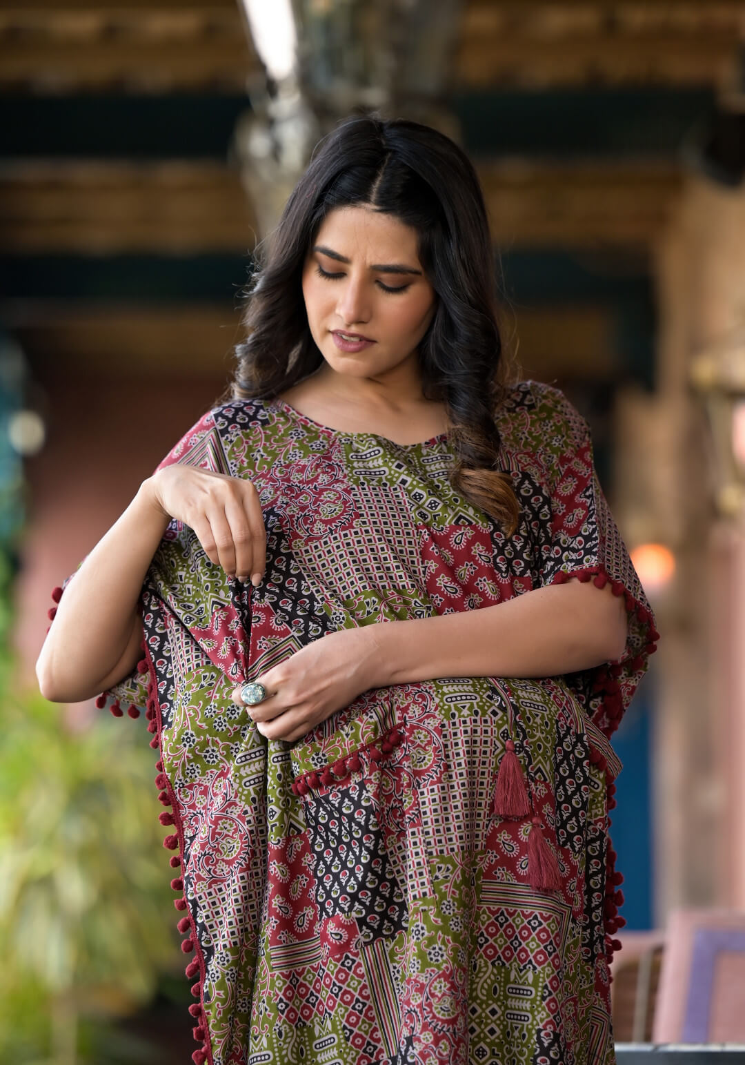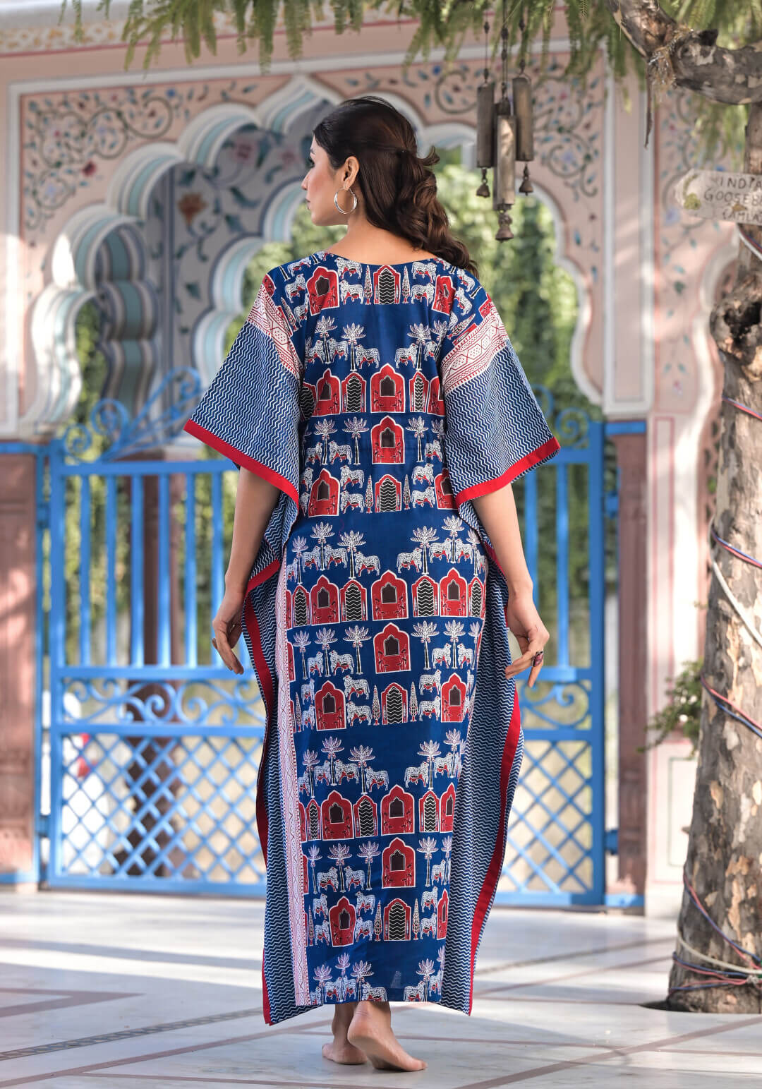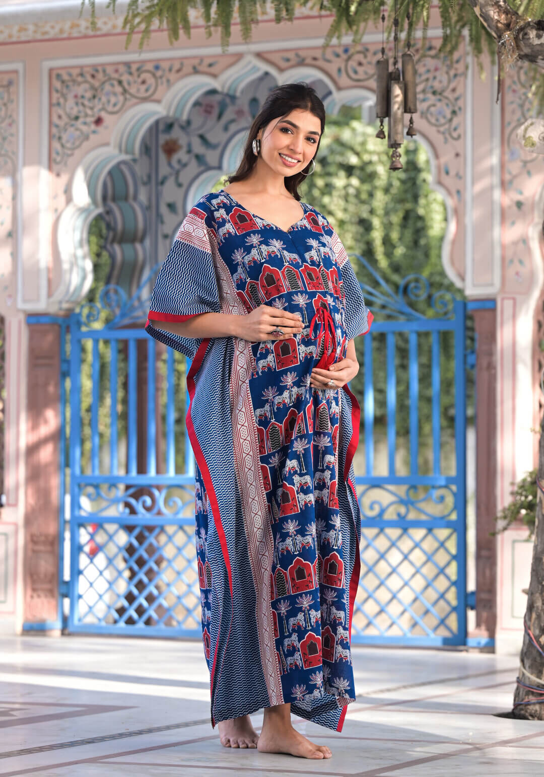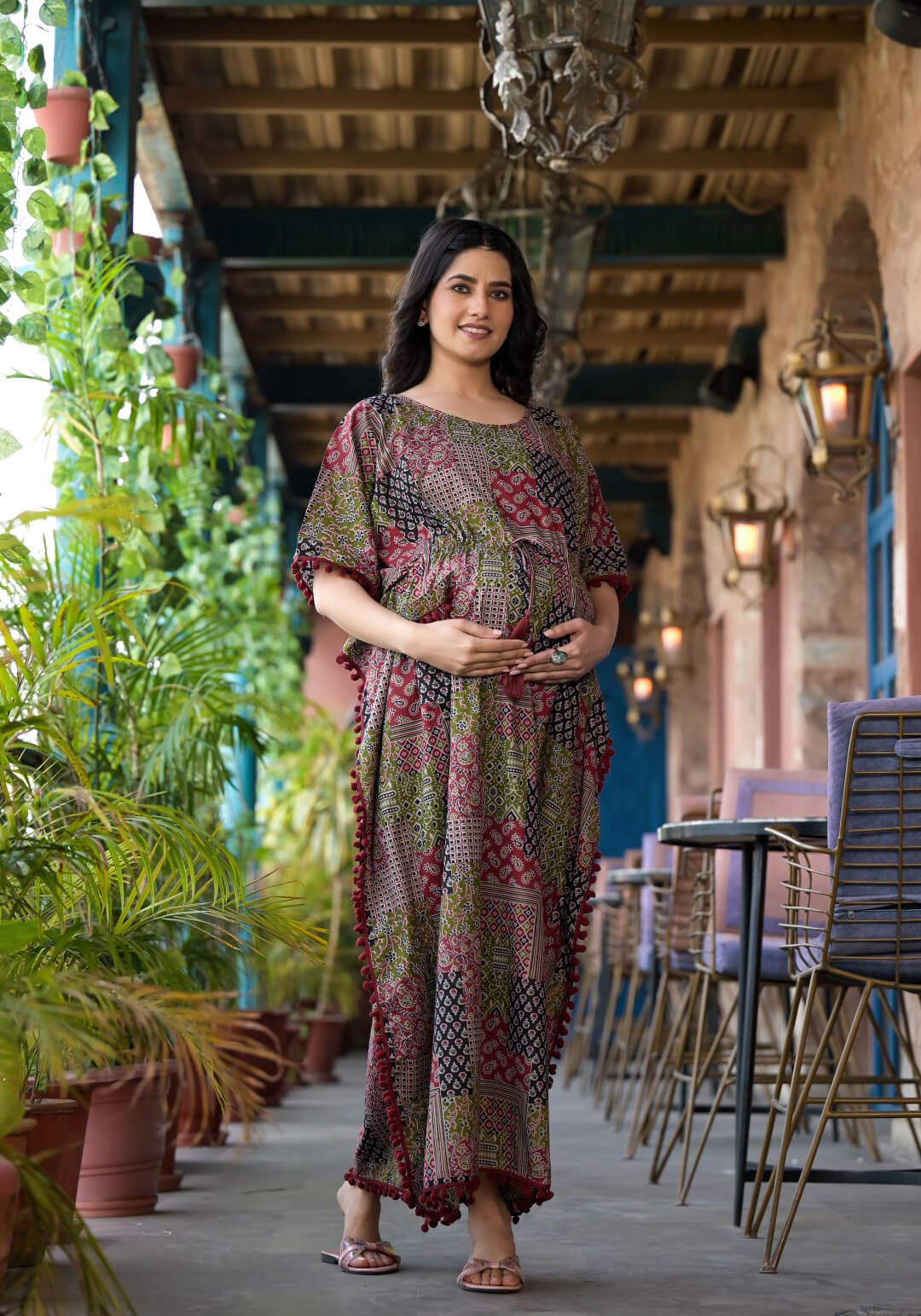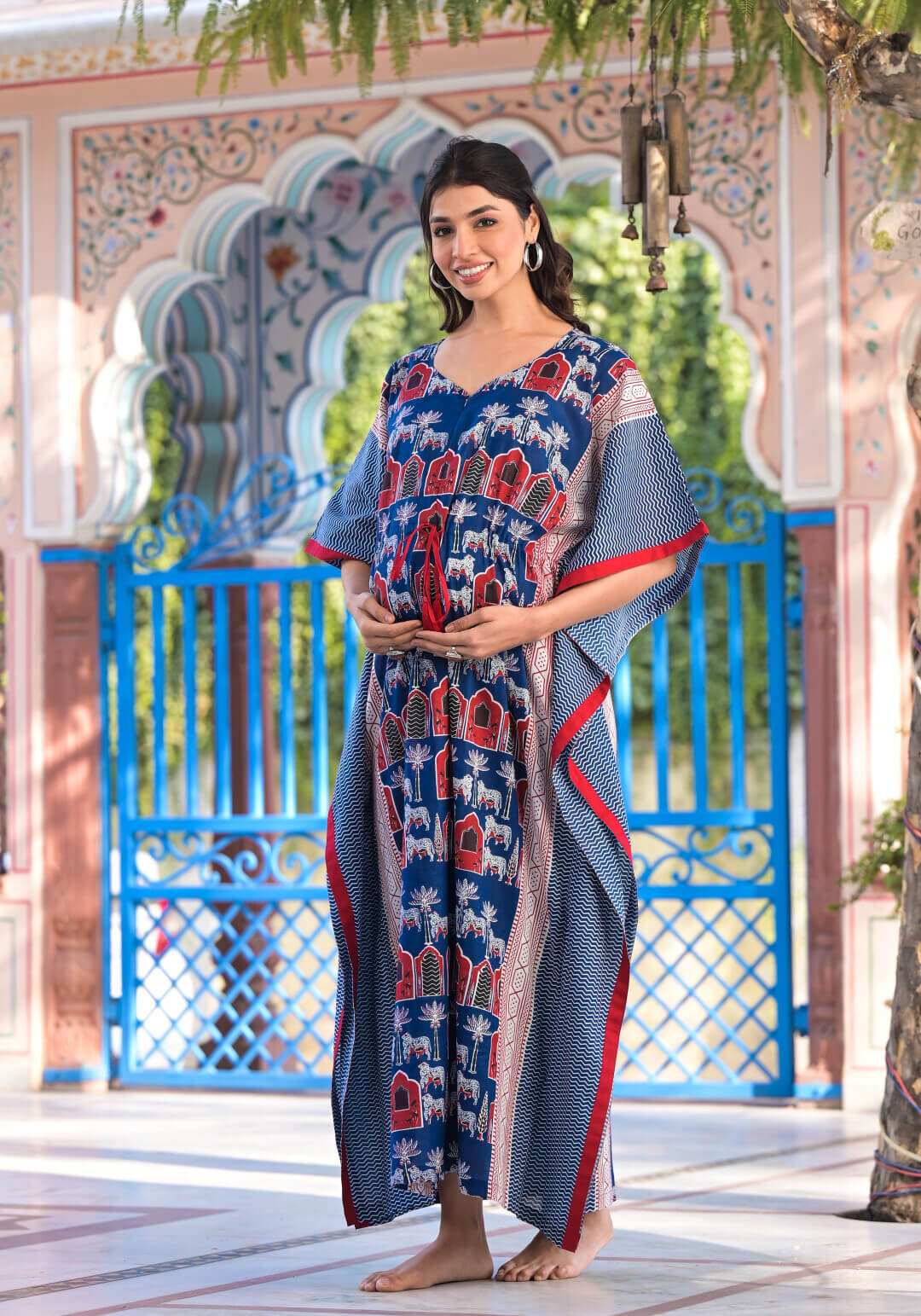 Indigo Red Printed Front Zipper Maternity Feeding Kaftan