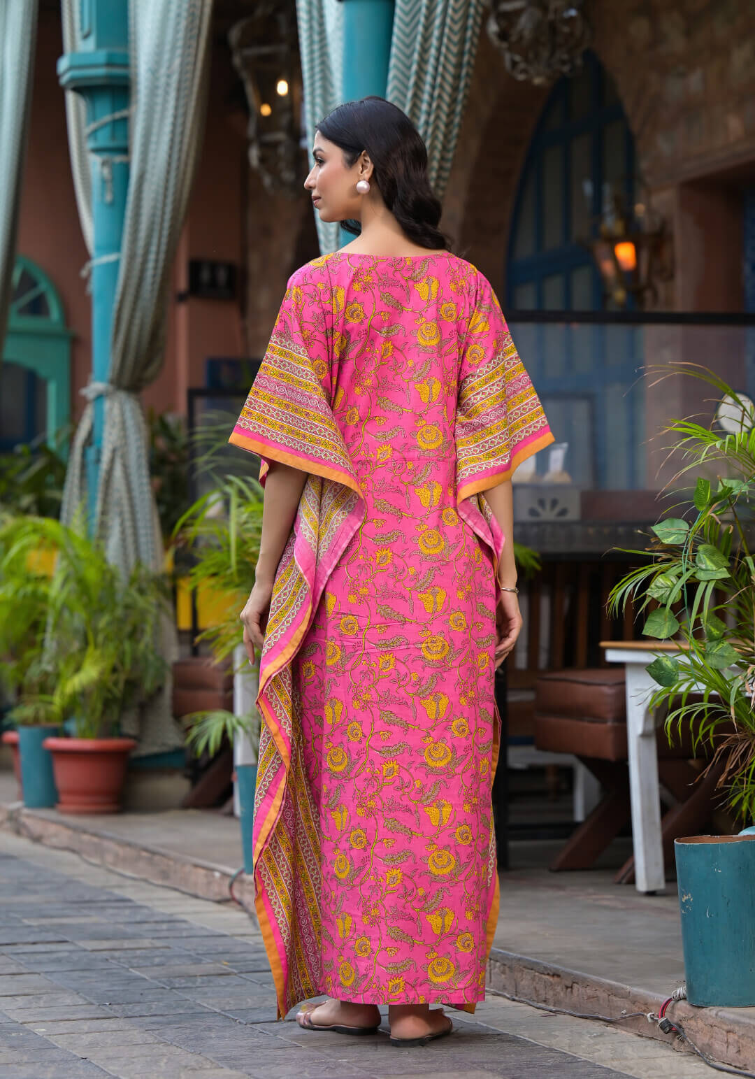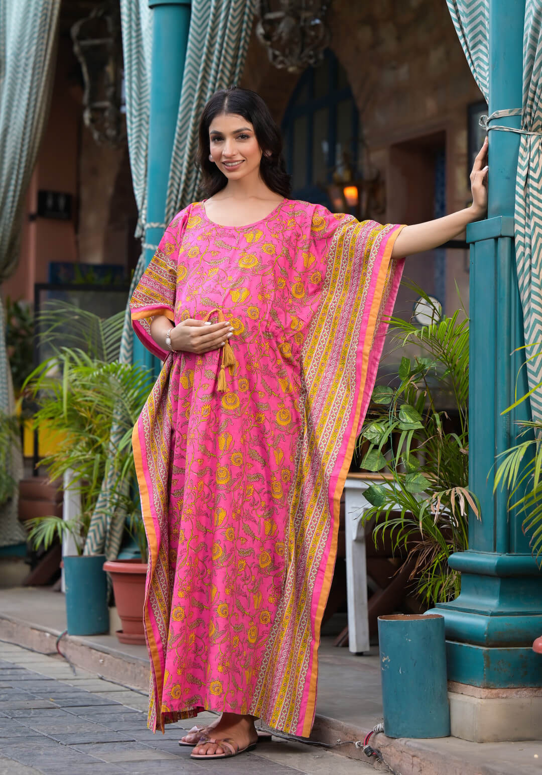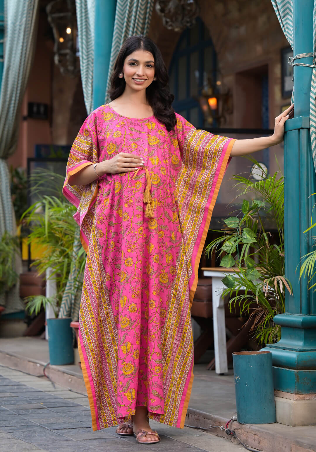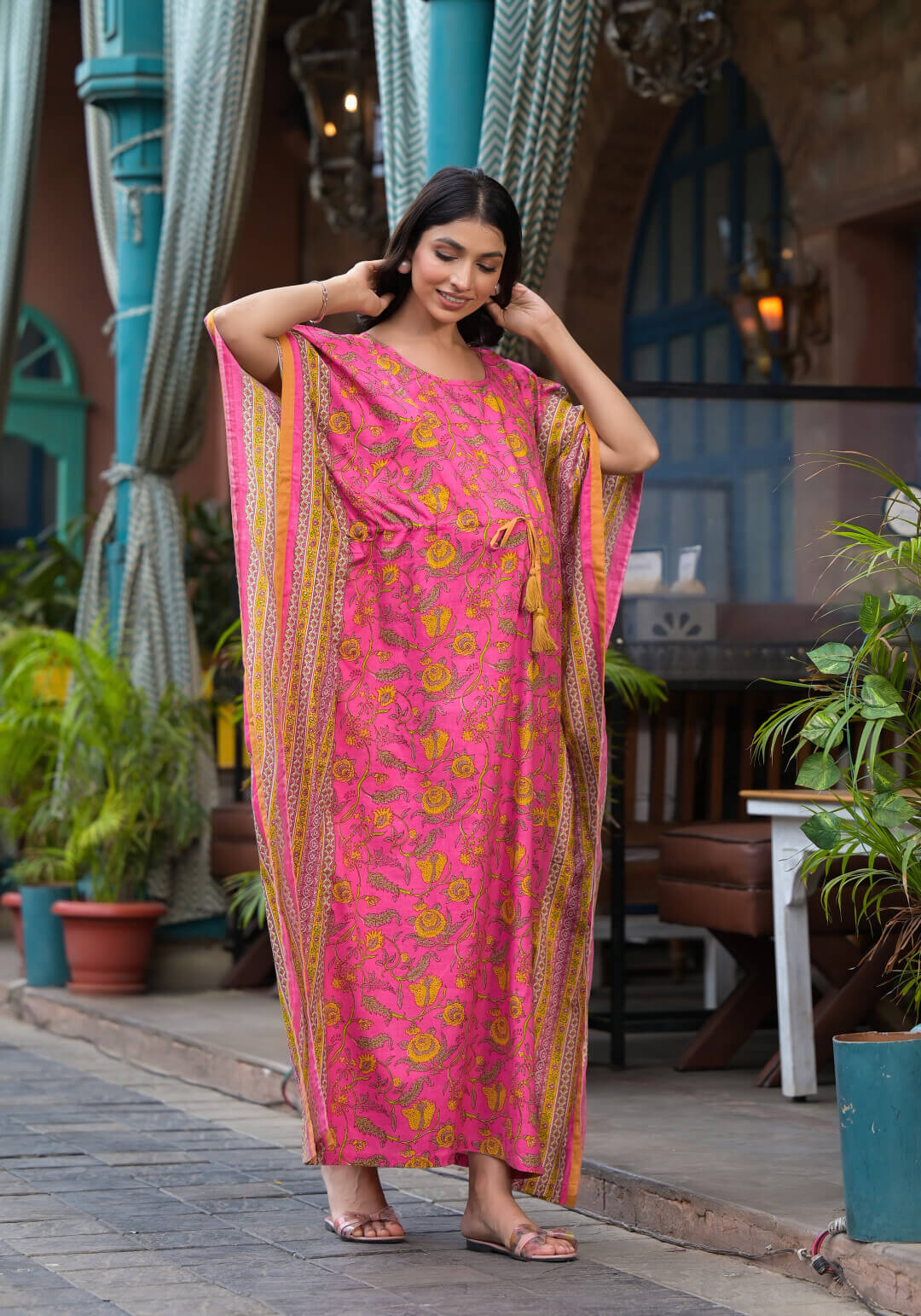 Pink Multi Printed Front Zipper Maternity Feeding Kaftan