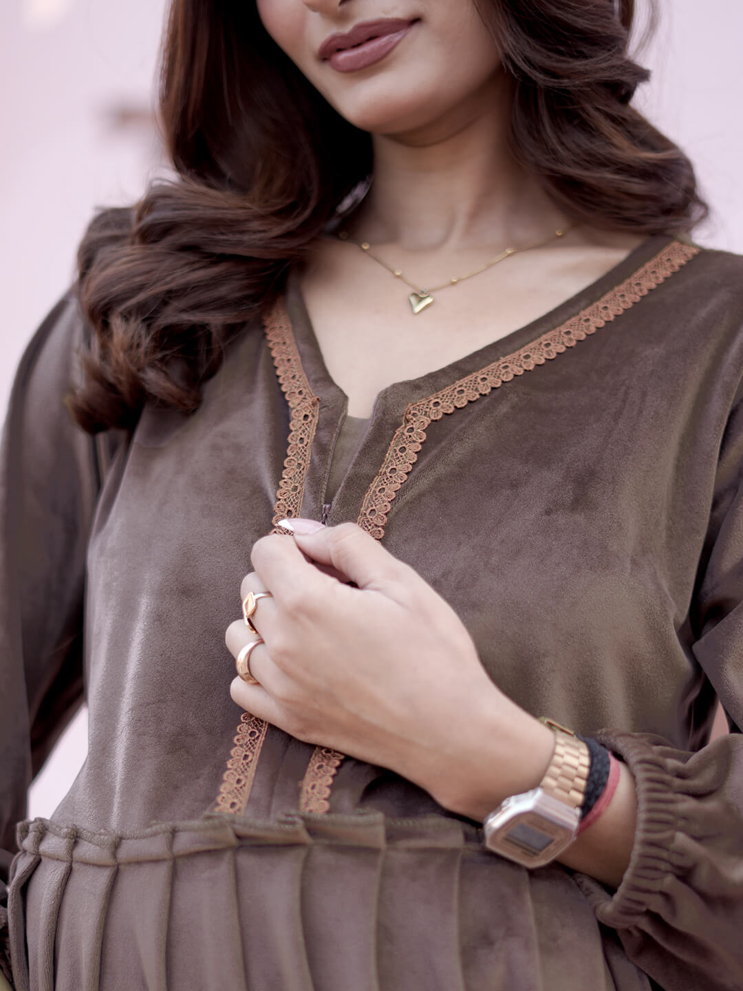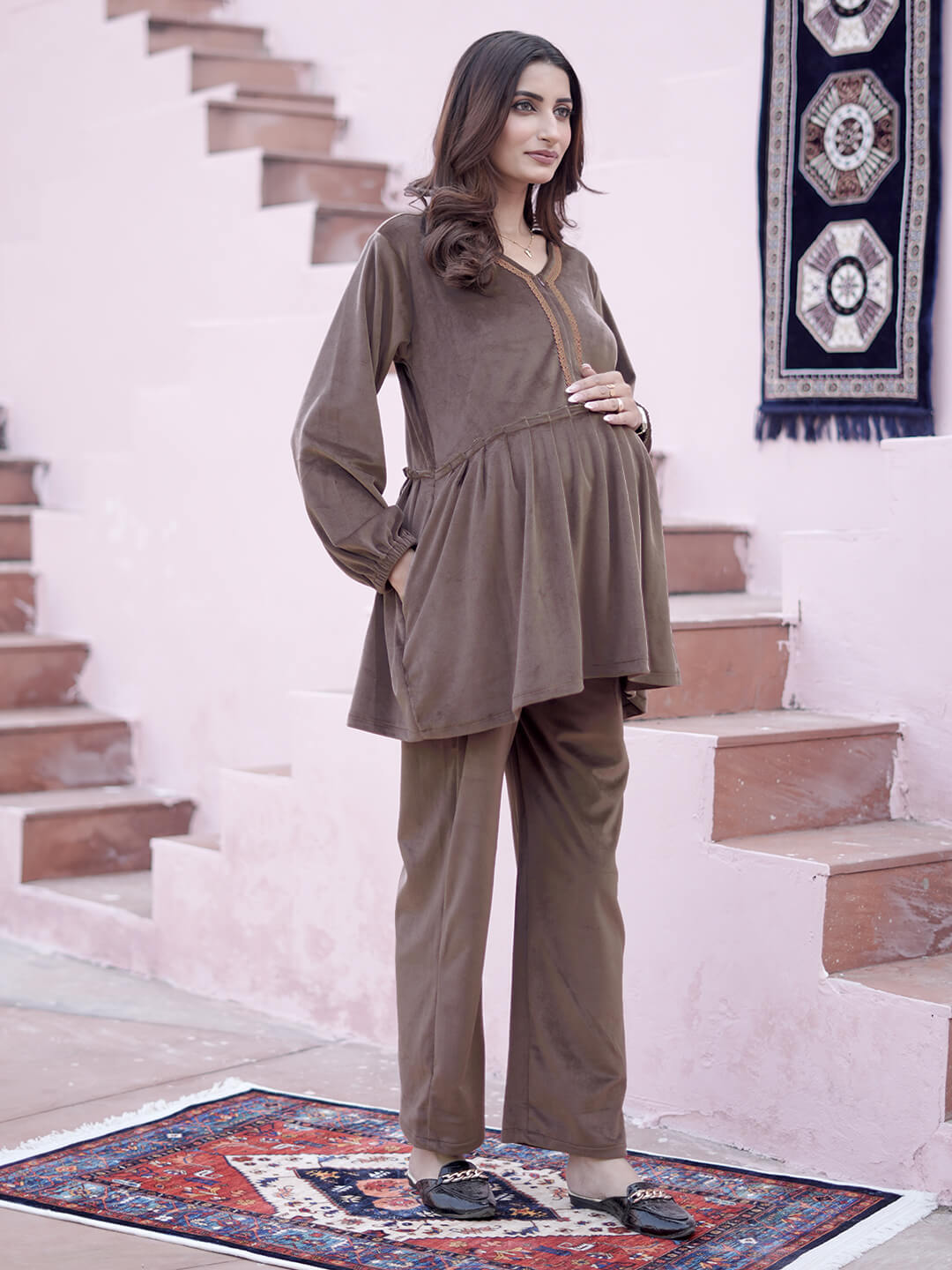 Taupe Velvet Maternity Feeding Night Suit