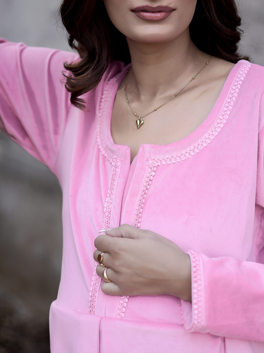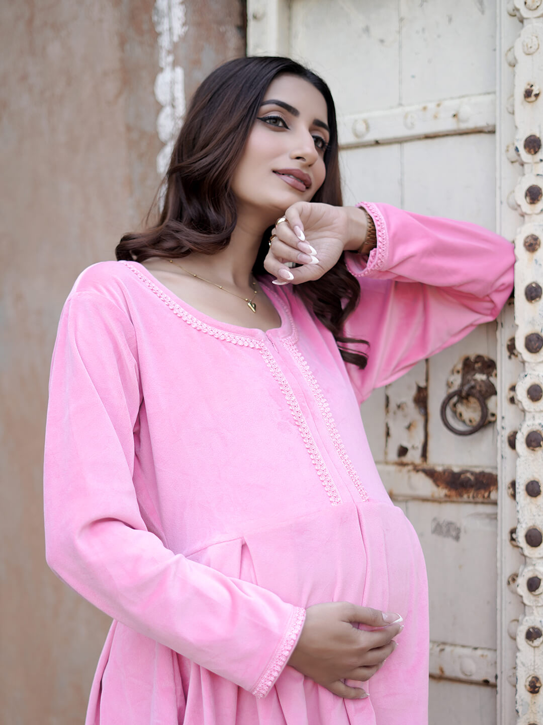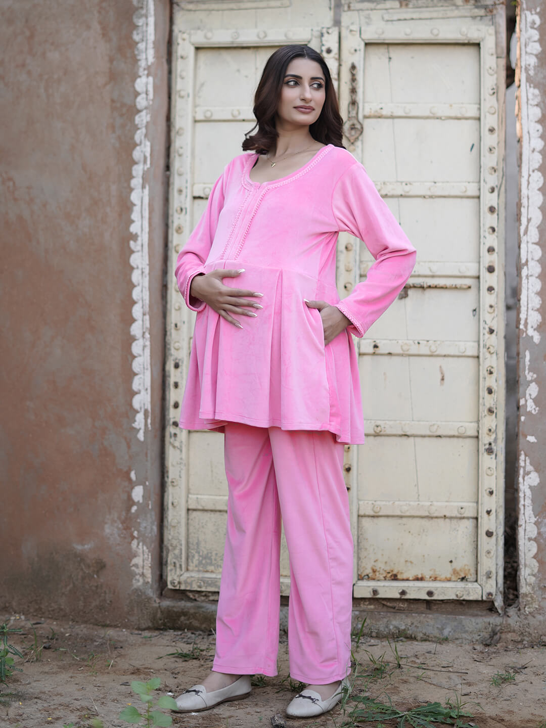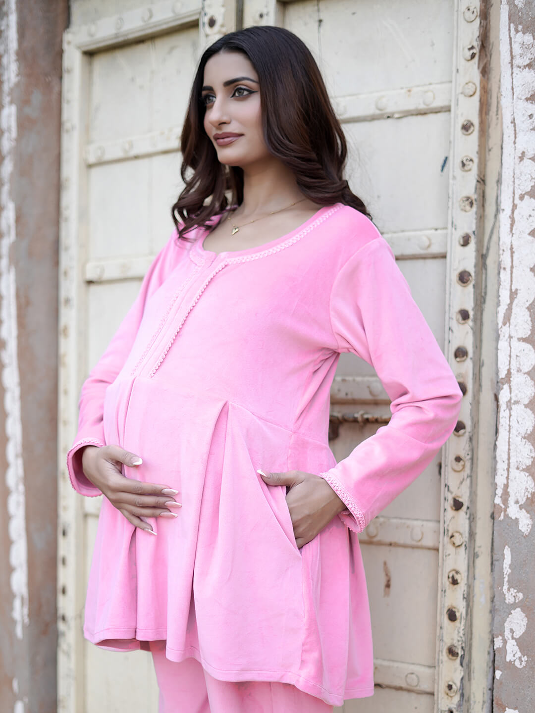 Pink Velvet Maternity Feeding Night Suit