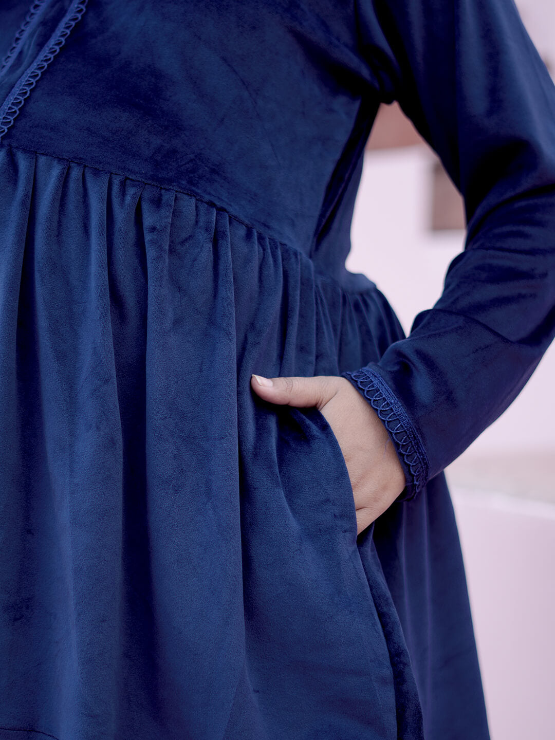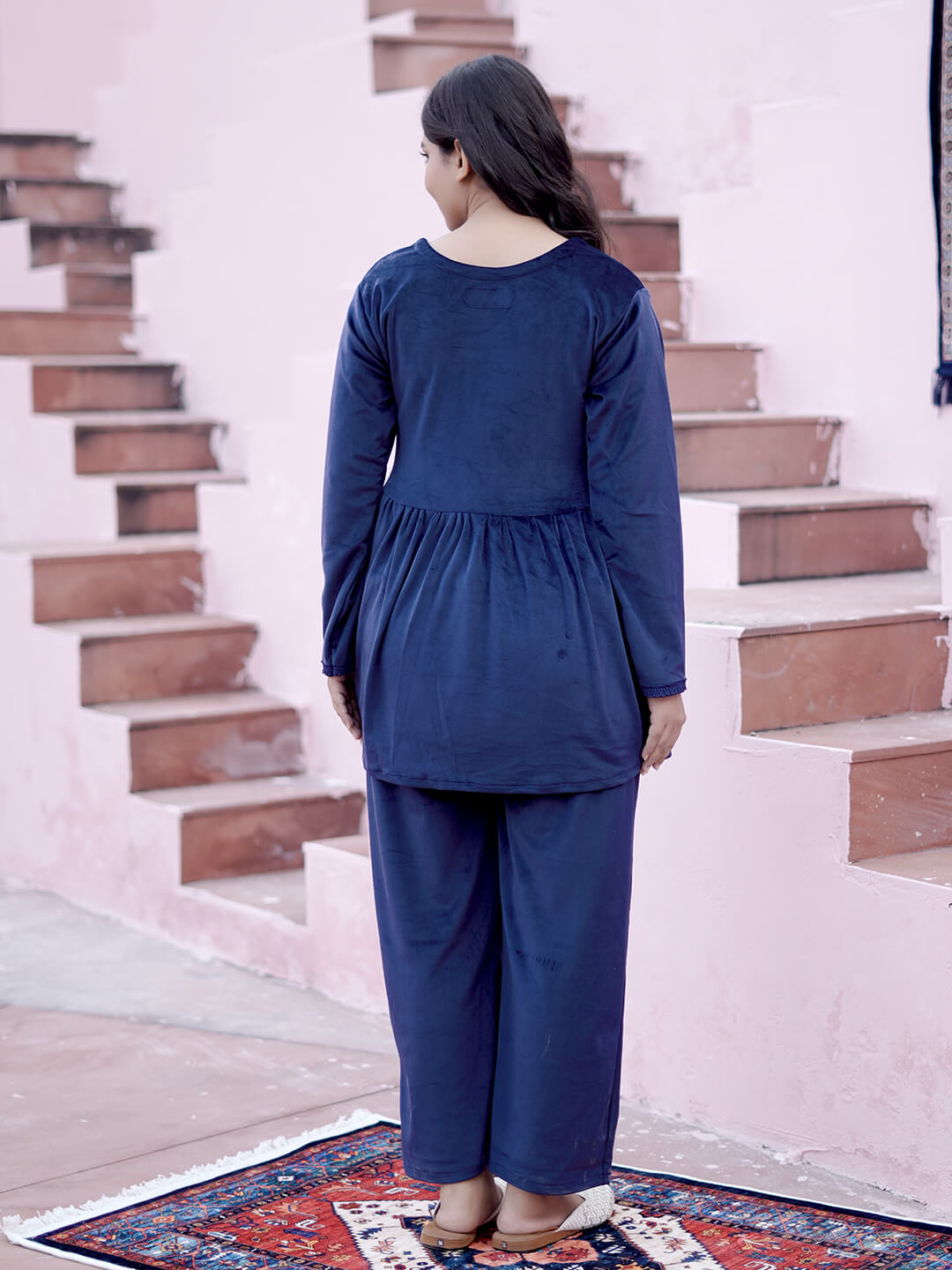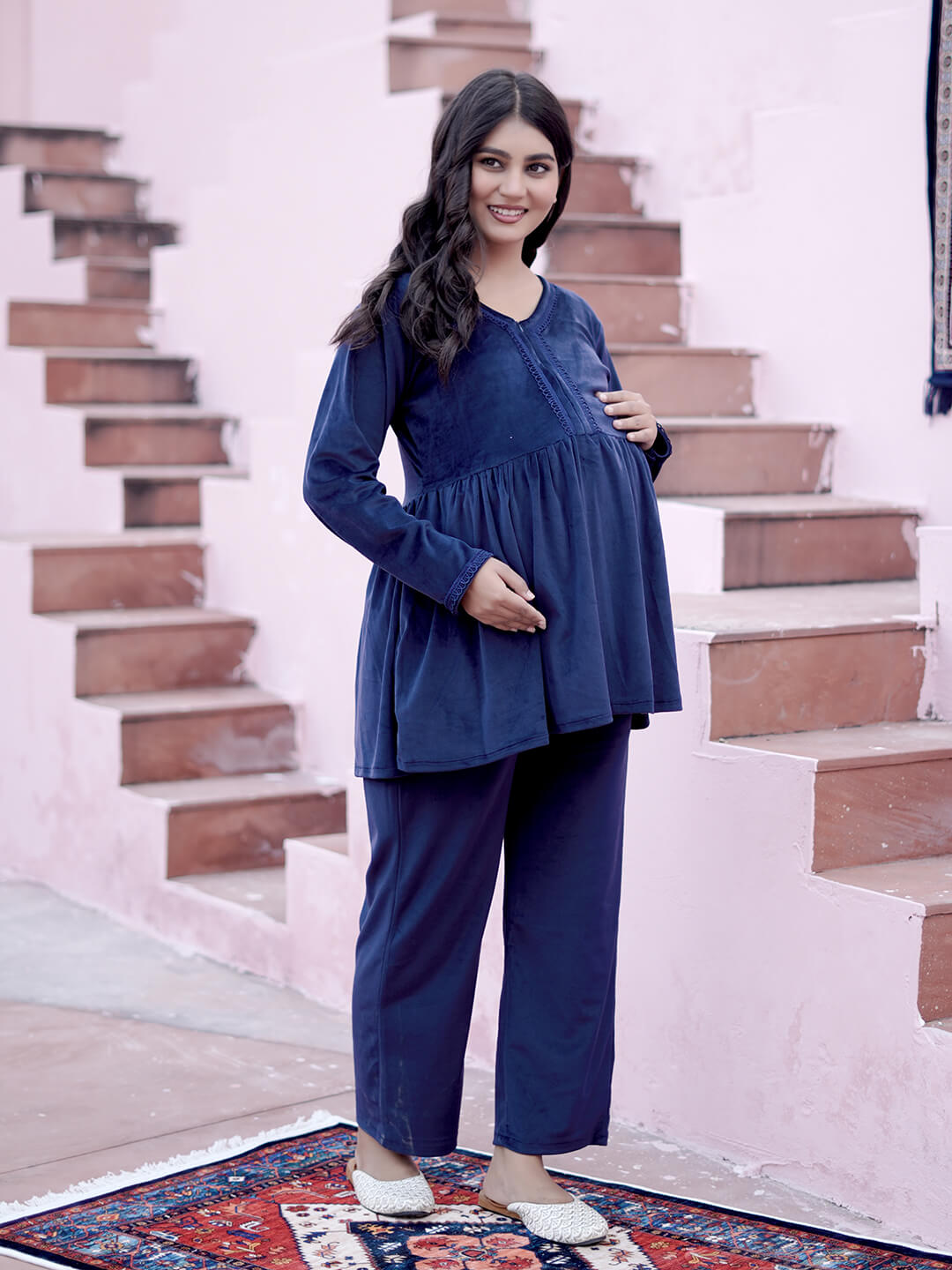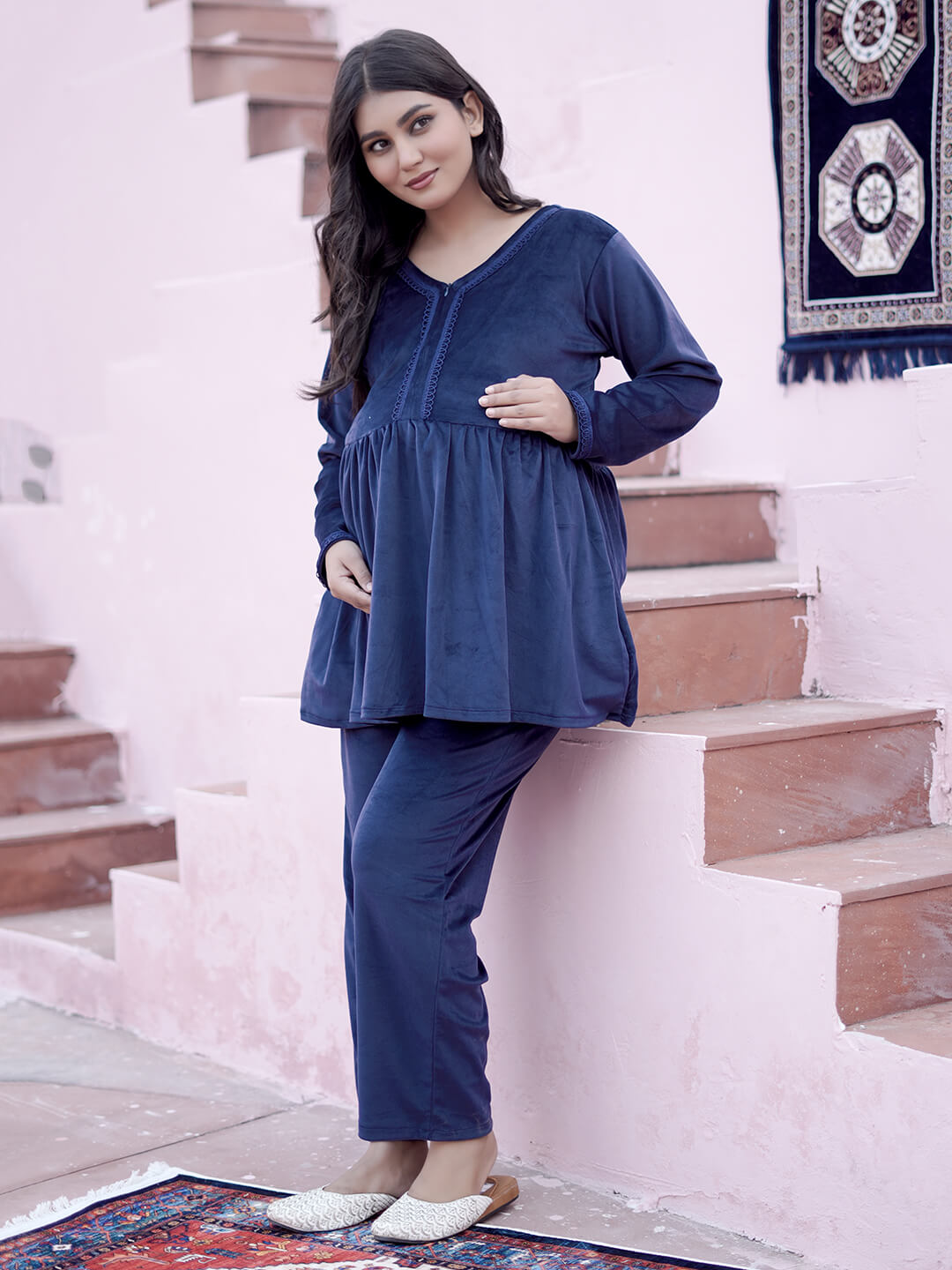 Navy Blue Velvet Maternity Feeding Night Suit