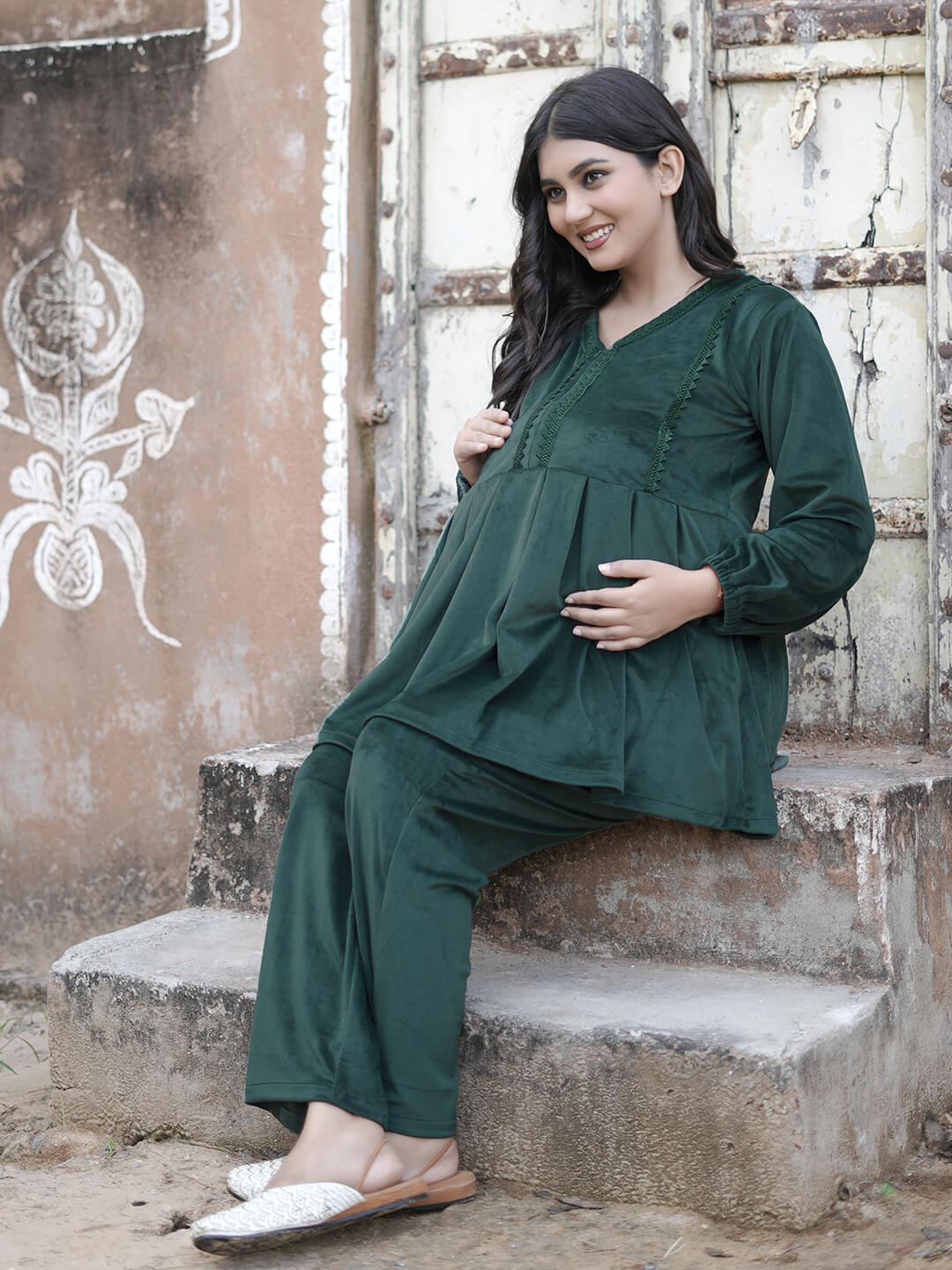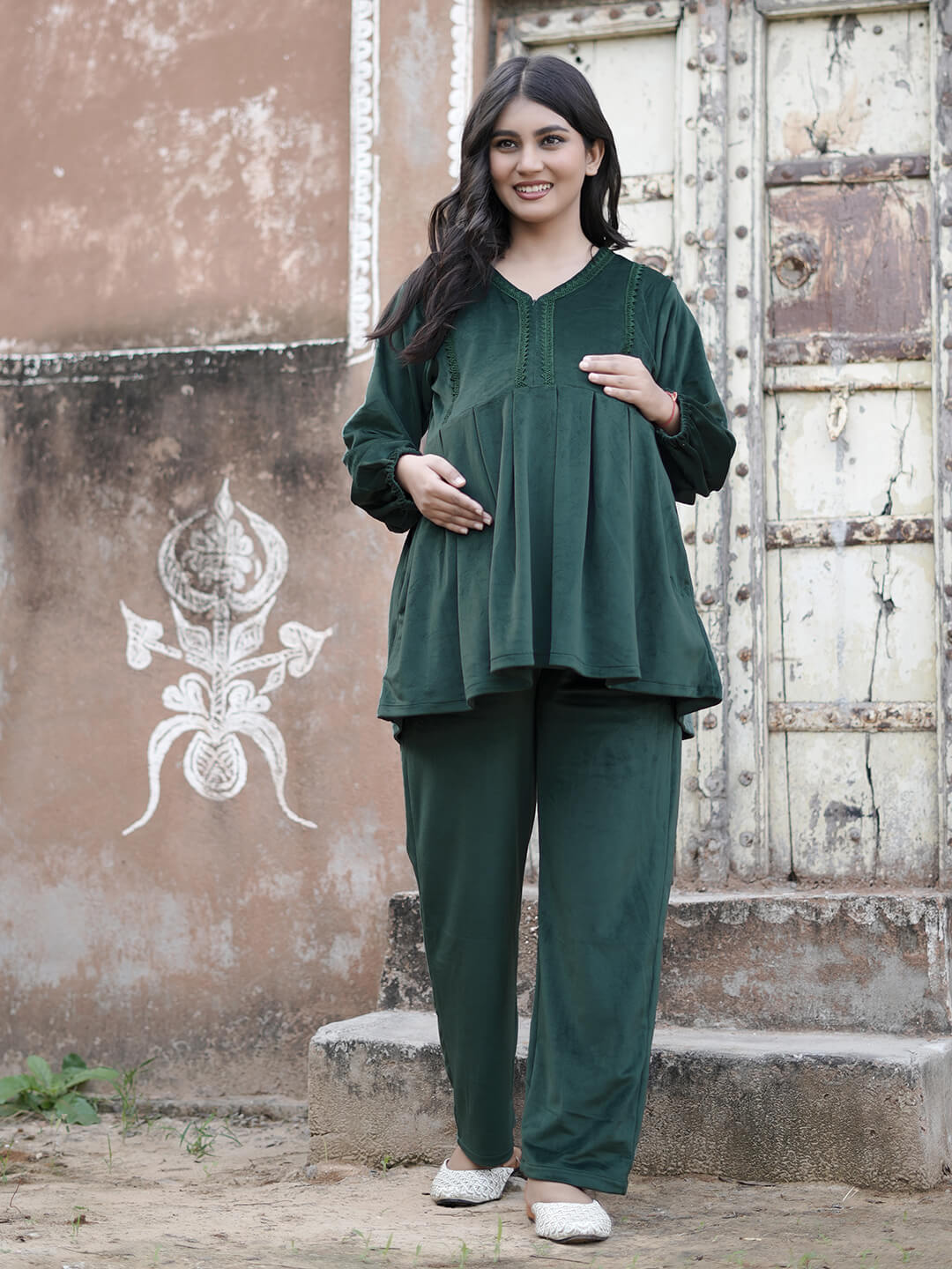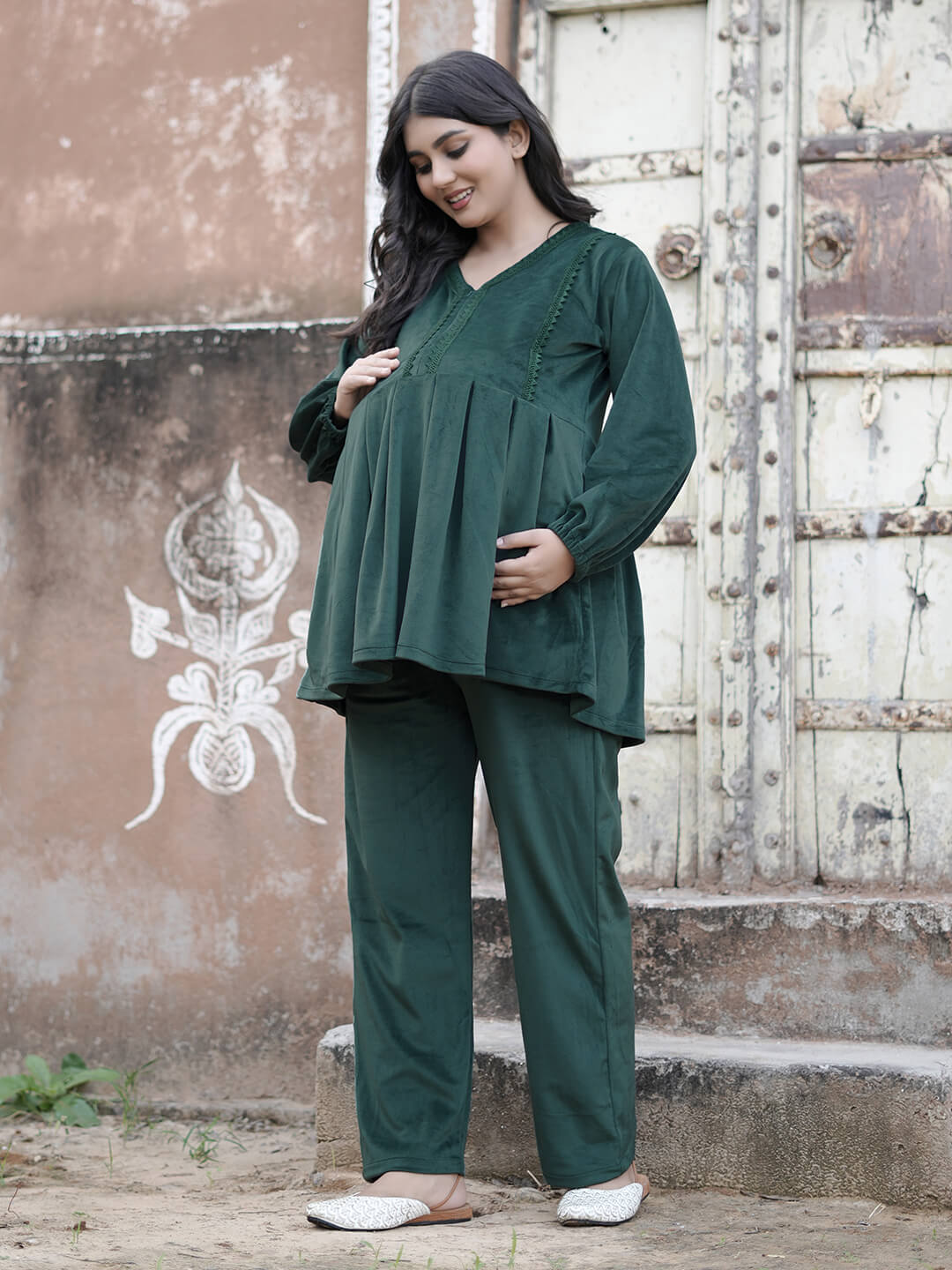 Bottle Green Velvet Maternity Feeding Night Suit