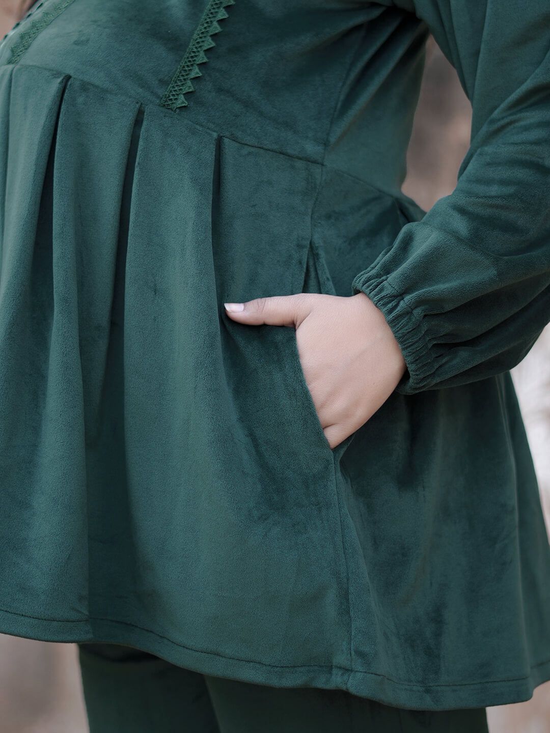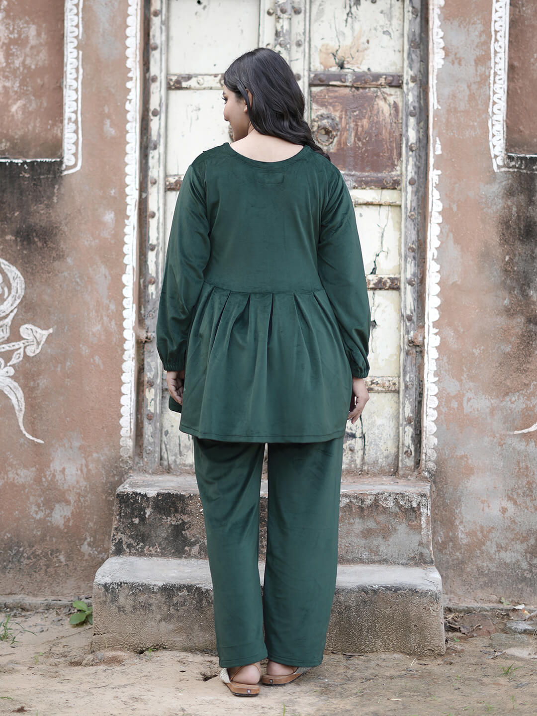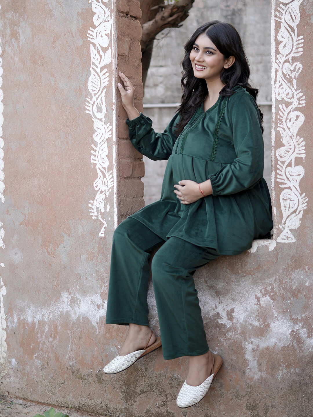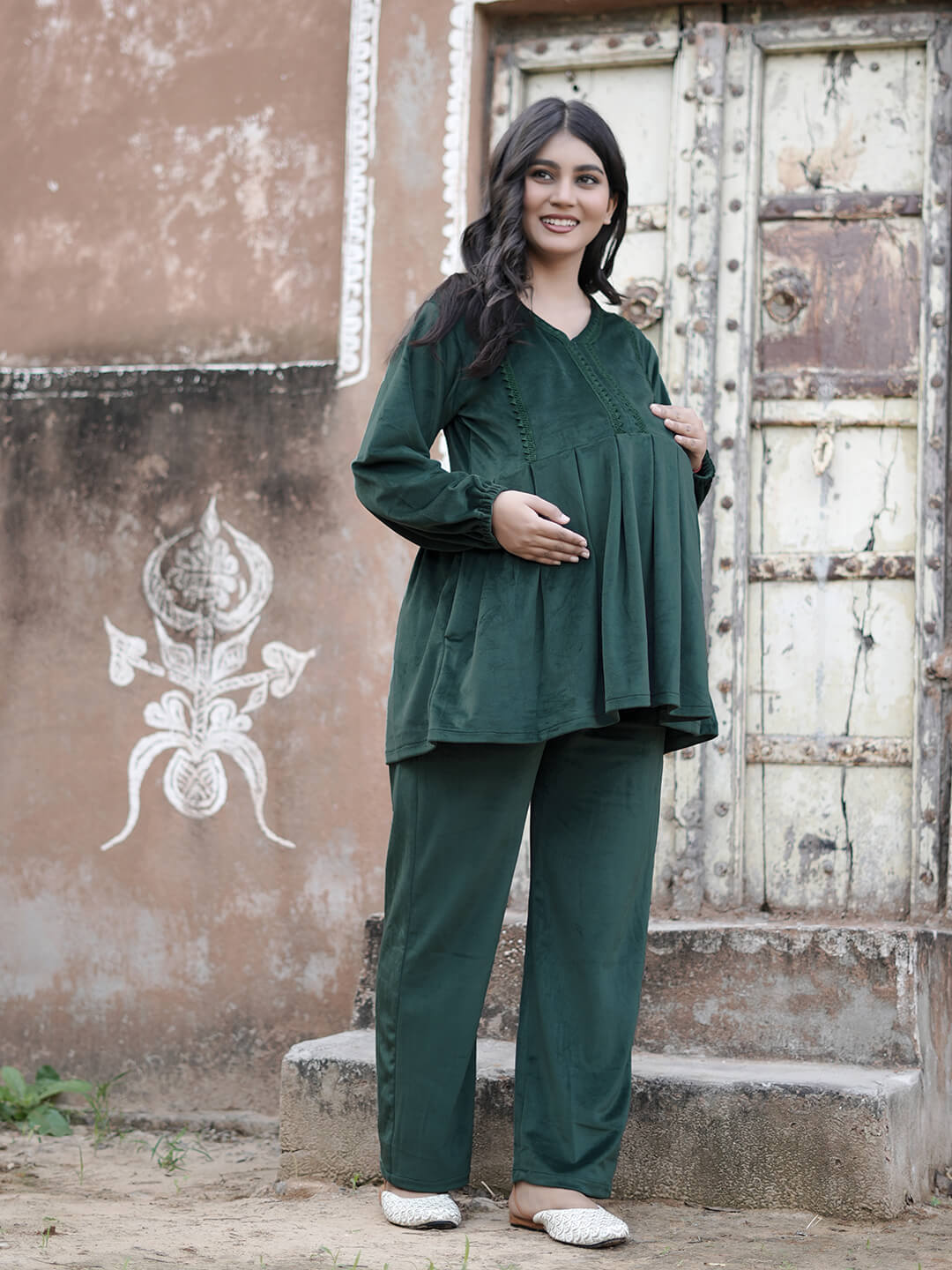 Bottle Green Velvet Maternity Feeding Night Suit