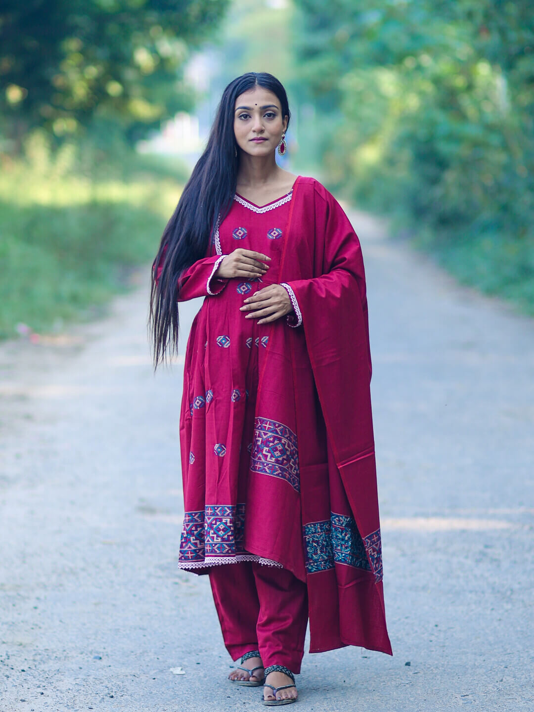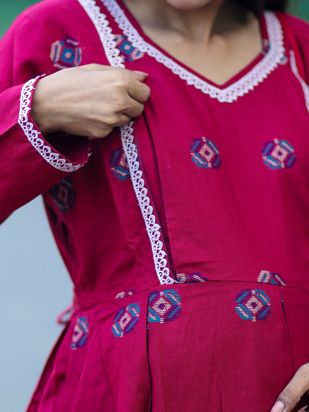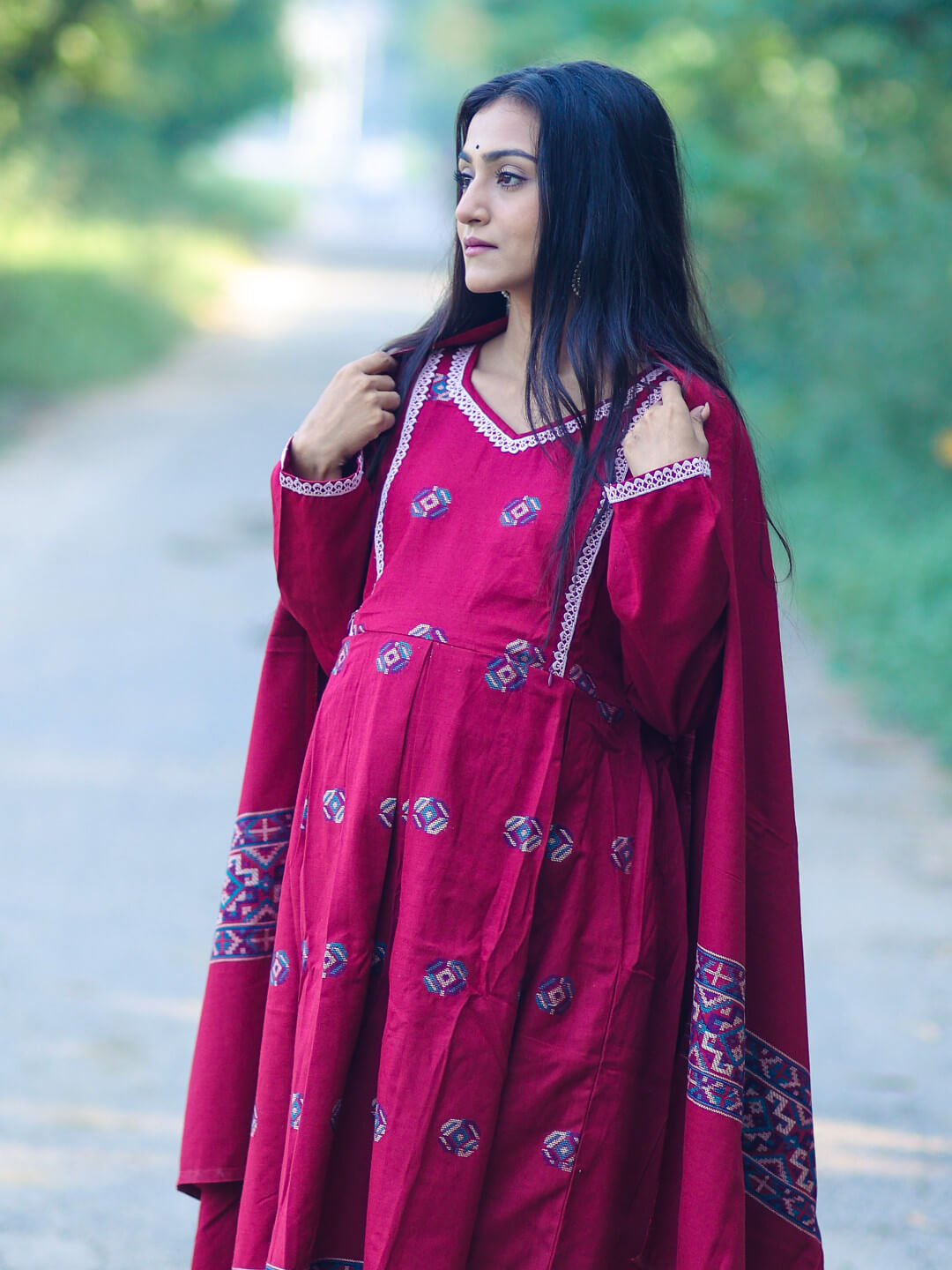 Maroon Woolen Kullu Patti Maternity Feeding Flared Kurta Set with Shawl