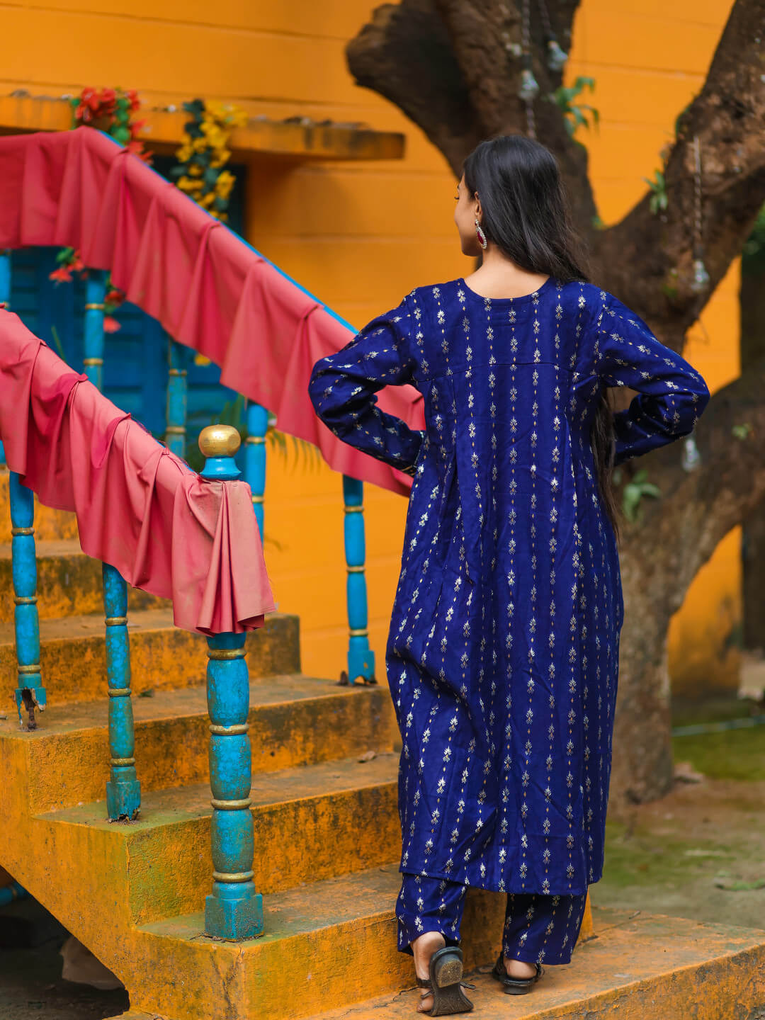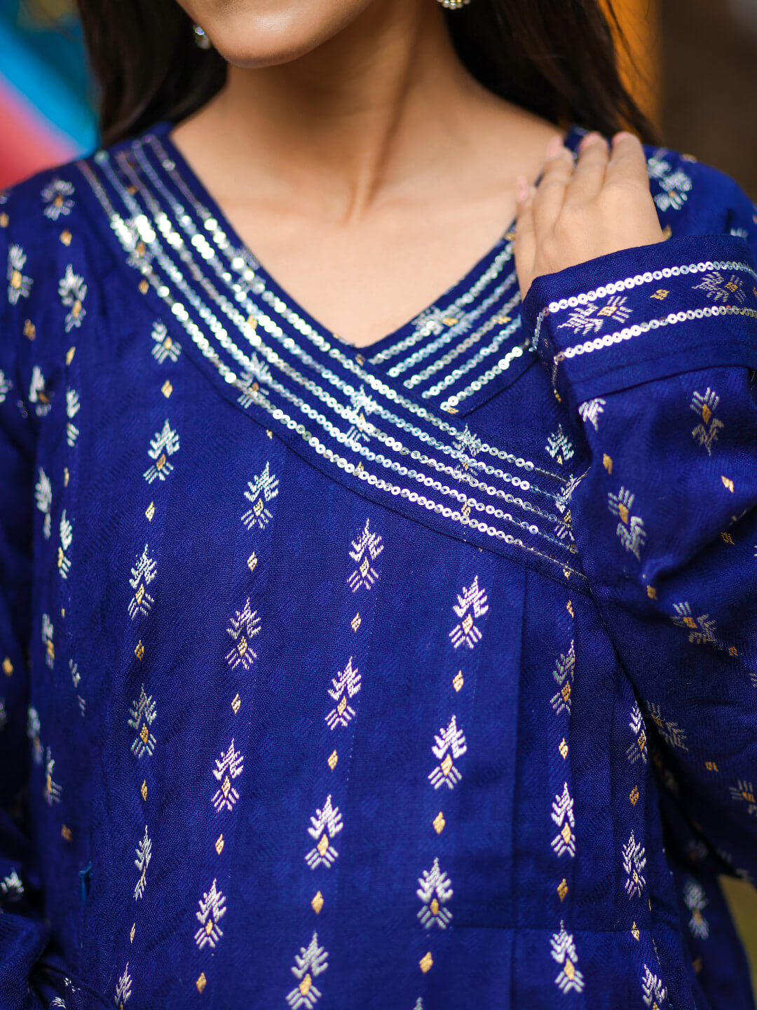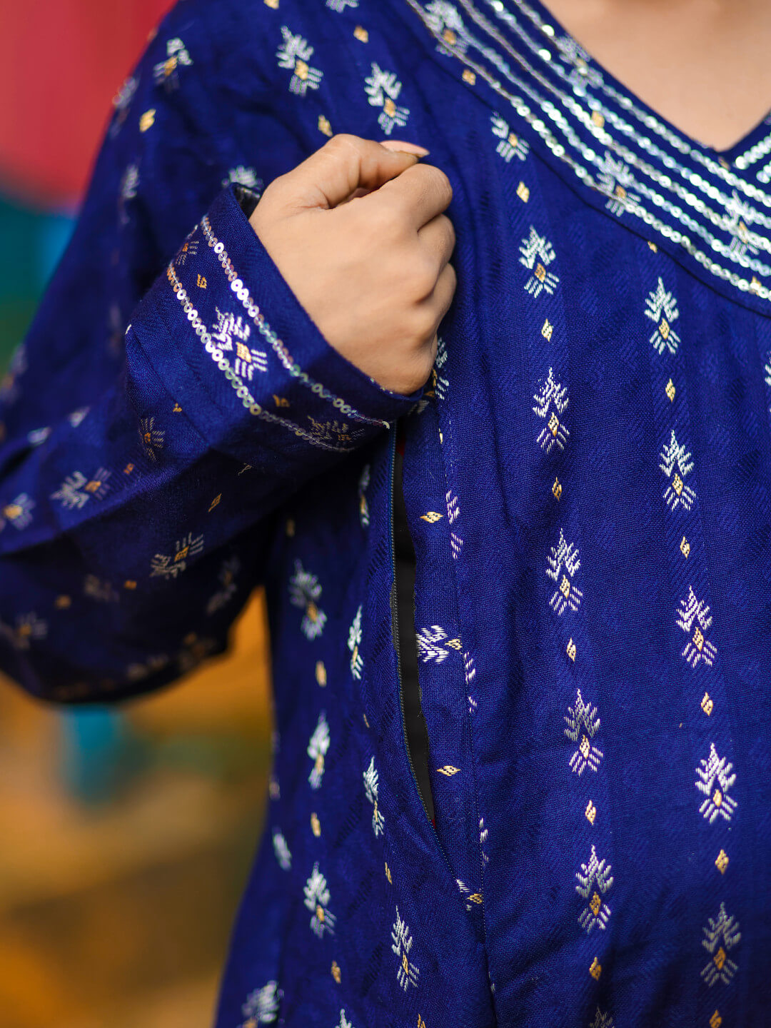 Navy Blue Woolen Zari Buti Maternity Feeding Flared Kurta Set
