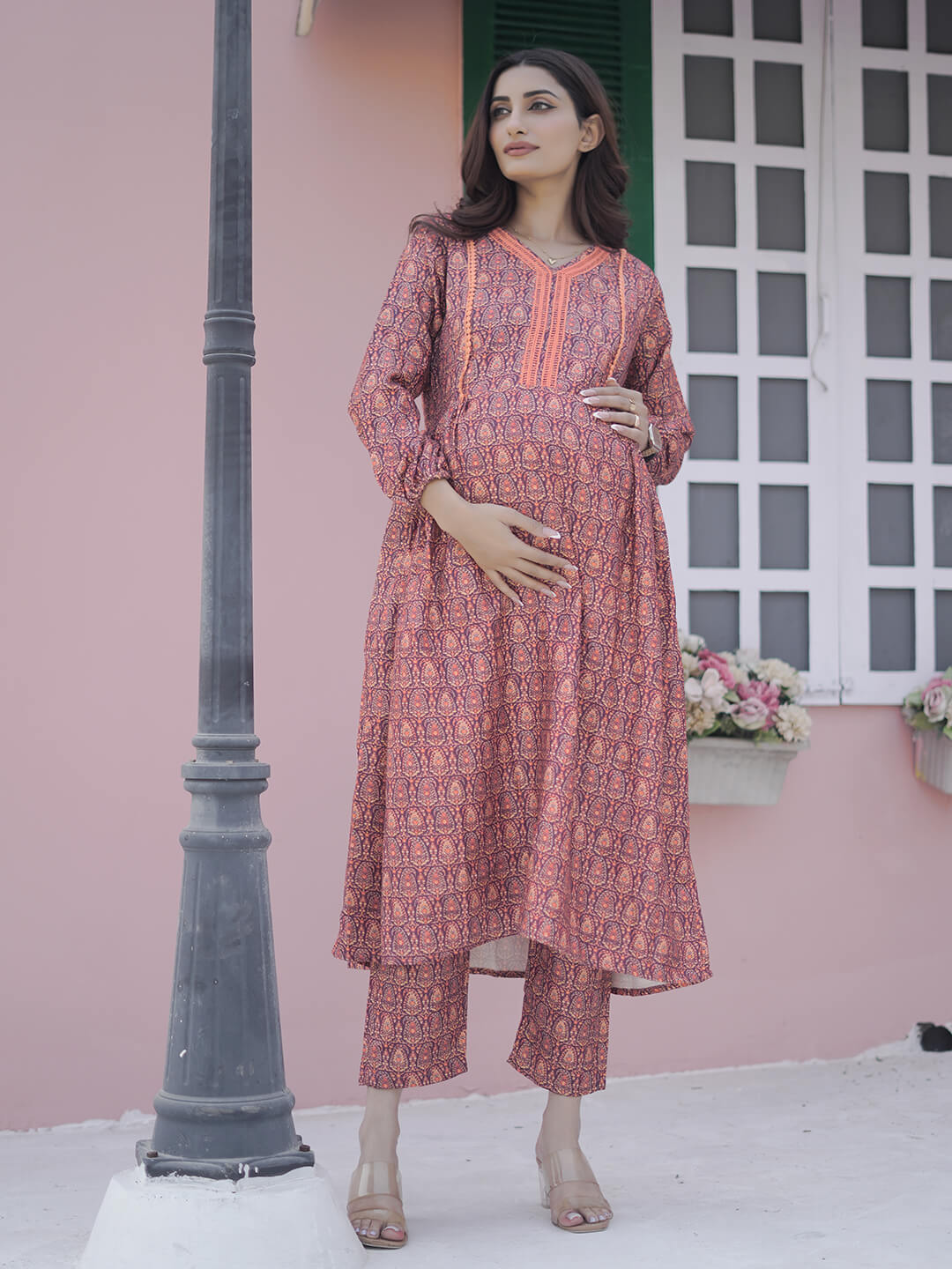 Peach Woolen Digital Printed Maternity Feeding Flared Kurta Set