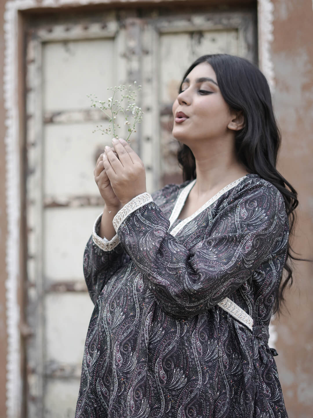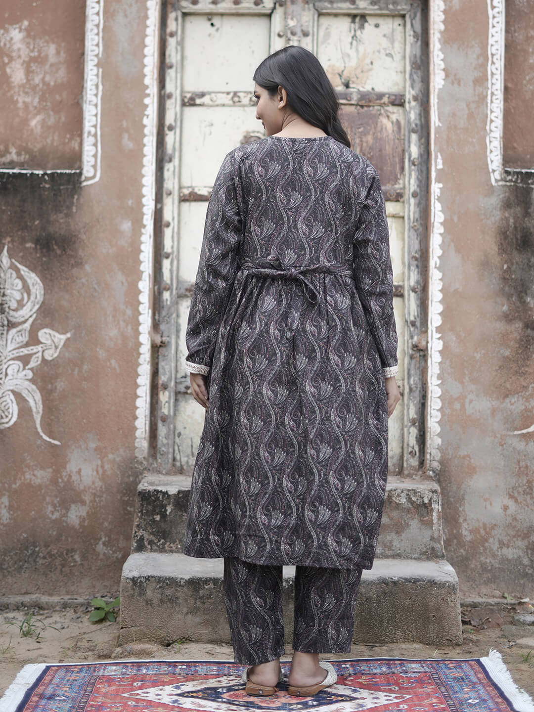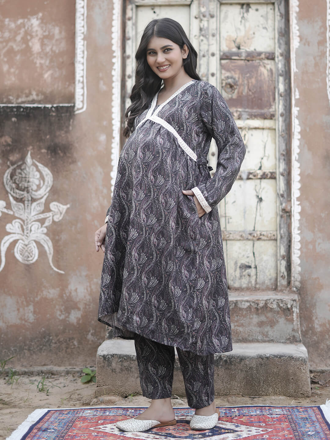 Black Woolen Digital Printed Maternity Feeding Flared Kurta Set