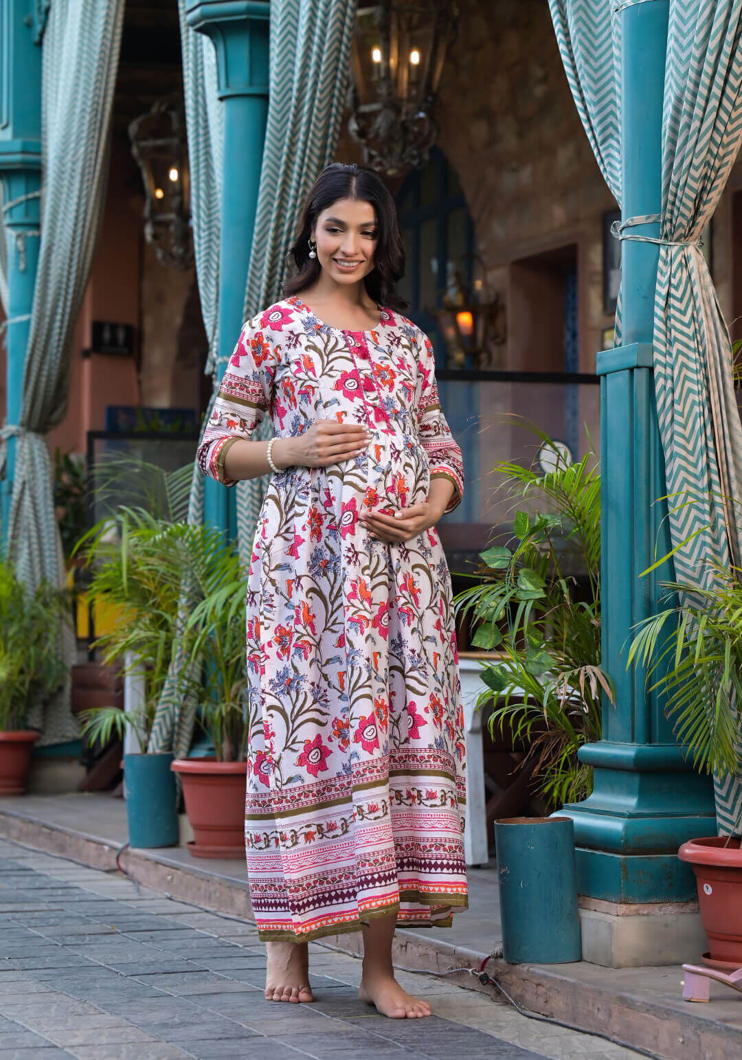 Pink Cotton Printed Front Zipper Maternity Feeding Kaftan
