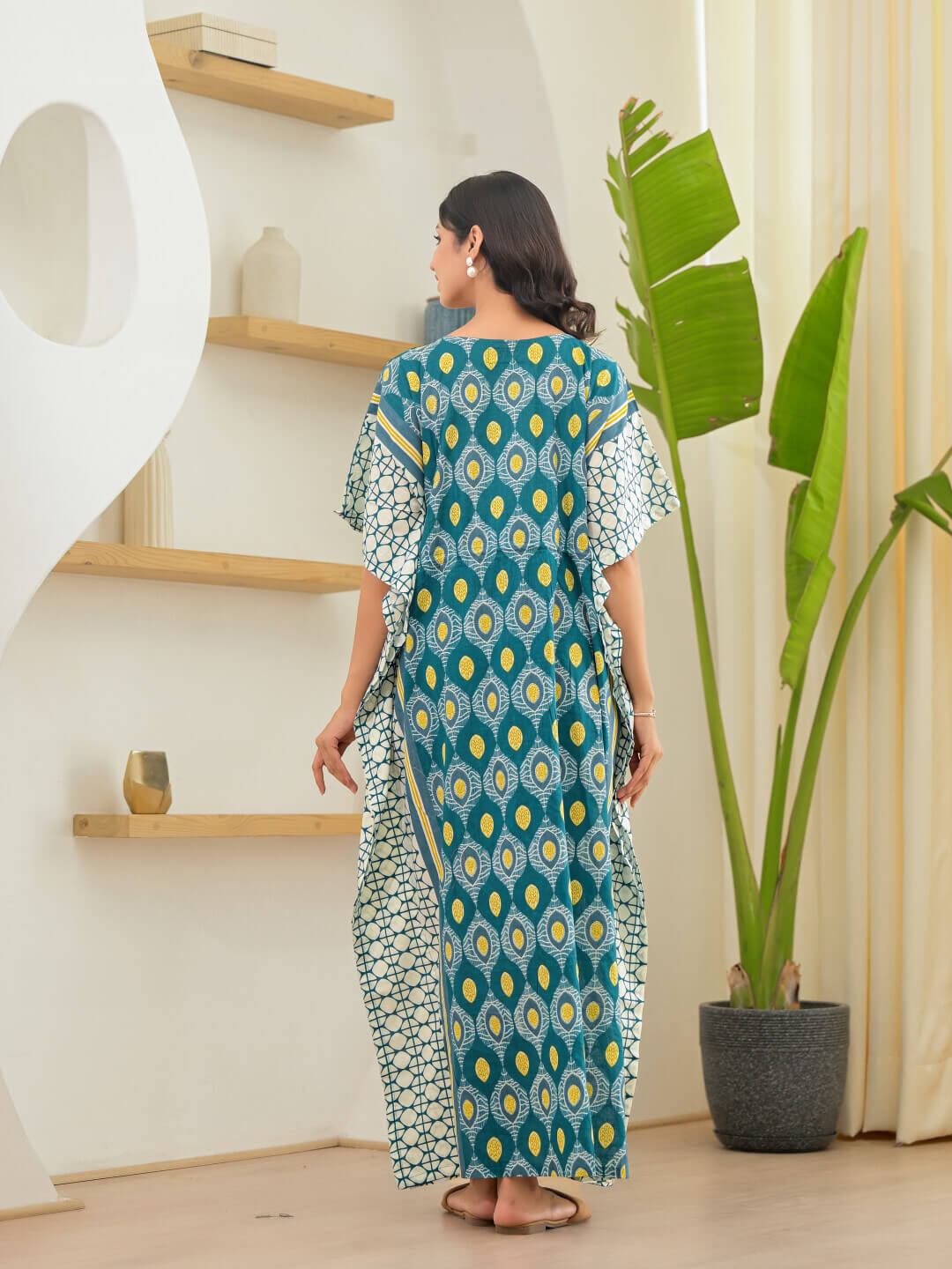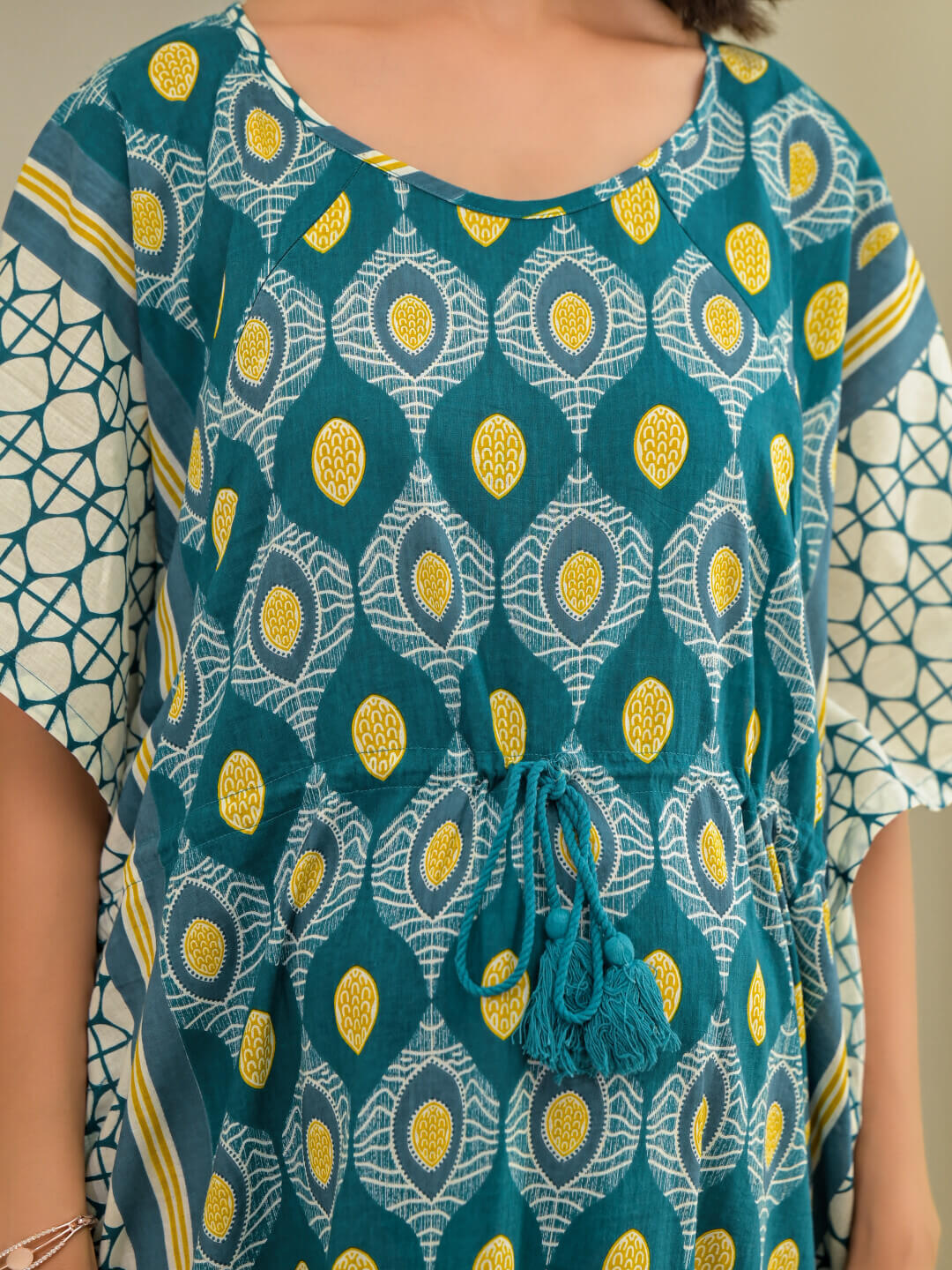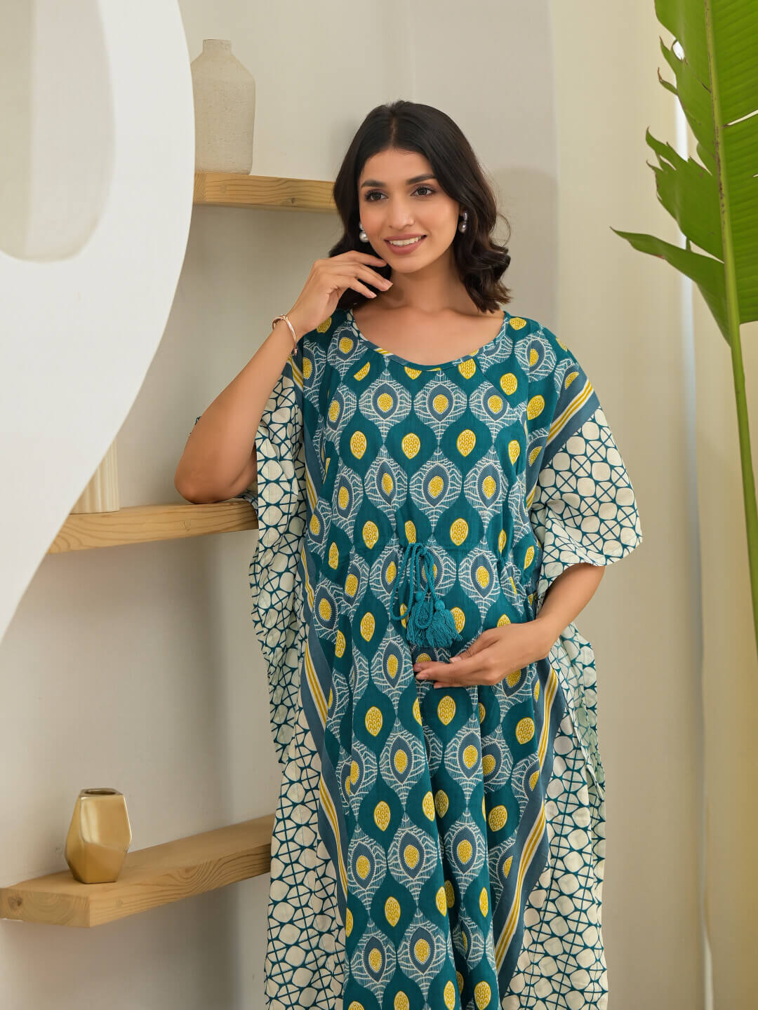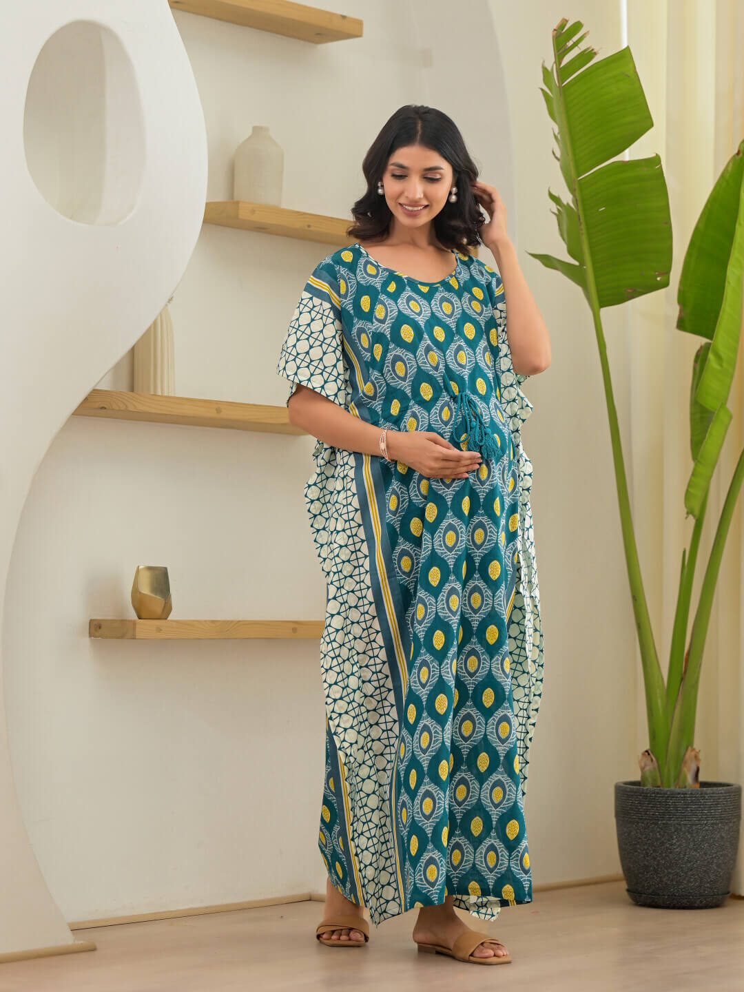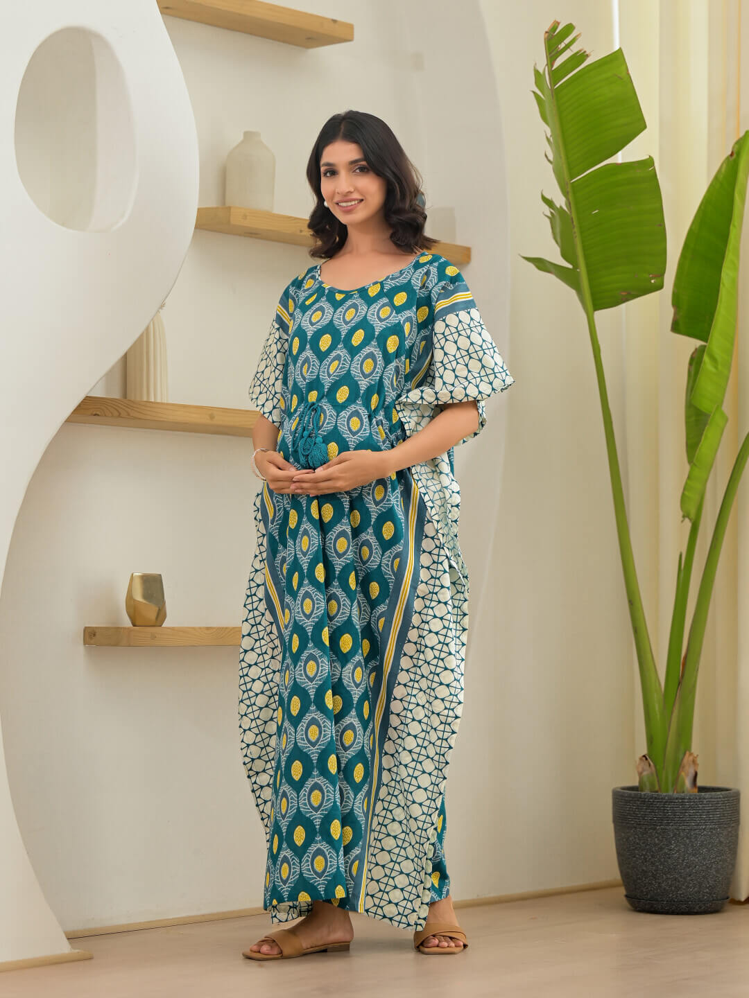 Teal White Printed Front Zipper Maternity Feeding Kaftan