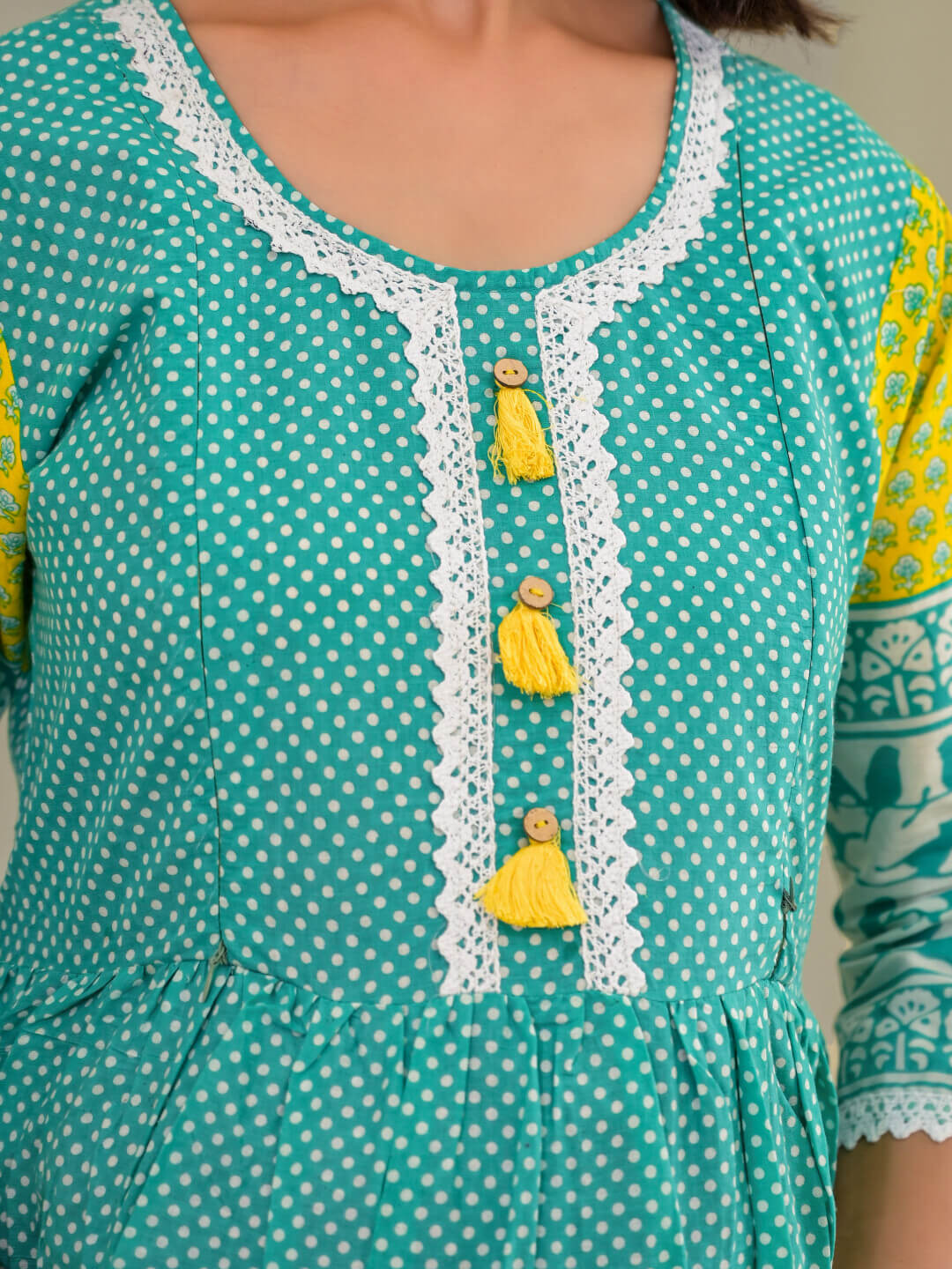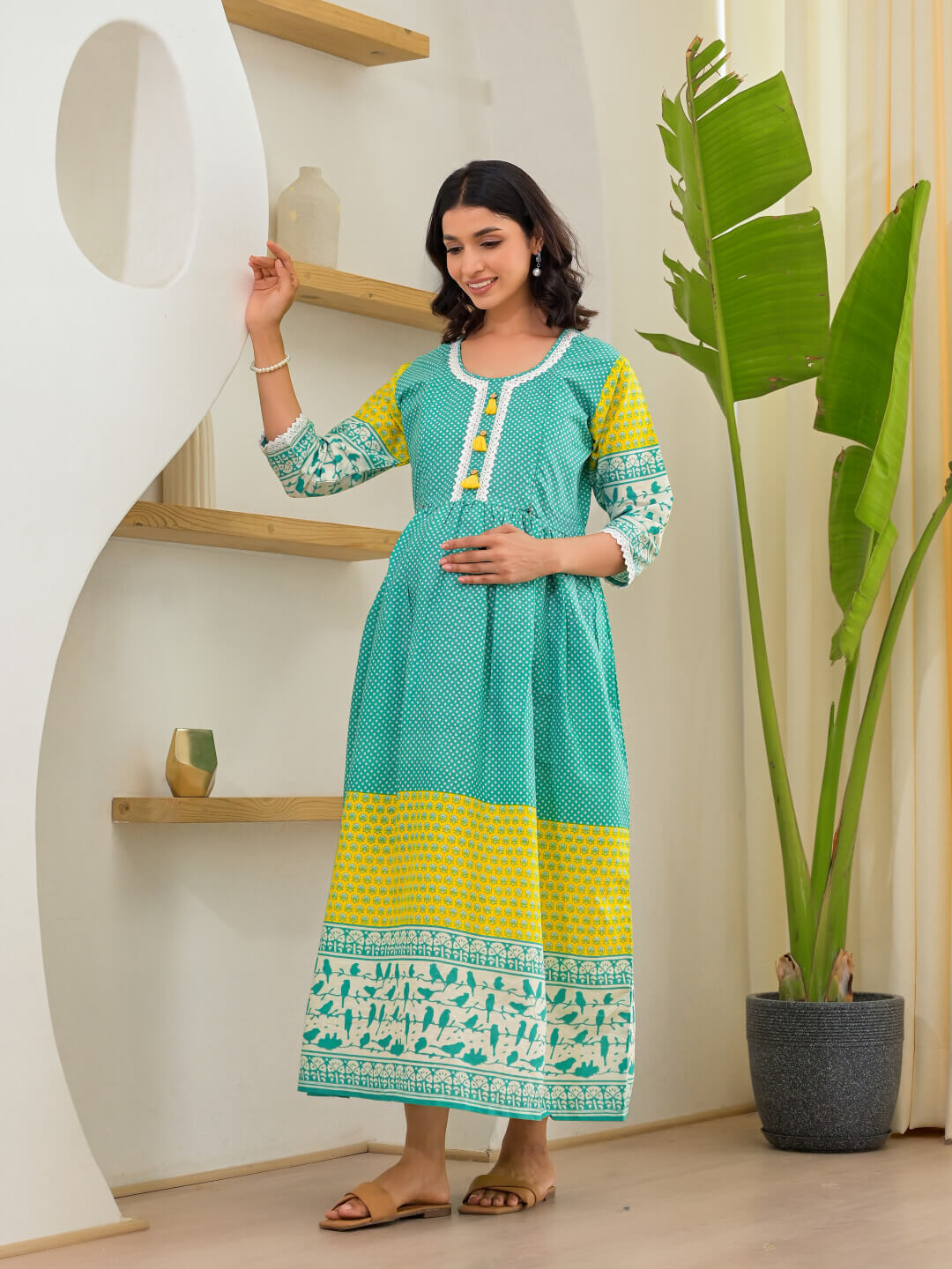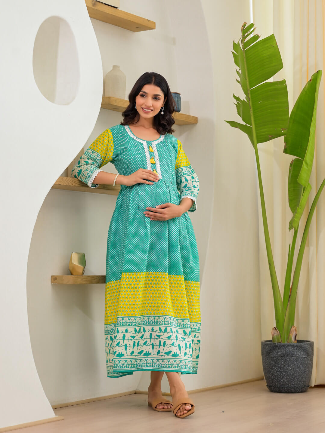 Sea Green Yellow Printed Maternity Feeding Flared Dress