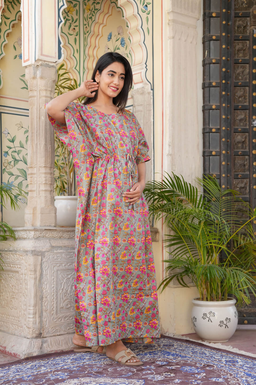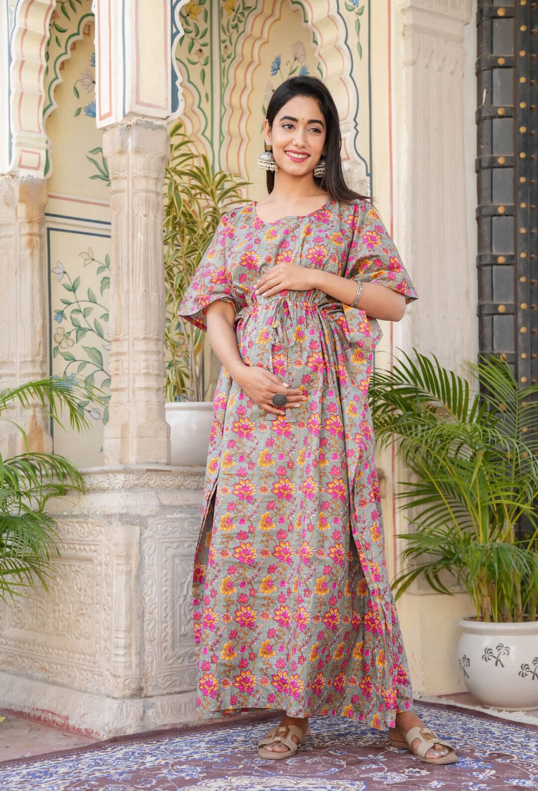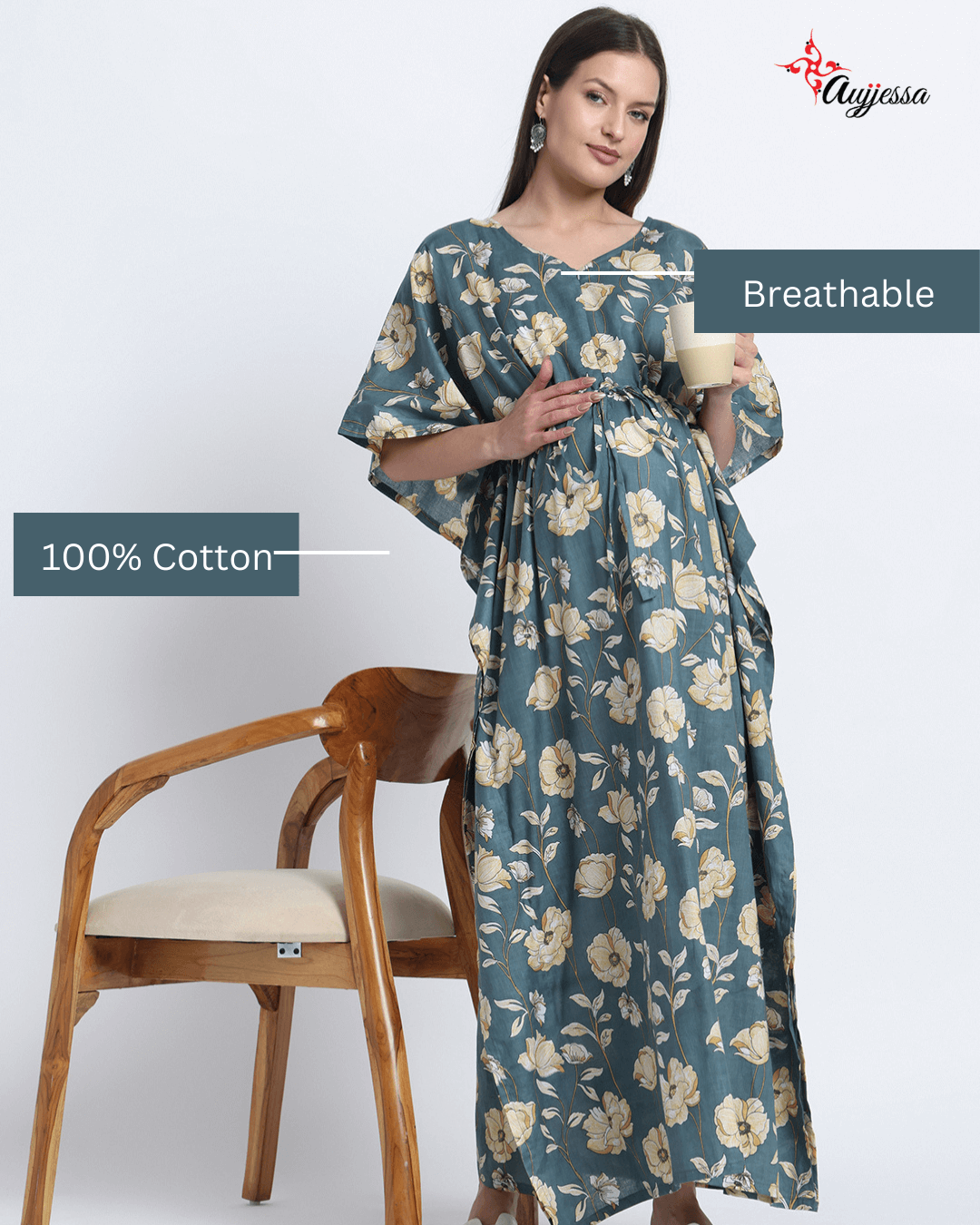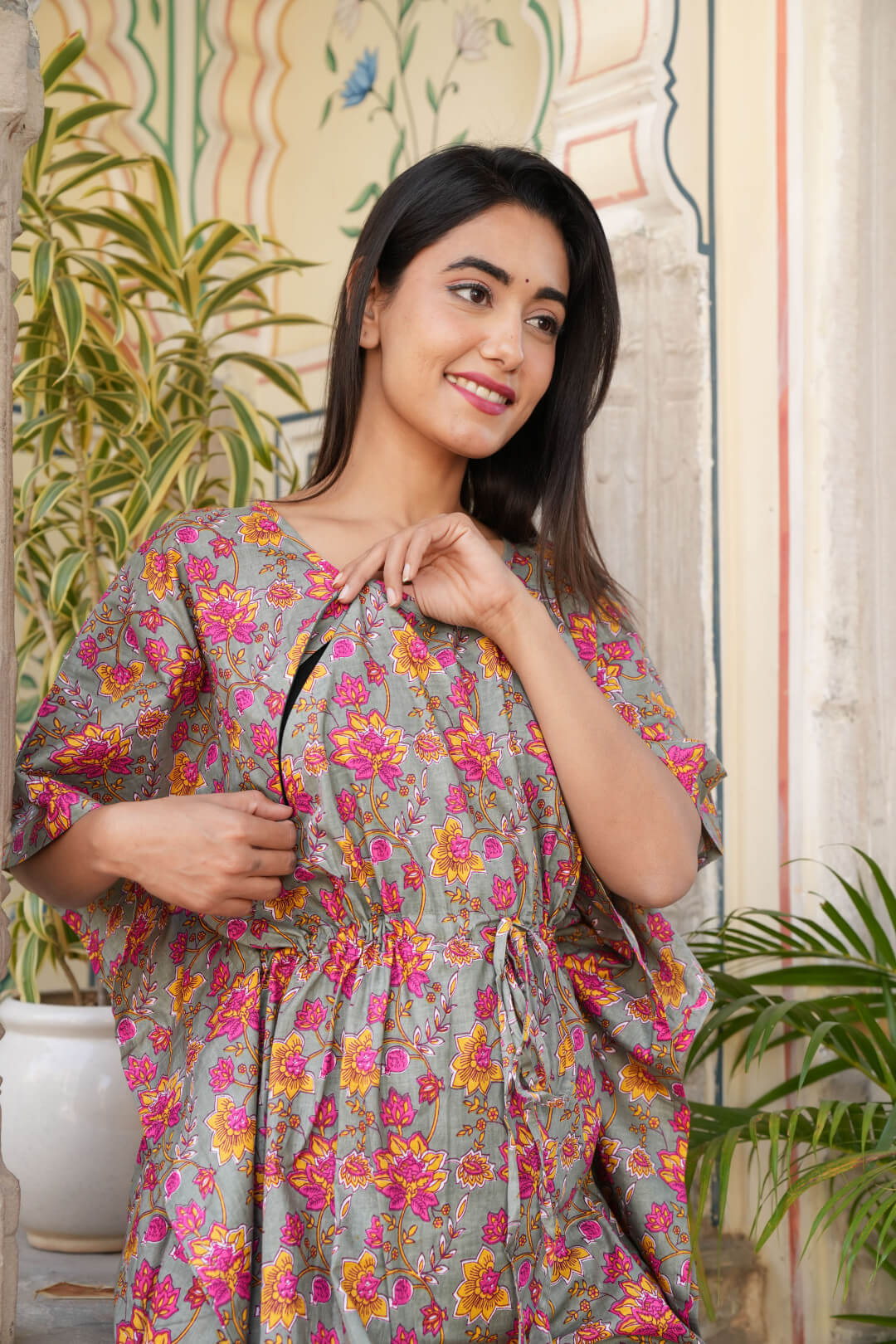 Light Grey Cotton Printed Maternity Front Zipper Feeding Kaftan