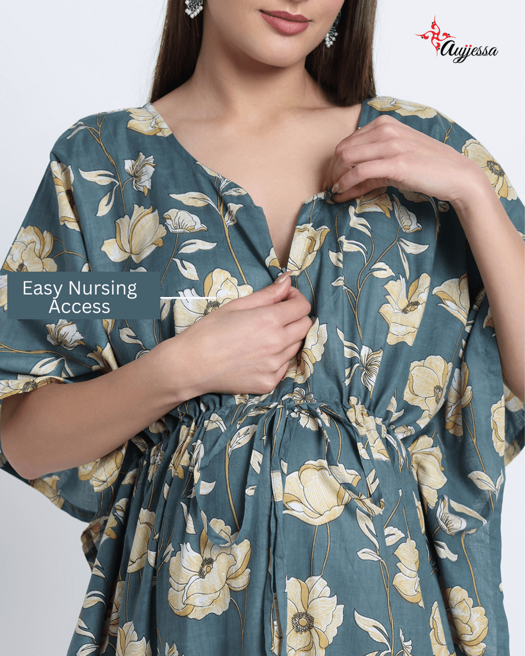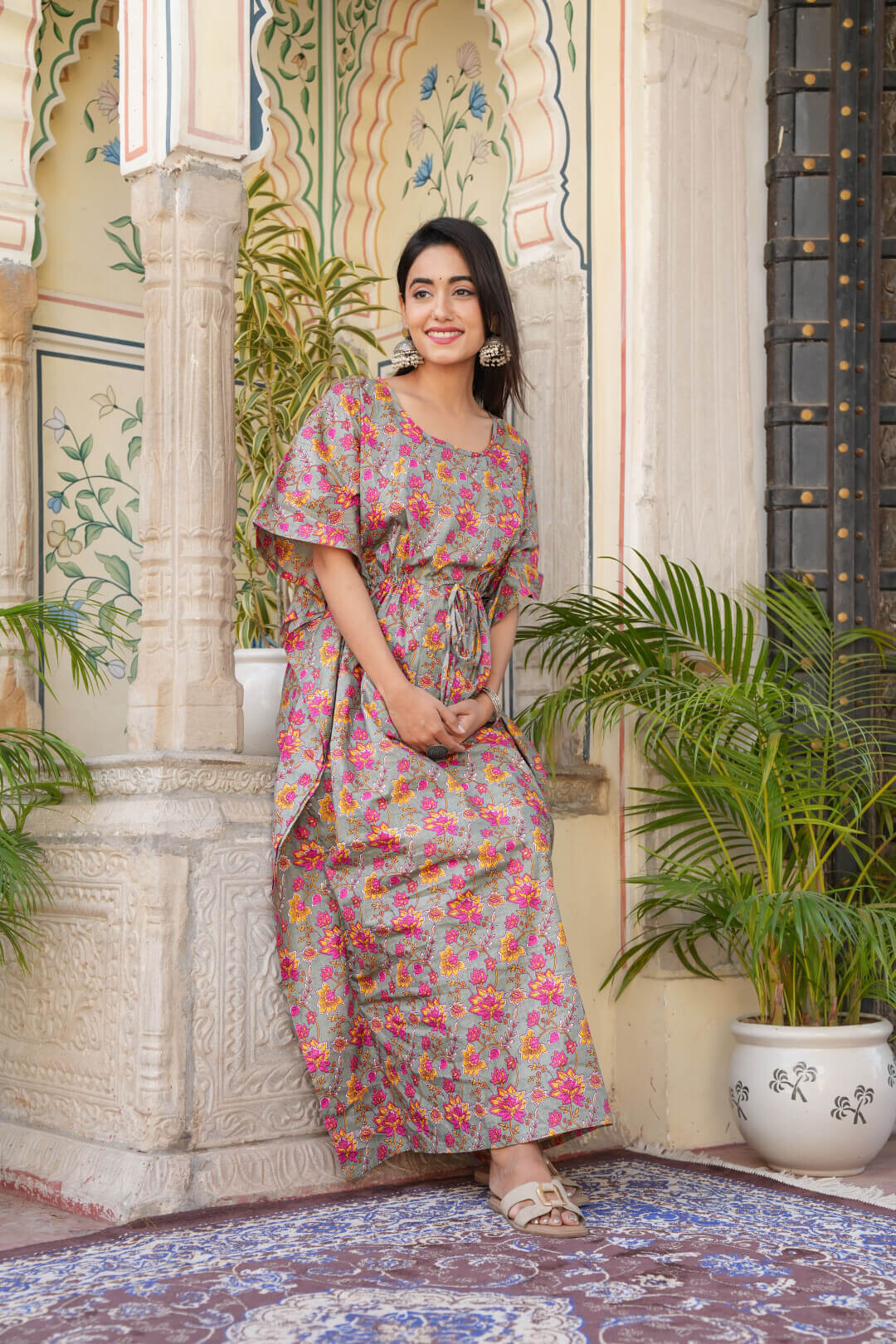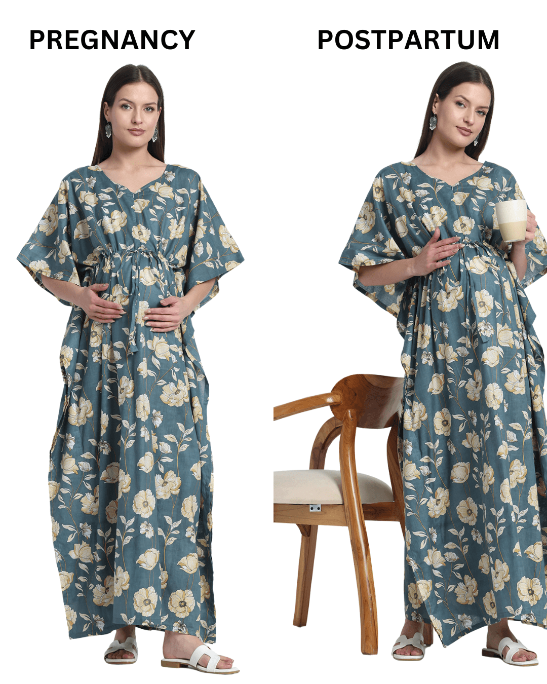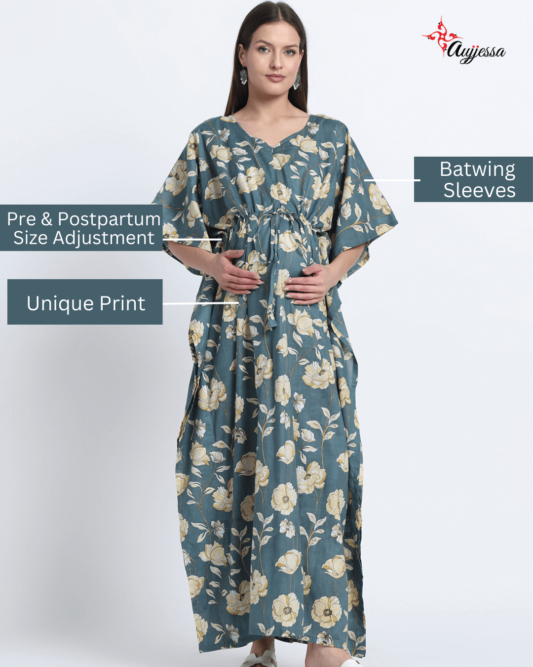 Light Grey Cotton Printed Maternity Front Zipper Feeding Kaftan