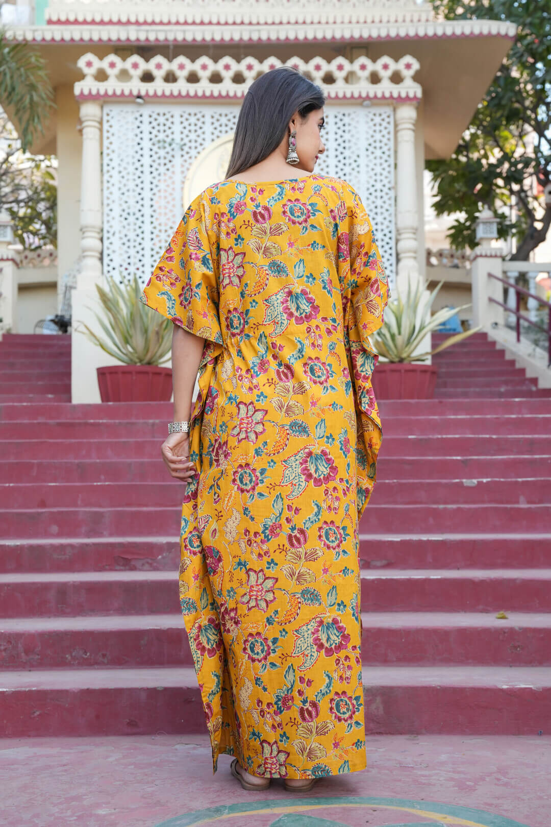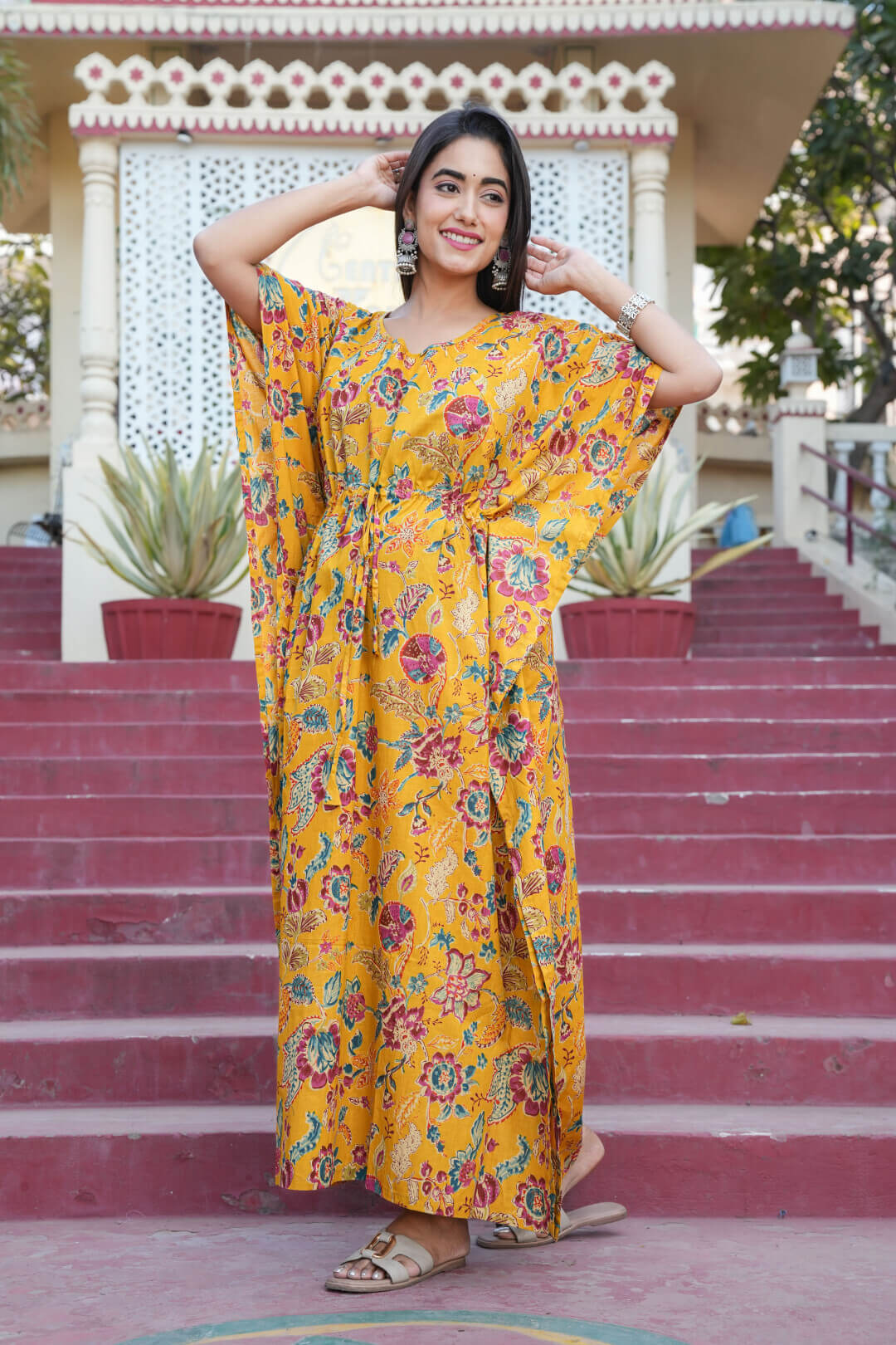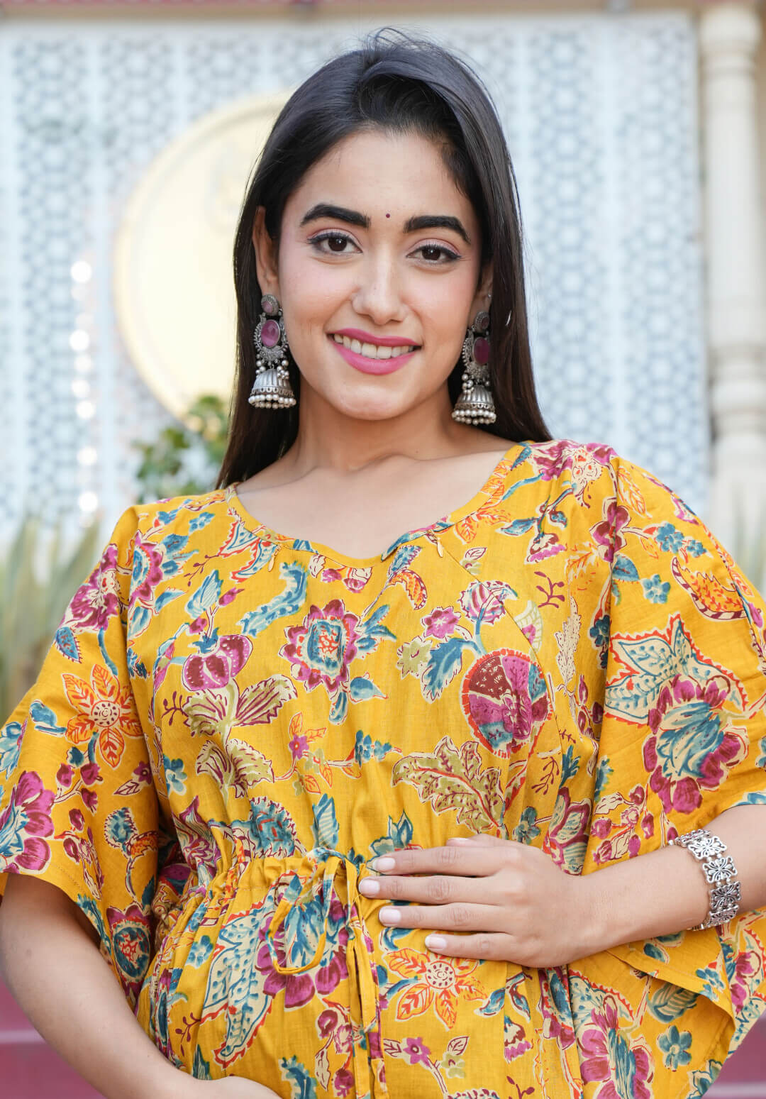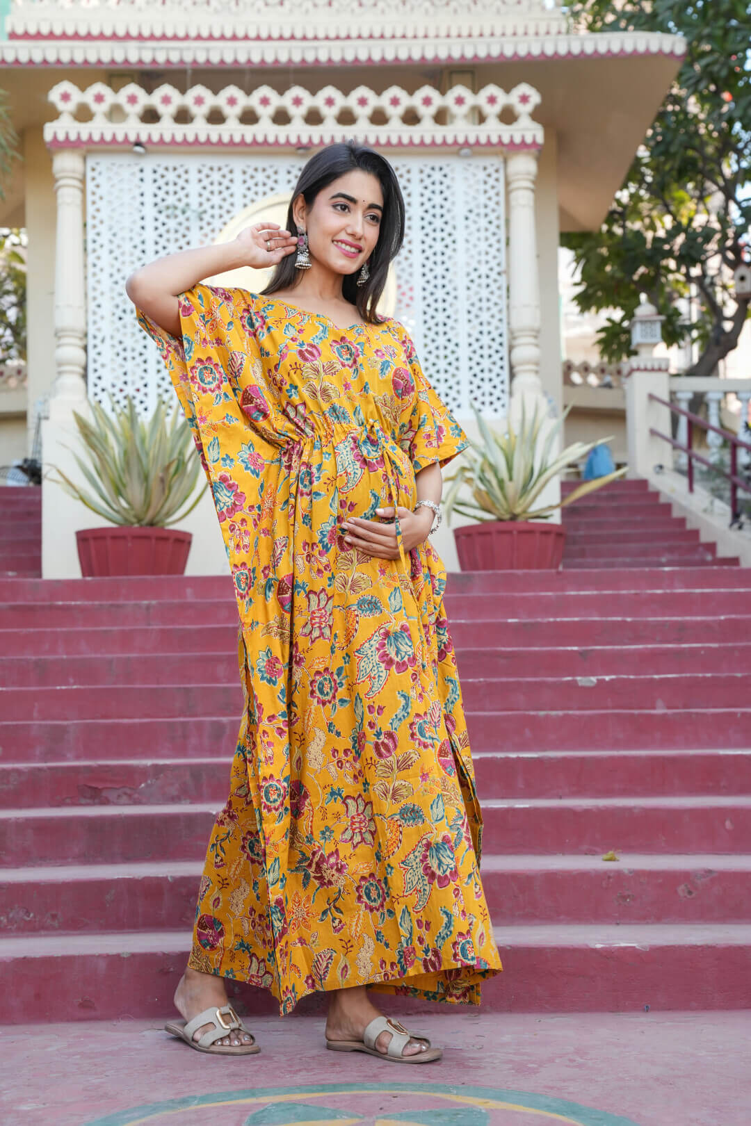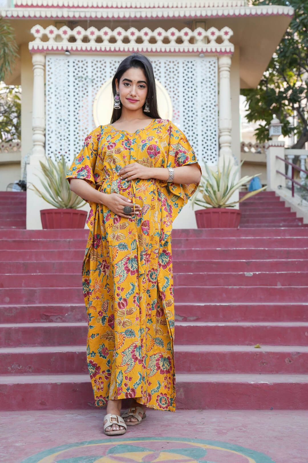 Mustard Multi Cotton Printed Maternity Front Zipper Feeding Kaftan