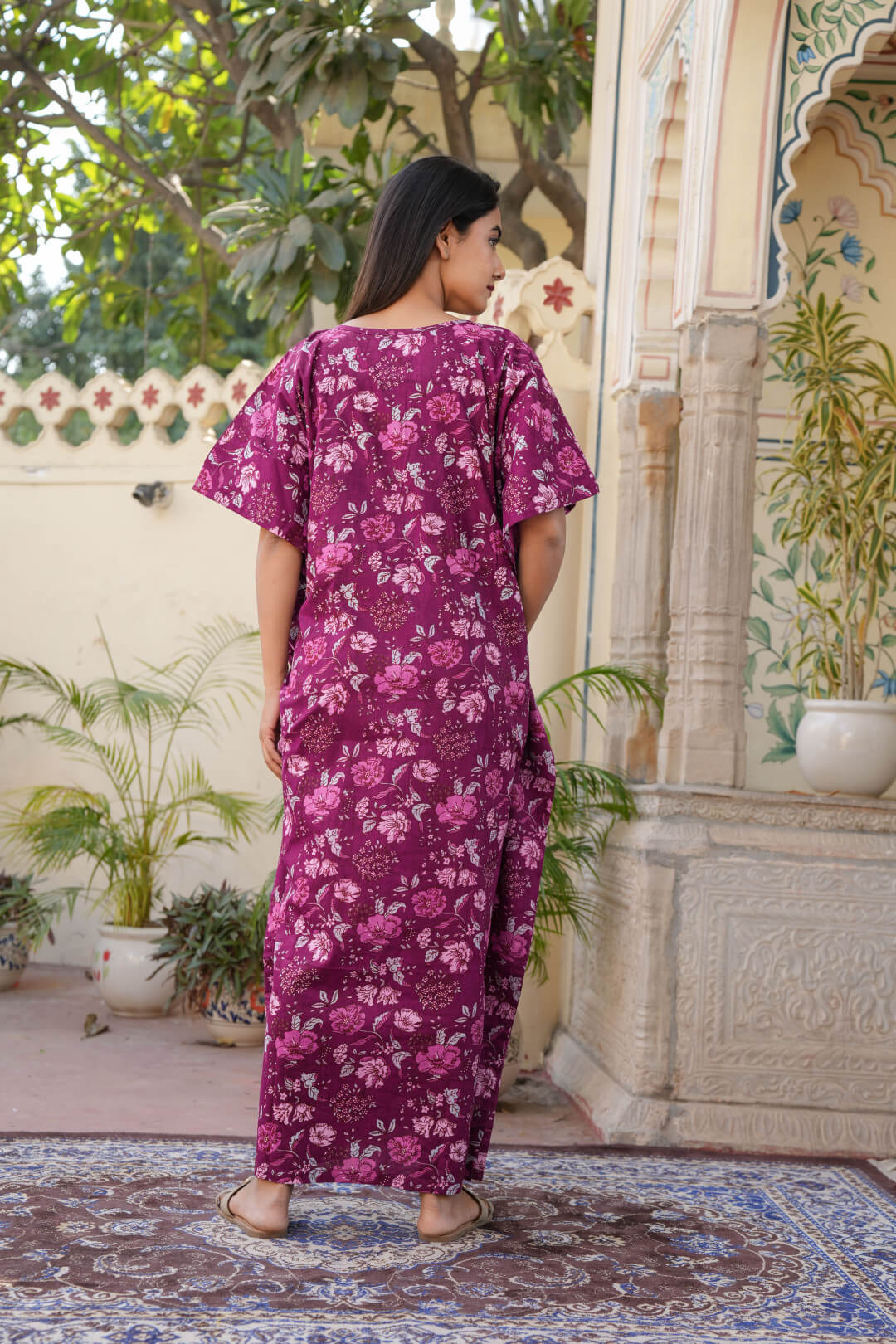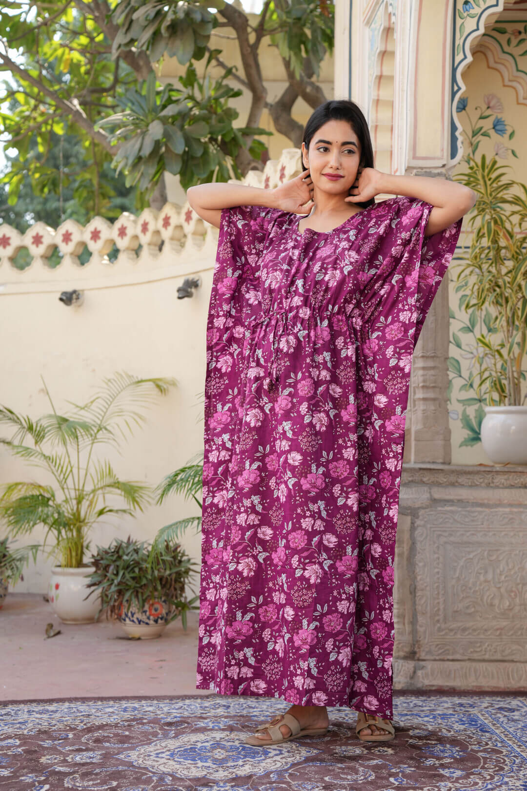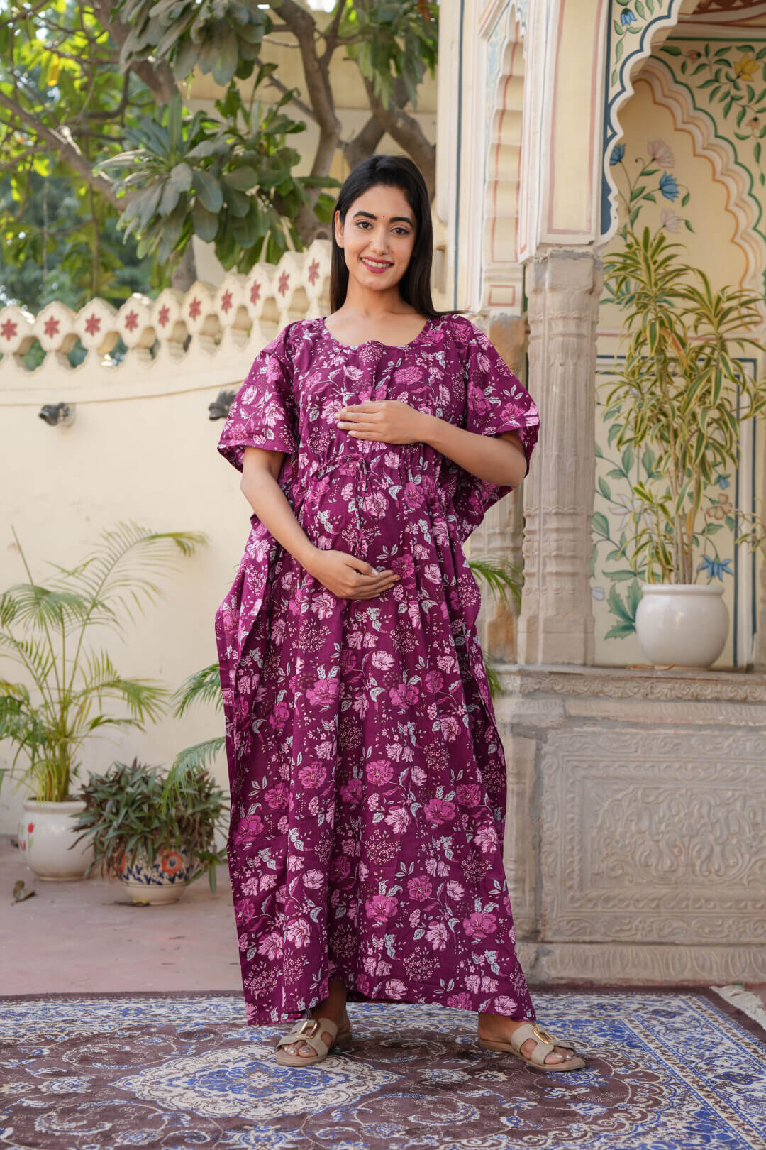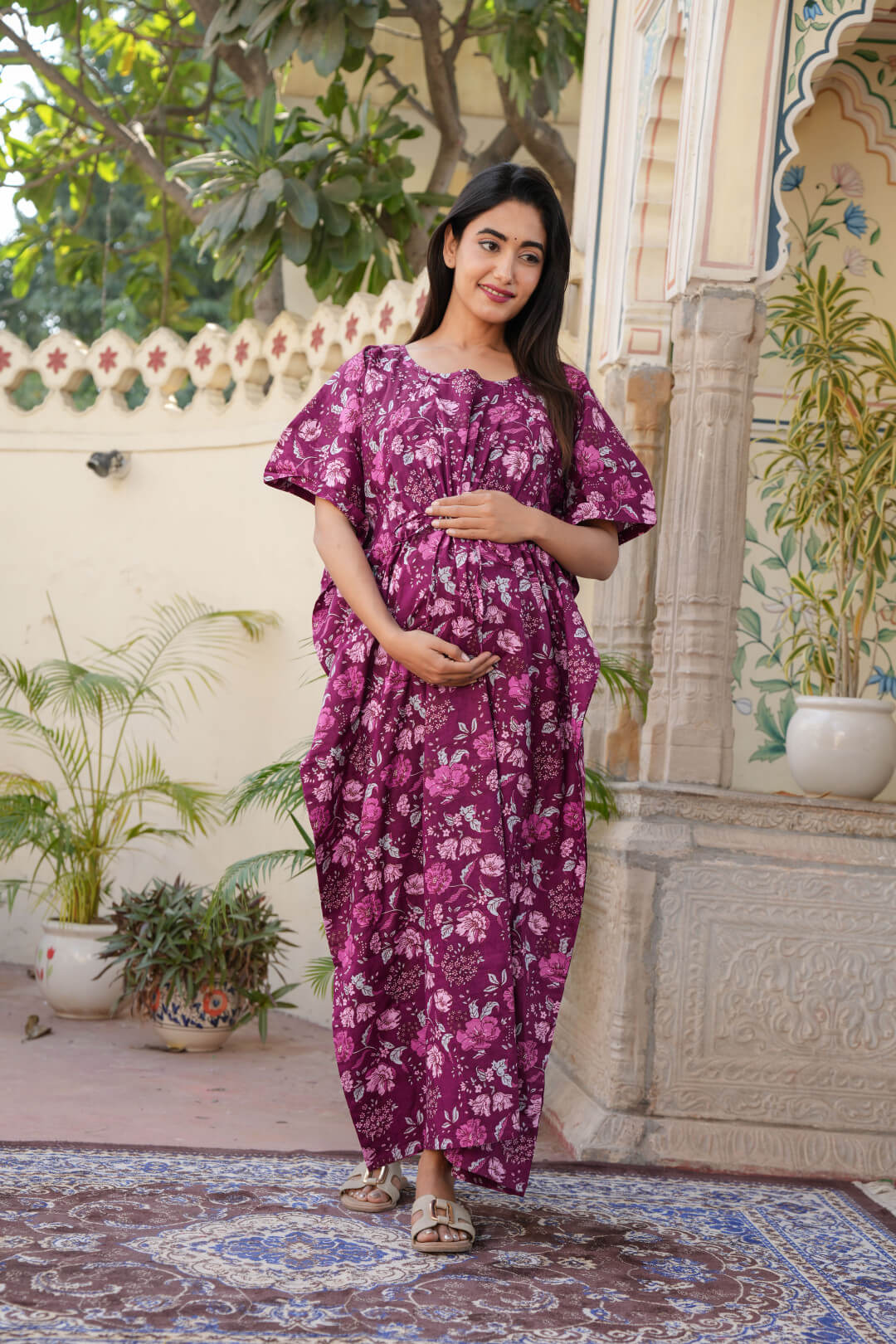 Purple Printed Front Zipper Maternity Feeding Kaftan