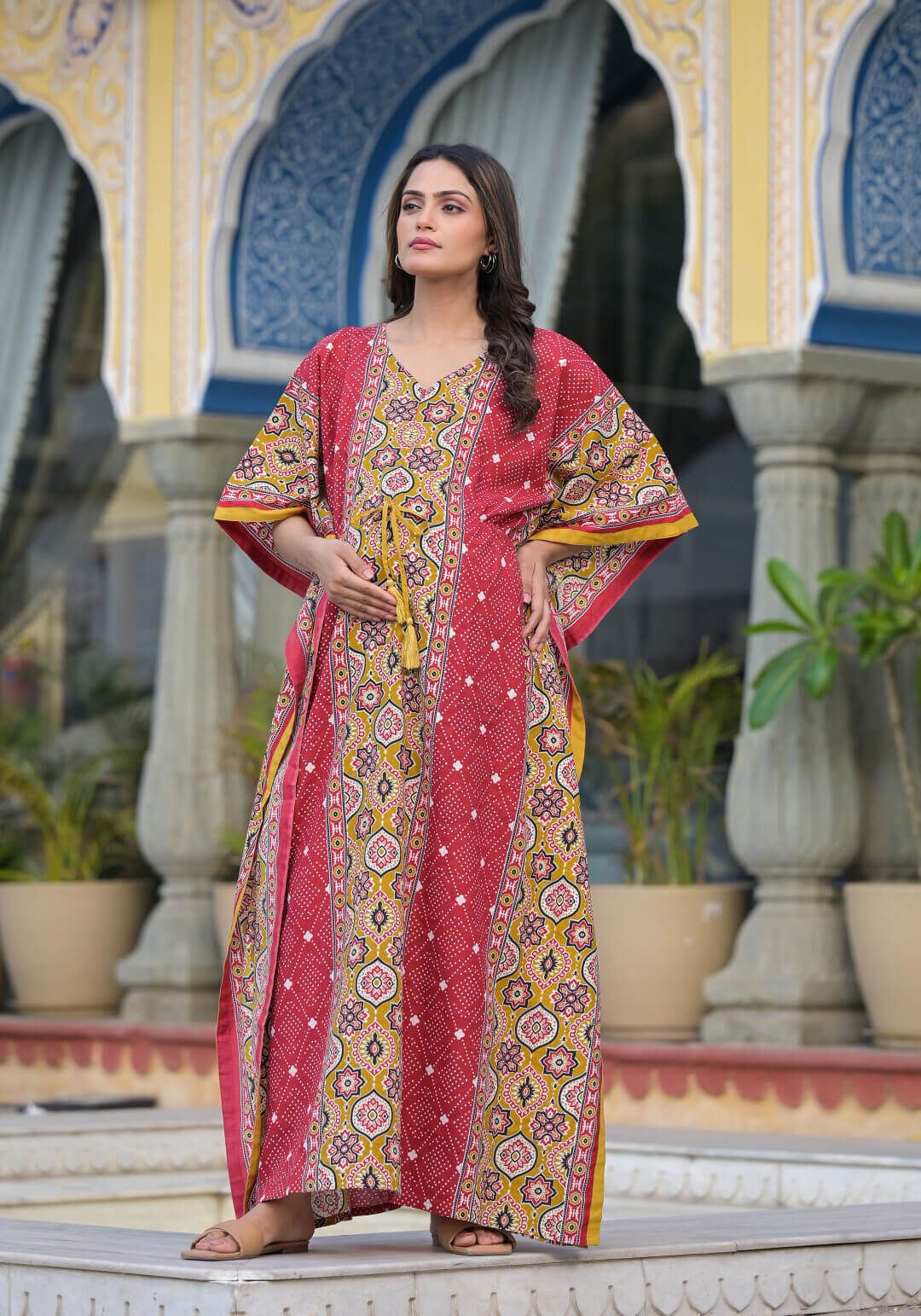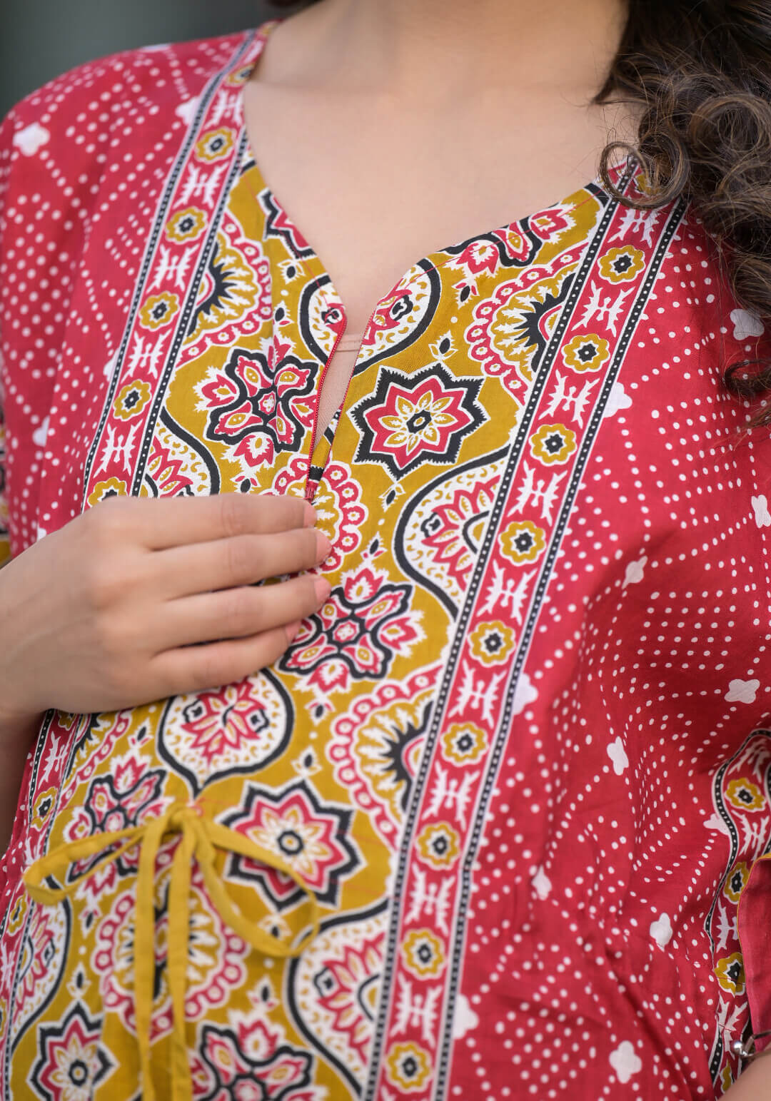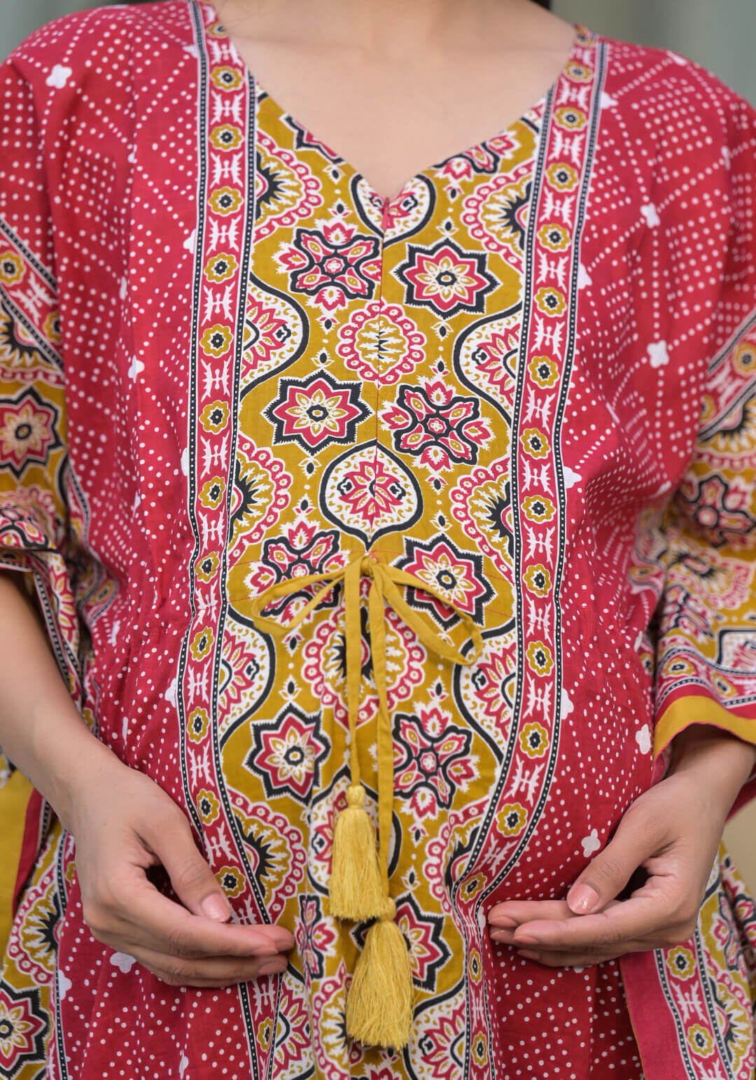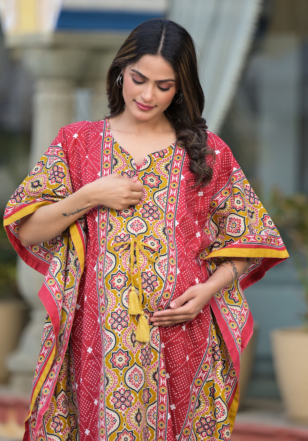 Red Mustard Printed Front Zipper Maternity Feeding Kaftan