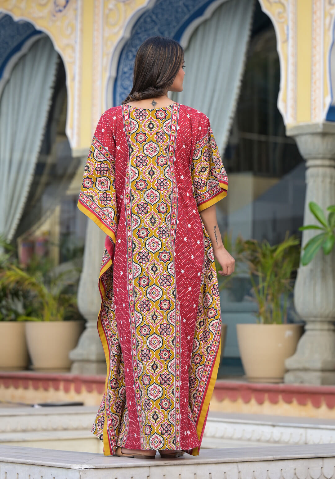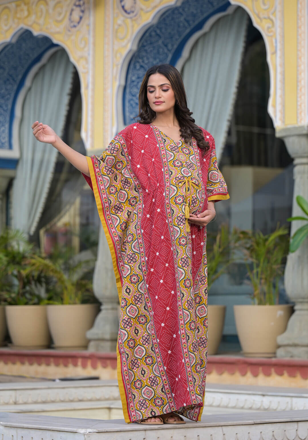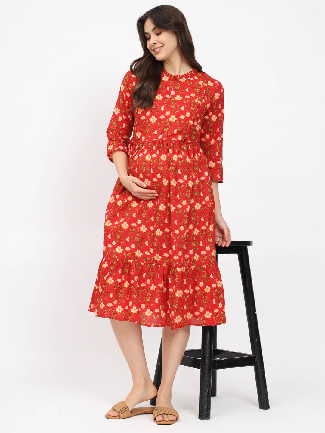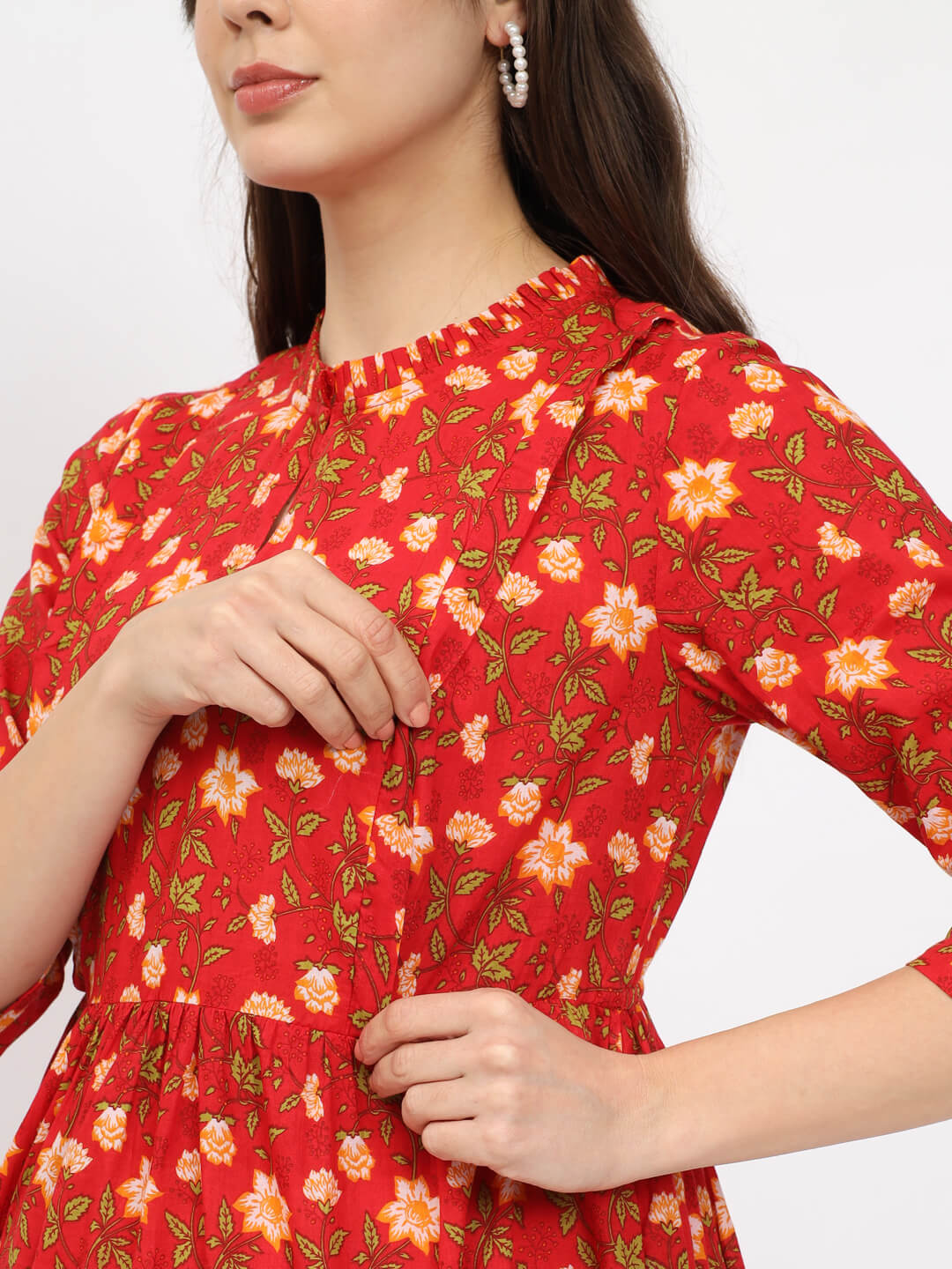 Red Mustard Printed Front Zipper Maternity Feeding Kaftan