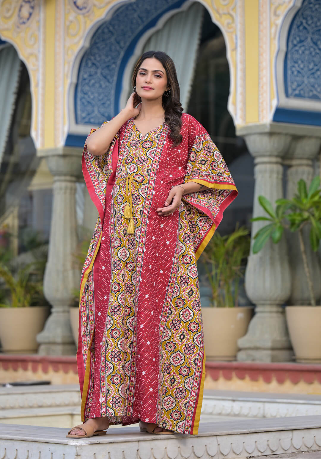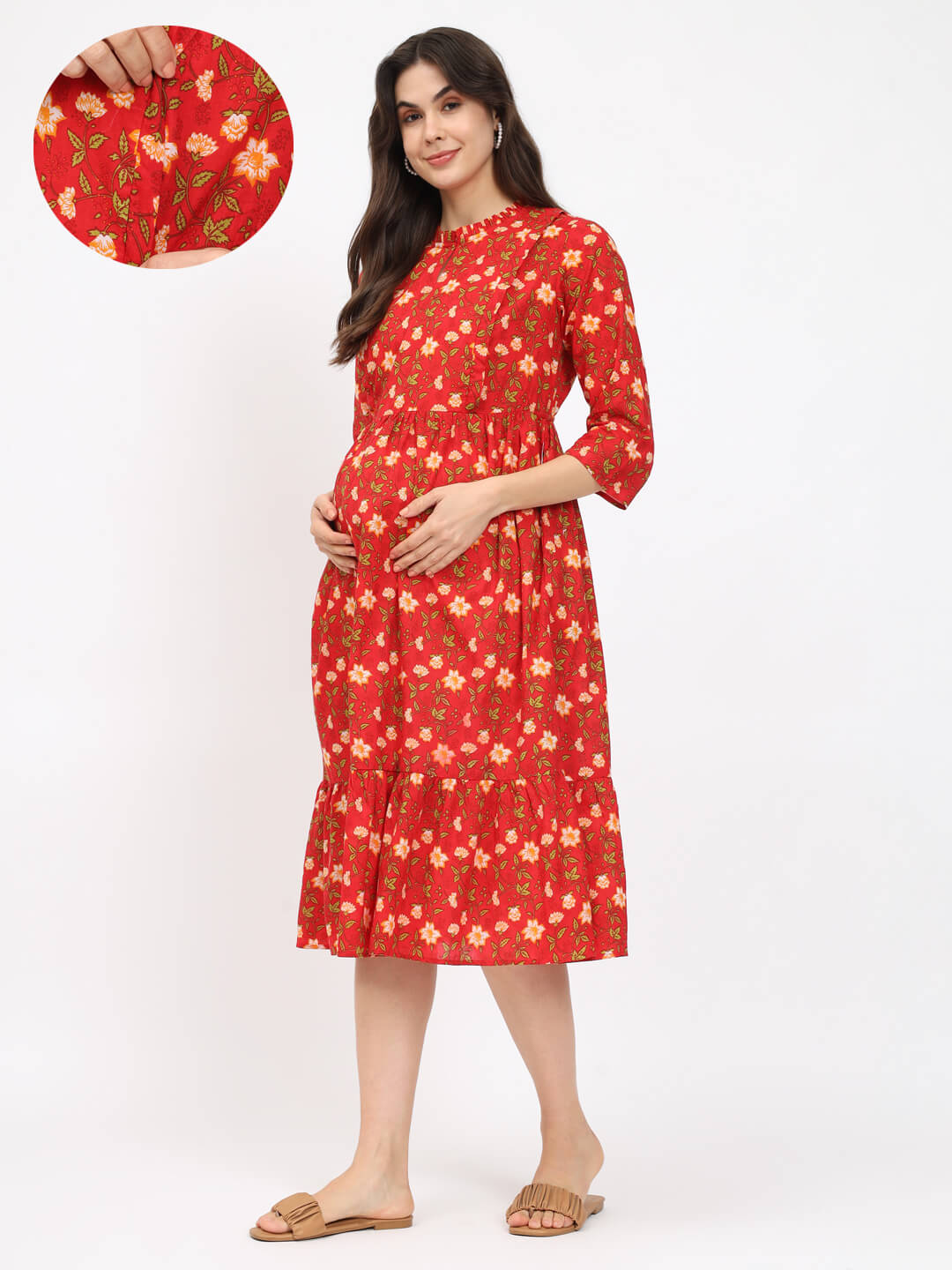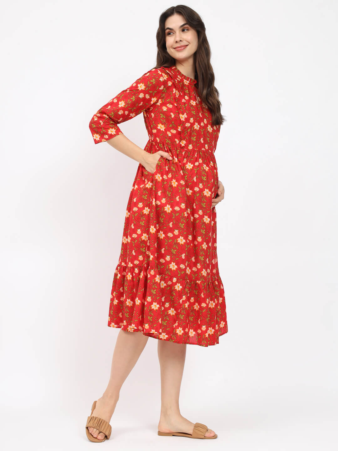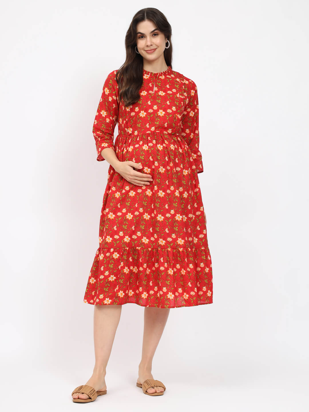 Red Mustard Printed Front Zipper Maternity Feeding Kaftan