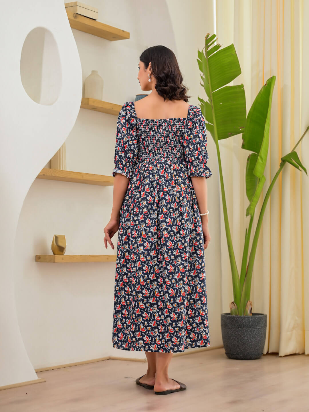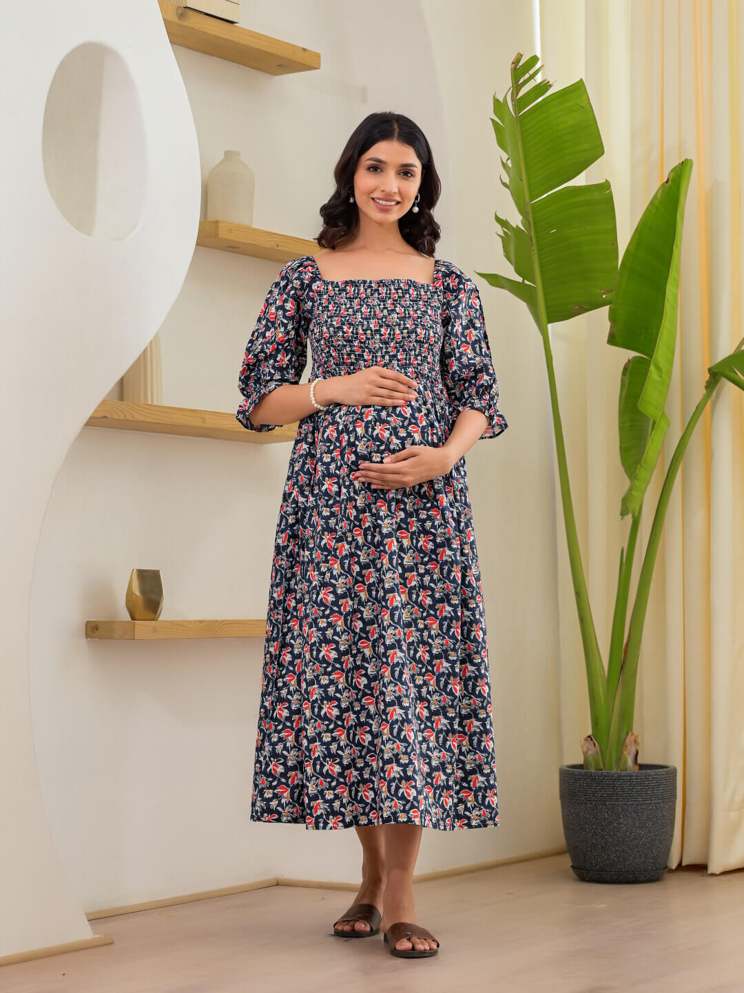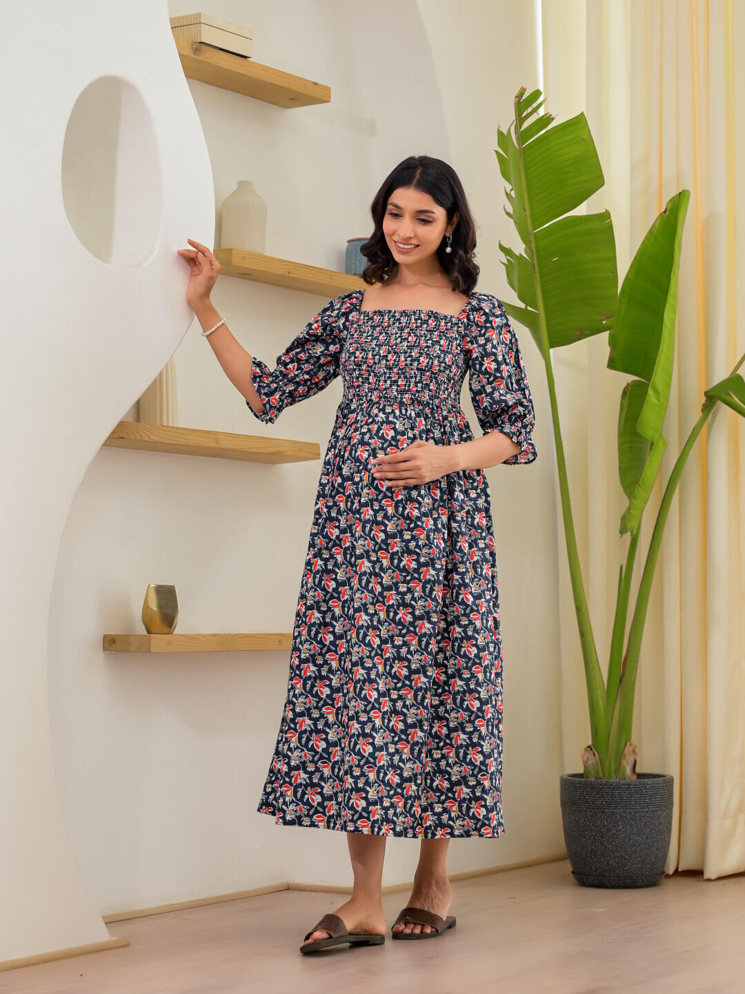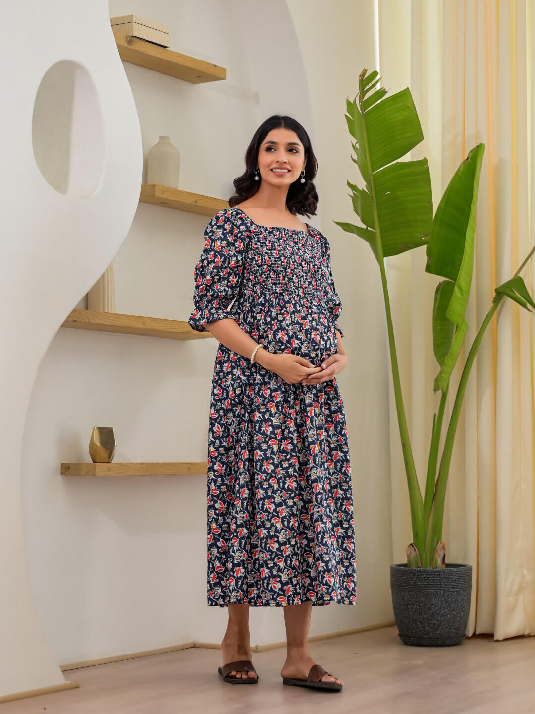 Red Mustard Printed Front Zipper Maternity Feeding Kaftan