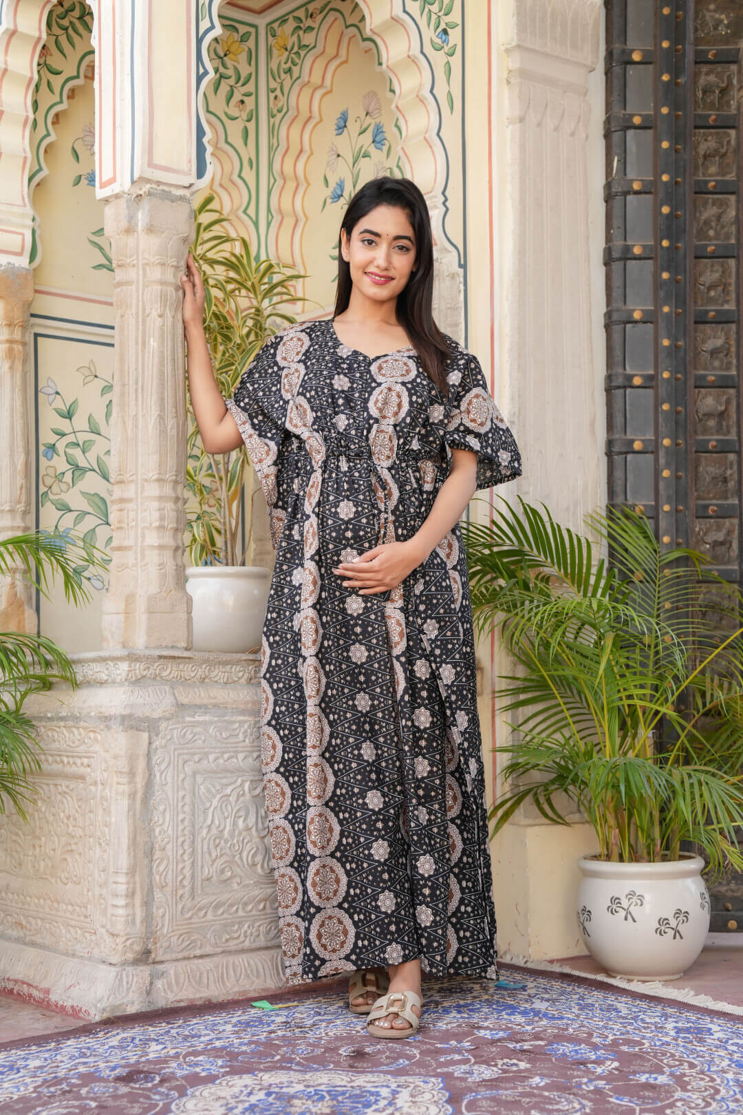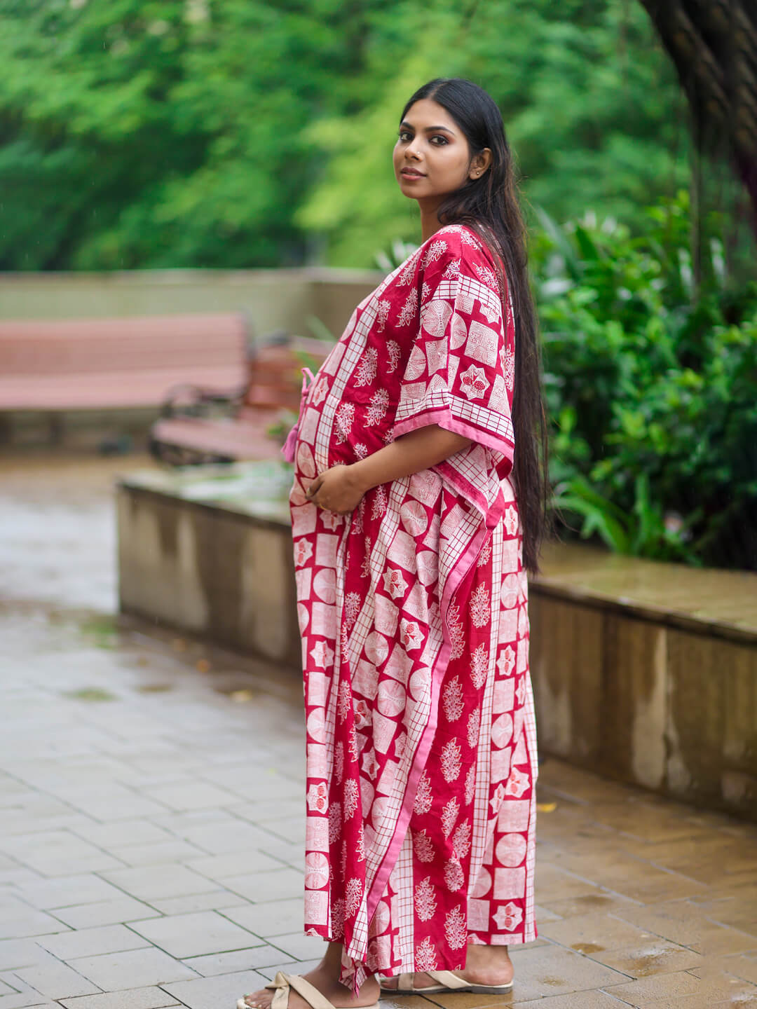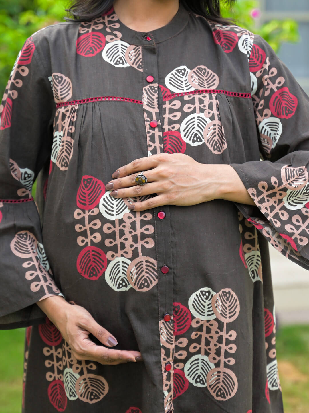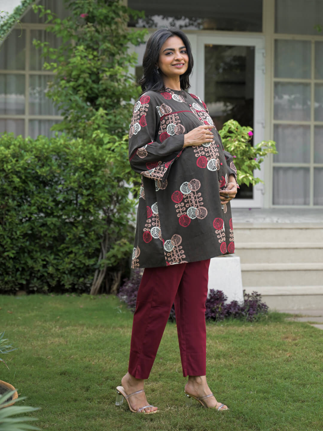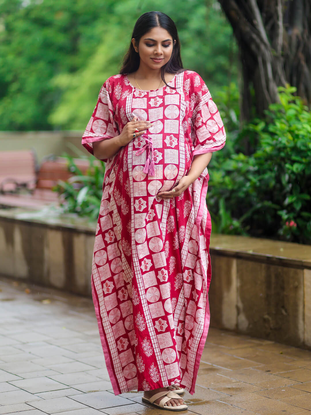 Maroon Printed Front Zipper Maternity Feeding Kaftan