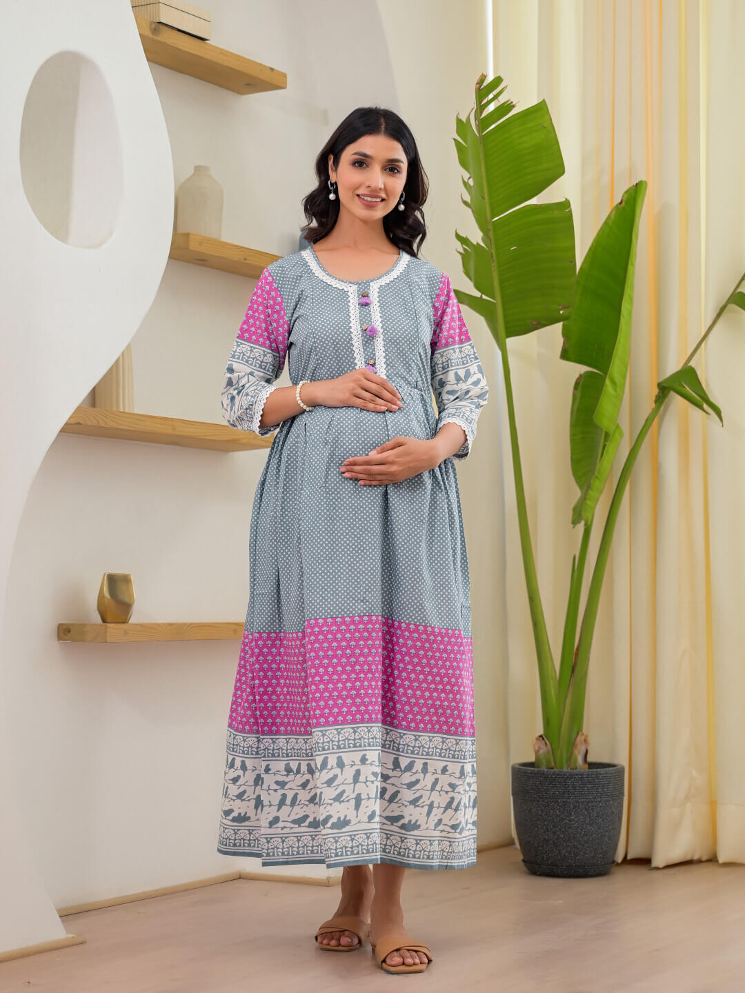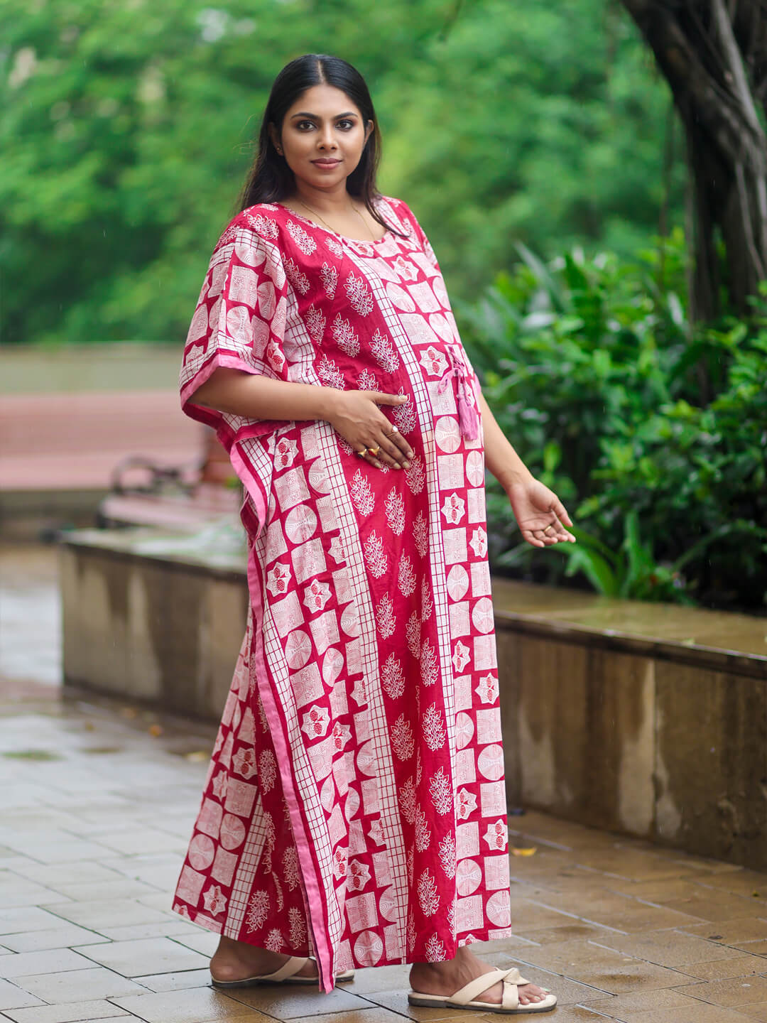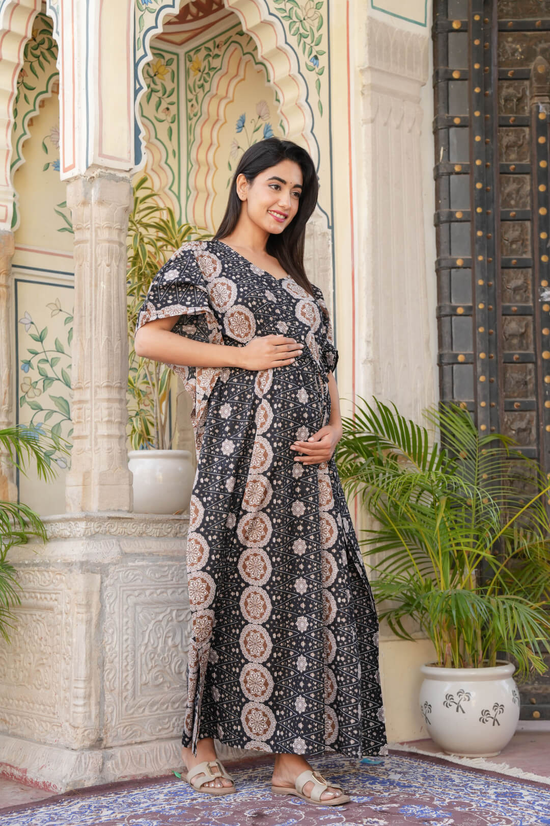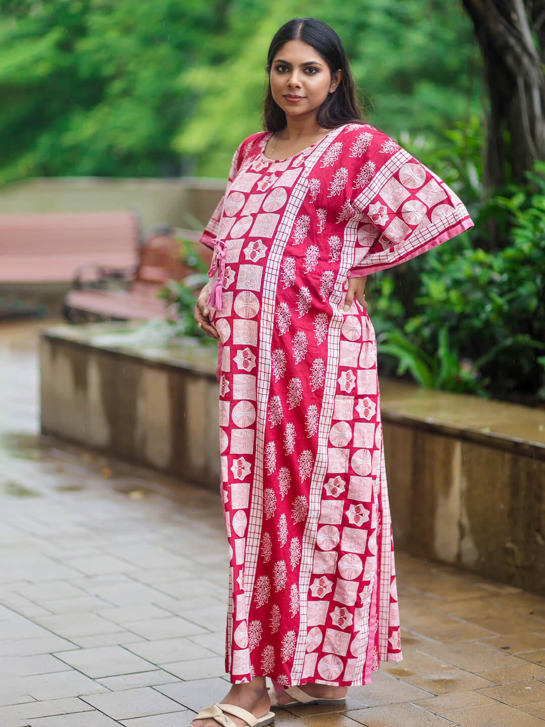 Maroon Printed Front Zipper Maternity Feeding Kaftan