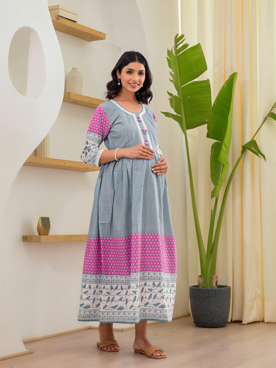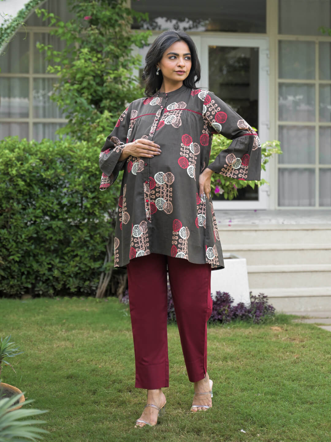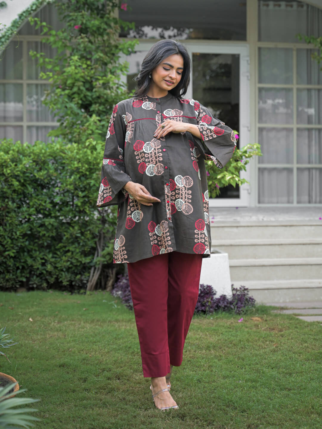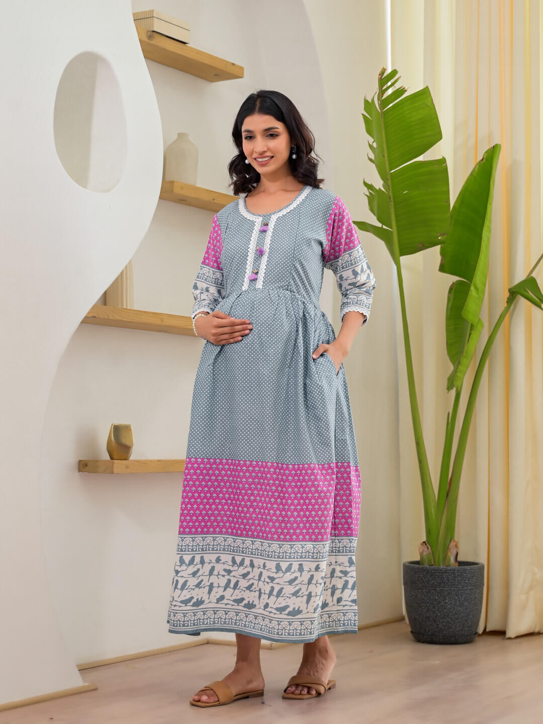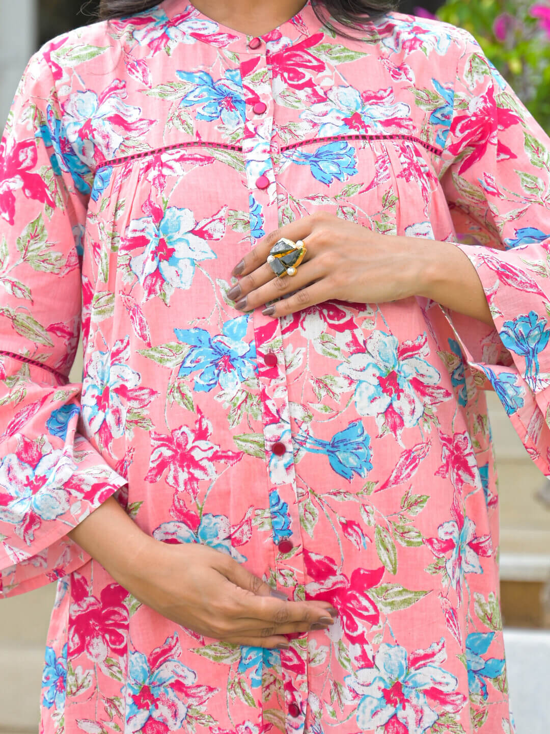Maroon Printed Front Zipper Maternity Feeding Kaftan